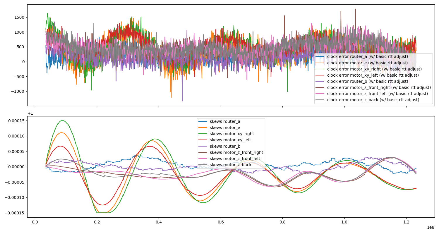 One of the key services that OSAP provides is clock synchronization, which is used as a basis for motion control and for time-series data collection (to build models). Since other clock sync algorithms are complex and consume large amounts of program memory, I developed a simple version from scratch.