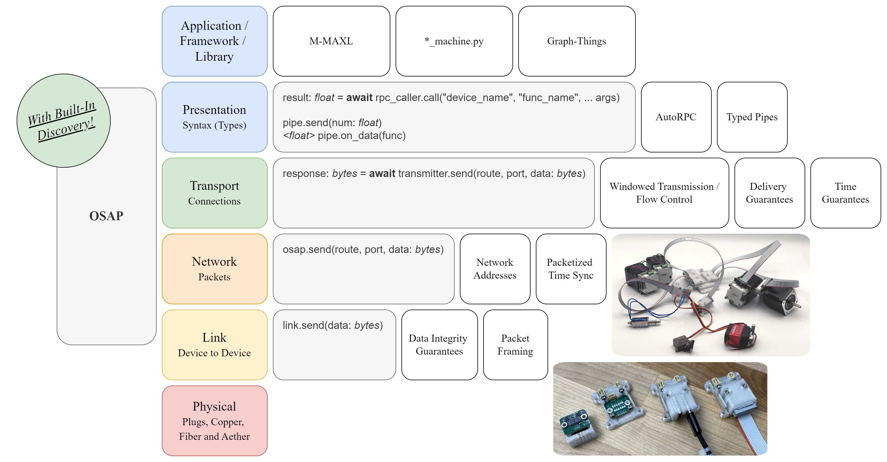 OSAP follows the Open Systems Interconnect model (Standardization 1994) which is guided by the end-to-end principle (Saltzer, Reed, and Clark 1984), both of which were foundational during the invention and proliferation of the internet, but neither of which have been rigorously followed in the internet’s development (Group 2019). The OSI model was meant to enable broad connectivity across heterogeneous link layers, but in practice the field of internetworking in hardware (and in industrial machine systems in particular) is fractured.