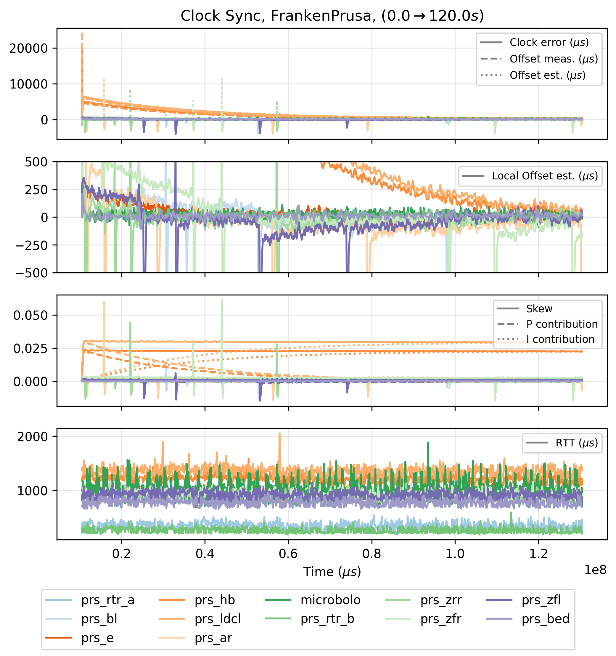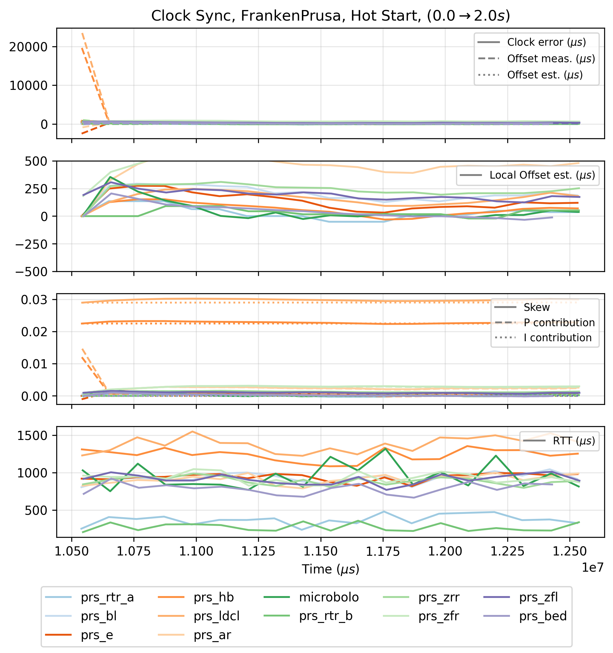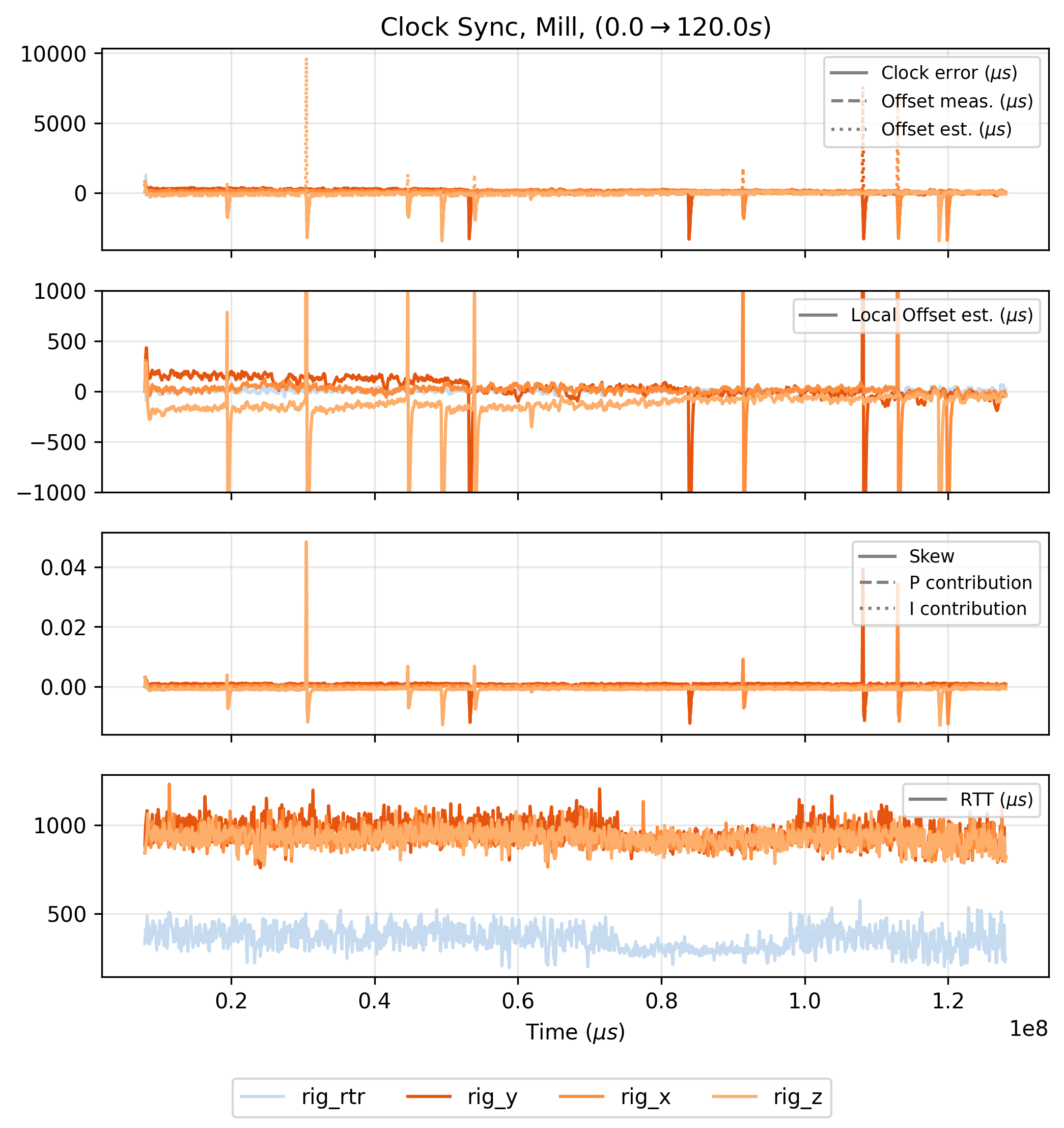 In the test above, we can see that clocks adjust to within \(500\mu s\) with one another after \(60s\) and within \(250\mu s\) after \(100s\) - and get better over time. Two caveats, the first being the rather obvious disturbances on these plots, where it seems that the controllers are being kicked out of band momentarily - I discuss this in Section 2.4.3. The second is that \(60s\) is a long time to wait for acceptable clock synchronization. To ameliorate this, we can hot start the synchronization controller, by storing clock skews after longer time synchronization runs and re-loading them into firmware when the system is initialized.