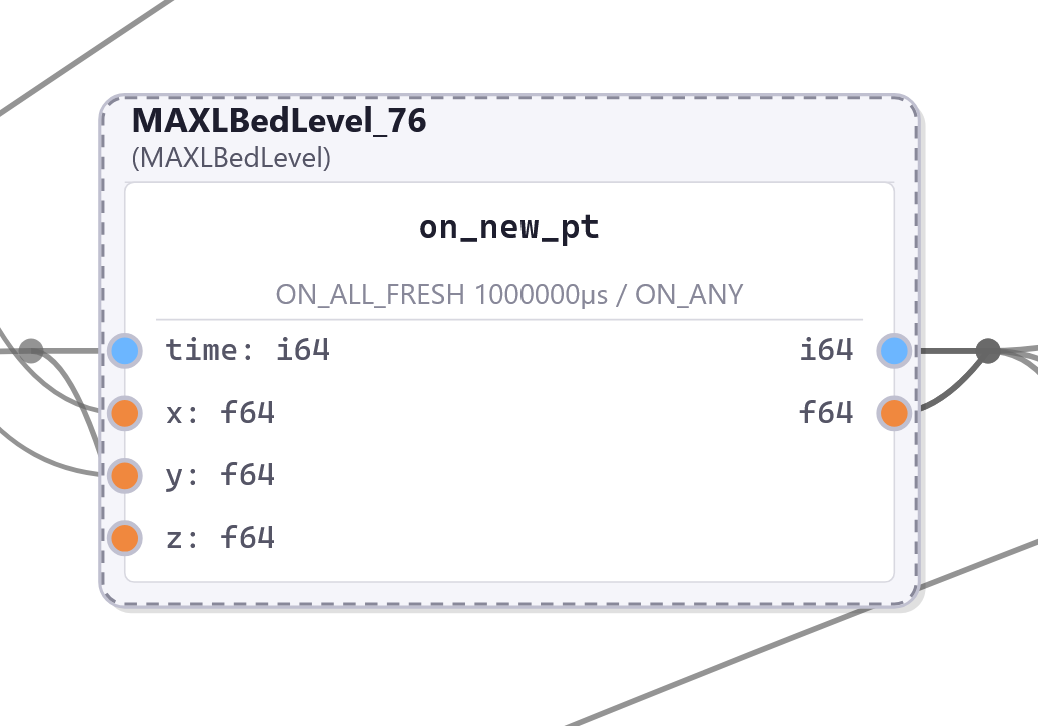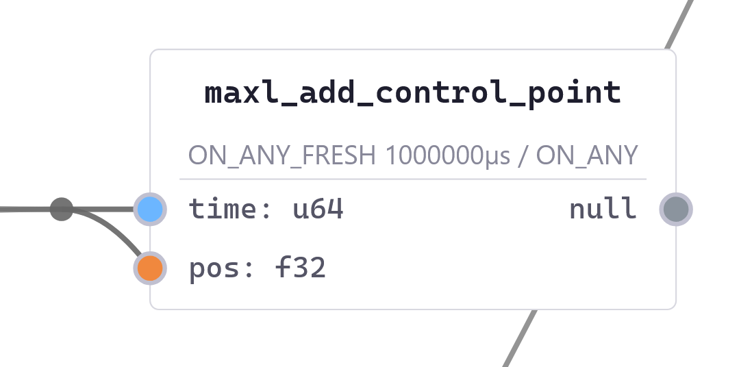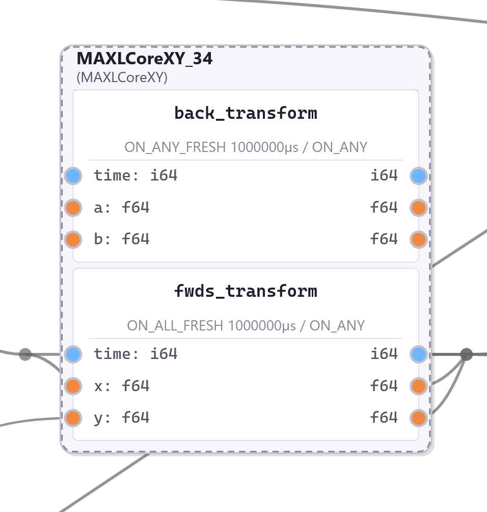 Within that framework, we need to build motion control as a central application. The challenge in this regard is twofold: first, we need synchronized execution of a planned trajectory in our distributed modules. The basis for synchronization is OSAP’s clock sync service (Section 2.2.4.2), but we still need to write those trajectories and interpolate them. We also want to build controllers for a range of machines from a shared core of motion control components rather than re-writing them whenever we build a new machine. Finally, we need to develop motion control in a manner that allows us to uncover realtime states that are normally hidden beneath GCode, as I dicussed in 1.2.4.1. For these tasks I wrote MAXL (Modular Acceleration planning and eXecution Library); it develops motion controllers as dataflow graphs. We can then use PIPES configurations of MAXL blocks to combine kinematic transforms and corrections, lookahead planners (5.2.1 and 5.6), and a host of other motion planning utilities (3.3.3) into new controllers.