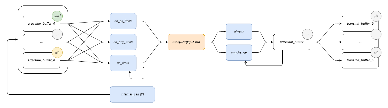 Functions have some state: an input mode (on_timer, on_all_fresh, or on_any_fresh) that defines when it will run, and an output mode (always, or on_change) that defines the conditions under which it will produce new messages.