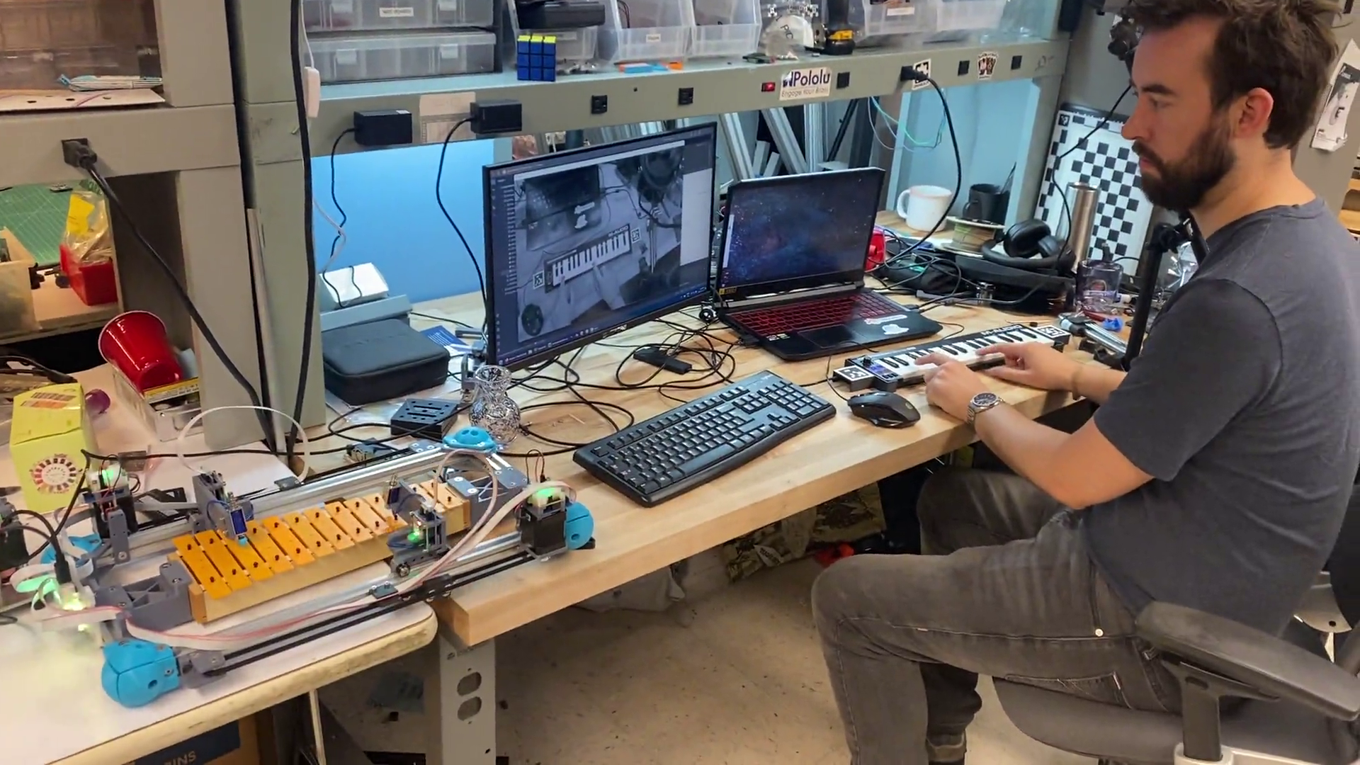 flag_running.set()Quentin added a computer vision system that detects a user’s fingers above piano keys, and listens to MiDi input over USB. This then generates instructions for the machine interactively. Rather than rebuild build that system in PIPES, he simply modified my xylophone control script to open a socket into his process.