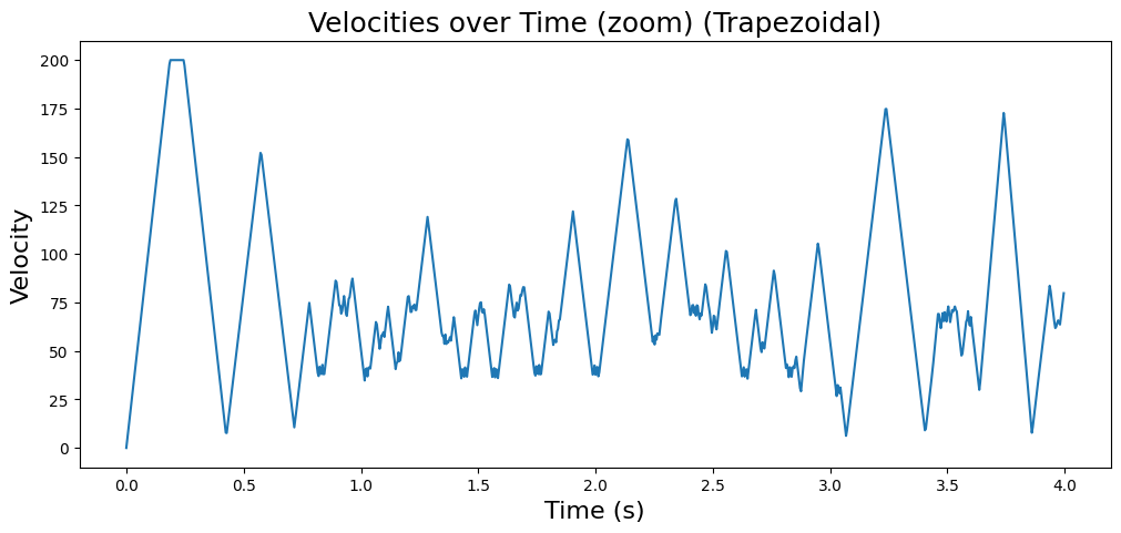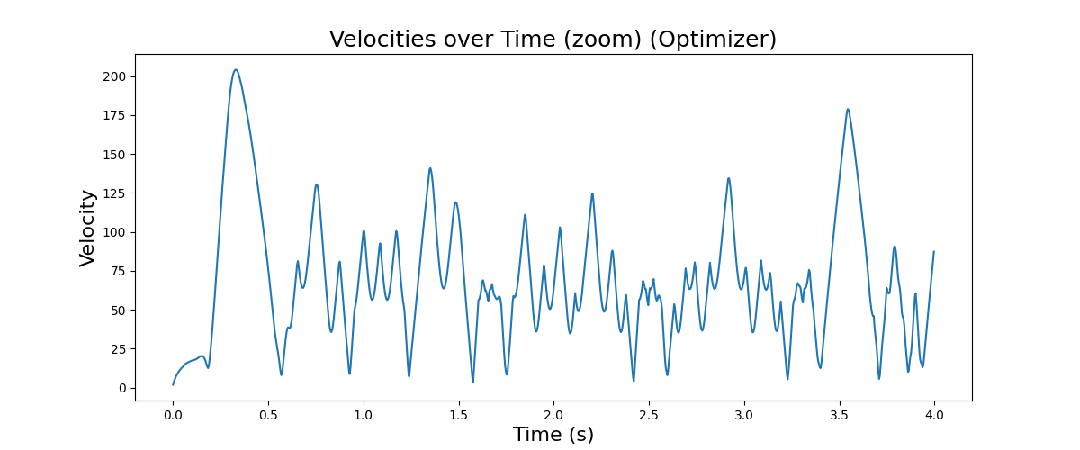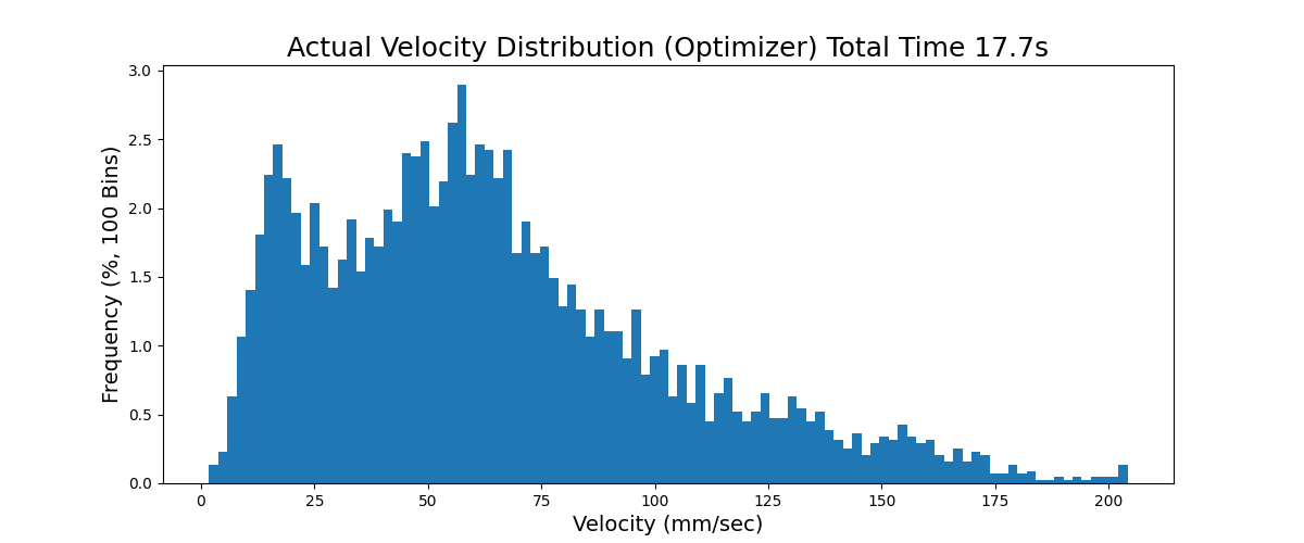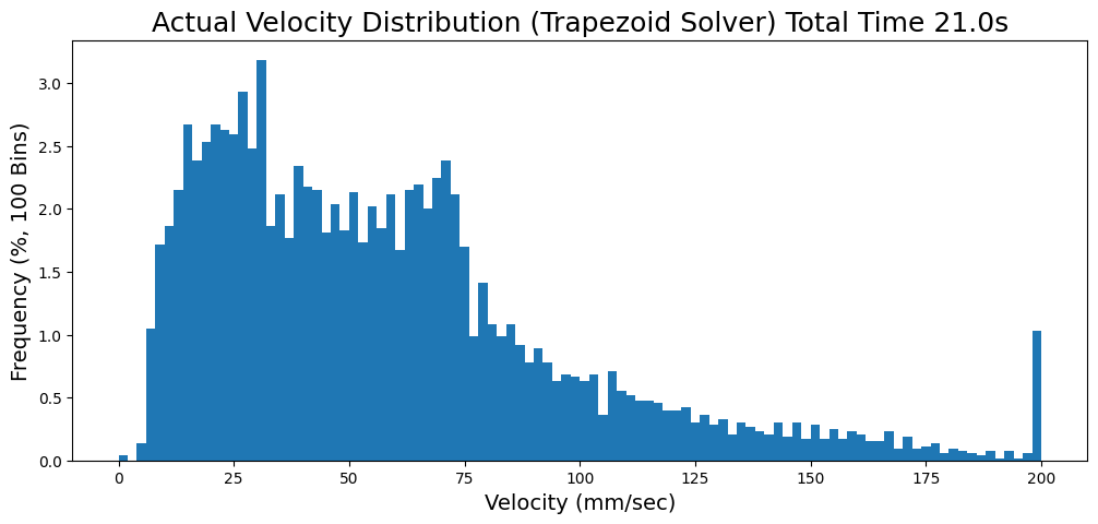 In Figure 6.13 and Figure 6.14 below, I show some early results of the solver operating on a motion system alone: because our solver can use a more nuanced motor model than off-the-shelf trapezoidal solvers, it manages a 15% increase in overall speed and produces a smoother velocity plot.