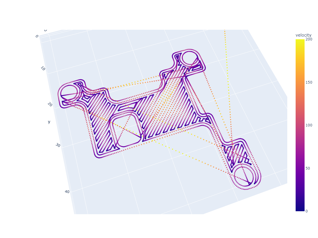 Switching directions quickly is important for any machine, and machine builders have developed novel kinematics to increase performance in this regard. One of which is CoreXY (Moyer 2024). CoreXY (and many other arrangements) is anisotropic in its physical speed and acceleration limits: it has to move much less mass in the X direction than in Y - while it has just as much available motive force in either direction. This means that a part’s orientation with respect to the machine’s kinematics can be hugely important for overall print speed, as shown below in Figure 6.6. Slicers, however, are unaware of this property, meaning that they can’t optimize print speeds by (for example) changing the primary direction of an infill pattern.