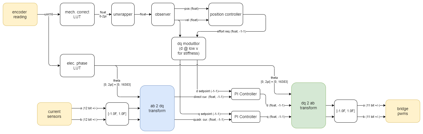- PWM and current sampling / sign discrimination, PI controllers, DQ/AB transforms,