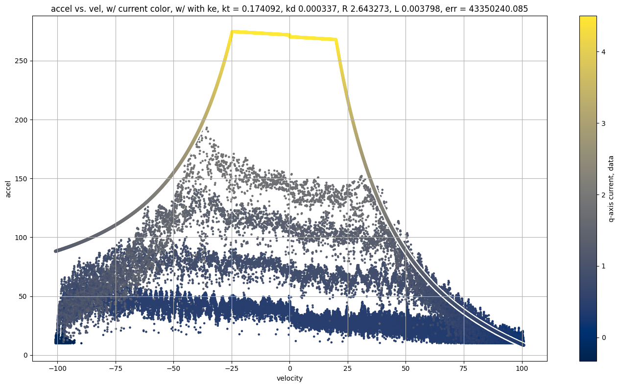 A few things are worth noting about the motor model. Firstly, by the magic of SI units, \(k_t\) and \(k_e\) are equivalent (although they have different physical meanings). One way to intuit this is that they both describe the interaction between the rotor and stator’s magnetic fields: \(k_t\) tells us ~ how much the stator’s field pulls on the rotor’s field, and \(k_e\) tells us ~ how much the rotor’s field drives voltage in the stator’s windings. If you squint the third eye, this can make a lot of sense. For a better explainer, I will paraphrase a fantastic stack overflow post (REF: we will have to go digging thru the motor control notes for that)