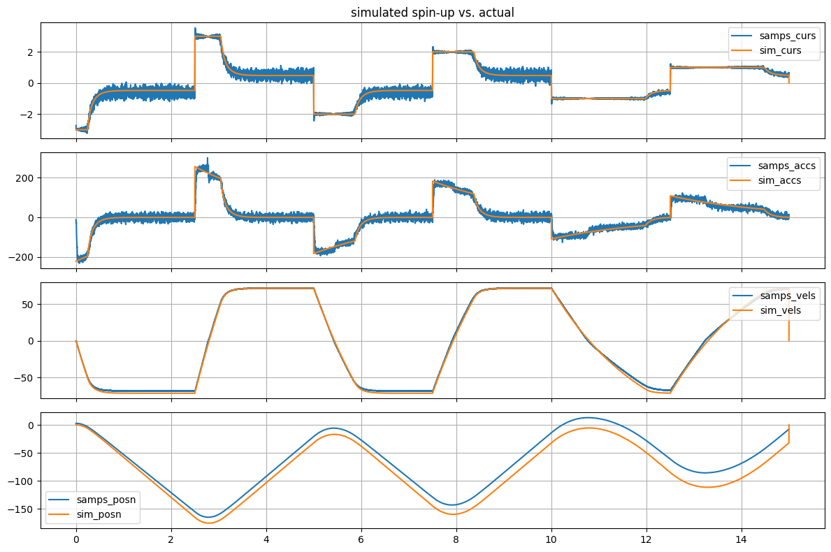 Most of these values can be easily measured in the real world: \(R\) is a simple multimeter test, and \(L\) can be measured using an LCR probe. \(V\) and \(A\) are measured in the motor controller’s firmware, \(\Theta\) (and its derivatives for velocity, acceleration) are also measured in firmware (using an encoder). Rotor Inertia \(J\) is typically included in a motor datasheet, but I have at times taken motors apart to weigh and measure this when datasheets seem untrustworthy. That leaves \(k_t\) and \(k_d\) to fit computationally, which we will see later (alongside easier ways to estimate some of the other parameters). To arrive at these values computationally, we would need complex simulations of the motor’s internal structure: winding counts, magnetic properties of stator and rotor steel and permanent magnets, etc - this is not worth it, so we fit to data instead.
