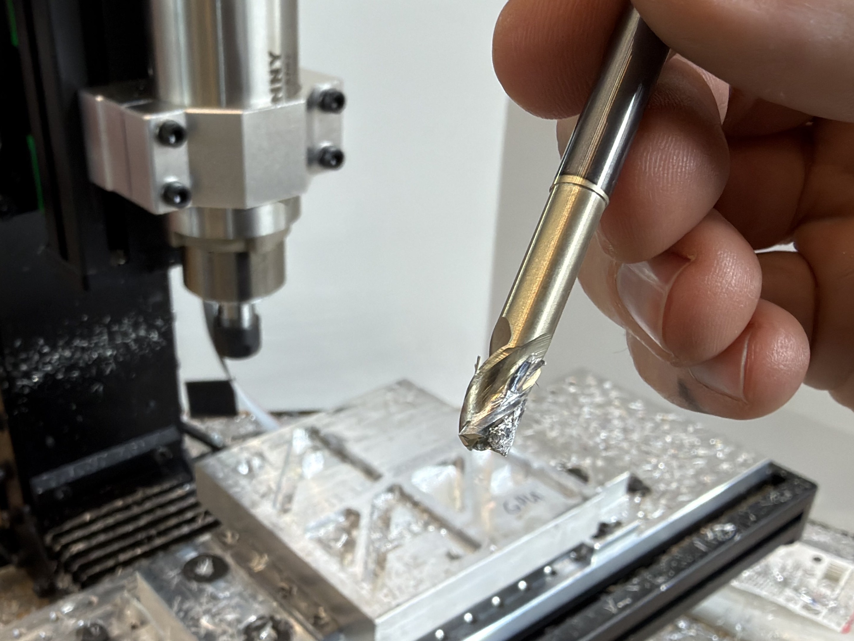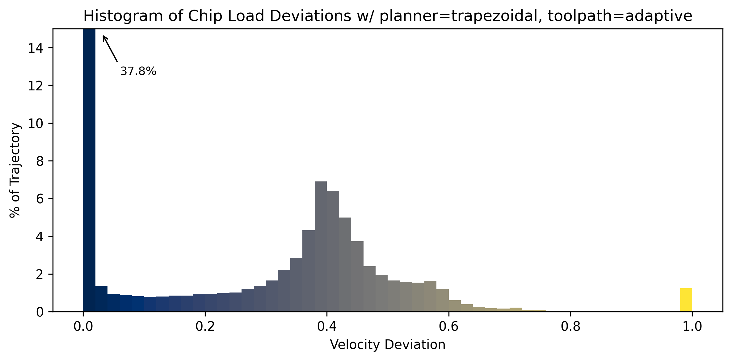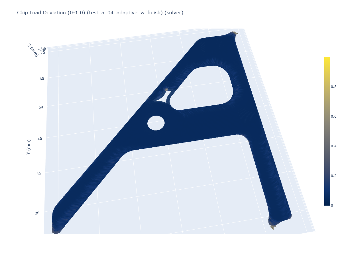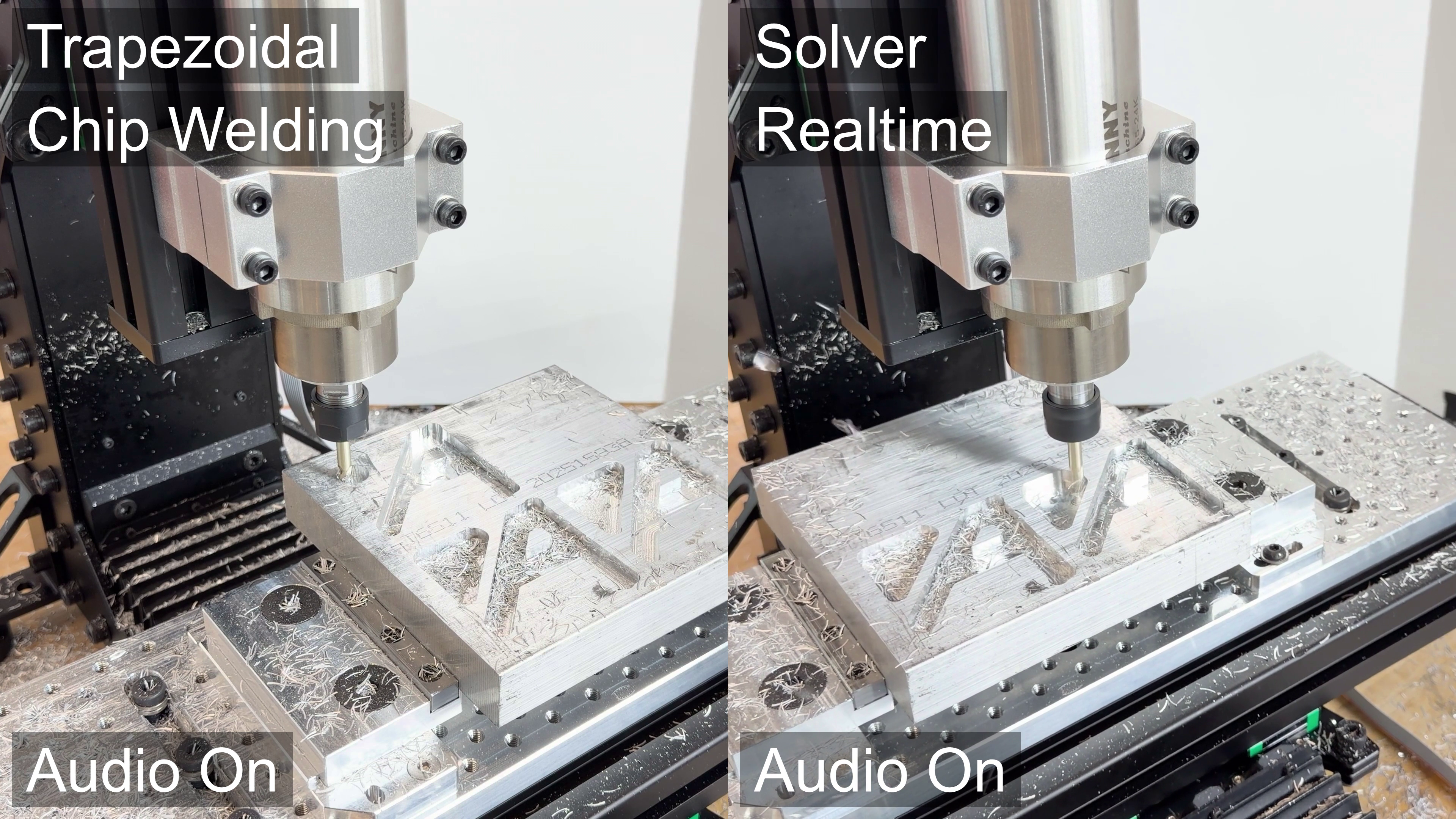 This shows how variable machining can be: the toolpath is the same as I had run a number of times previously, when I ran the experiments in Section 7.5.3. I tried the trapezoidal path a total of three times, each with a fresh endmill. The solver-controller run worked on the first attempt, and I tested it between one failed trapezoidal path and another. My guess is that in this case there was less time between jobs. In my prior runs of this part, I took a few minutes between each cut to adjust parameters in the toolpath. This time I was simply running paths one after another. The stock was warm to the touch during these experiments - perhaps the chip welding was more likely because of this increased temperature, however slight. This would also indicate that the toolpath parameters that I found in 7.5.3 were quite close to the limits.