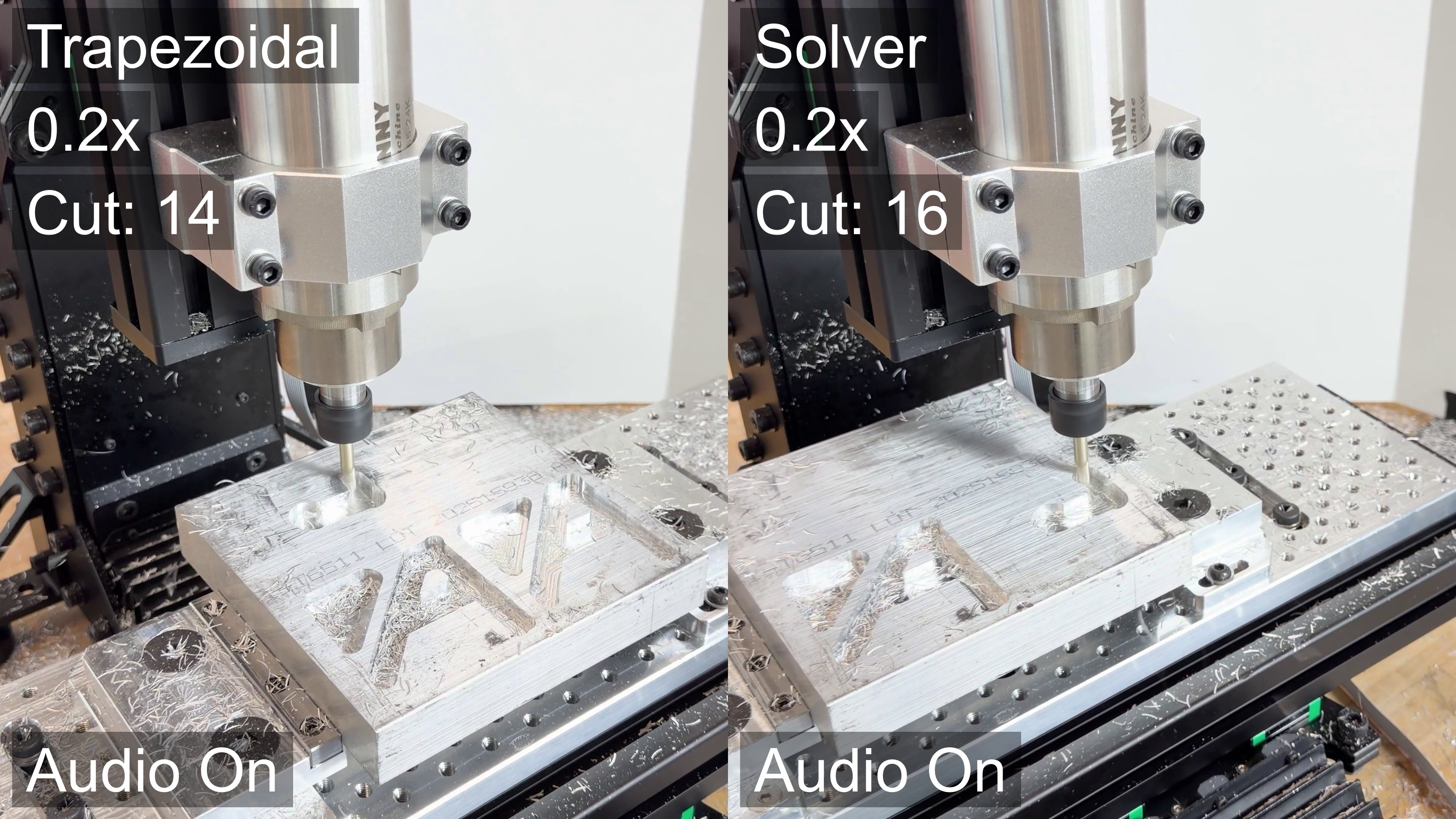 First, it becomes clear that the solver is faster overall after the first few cuts. This is audible as well, there is a subtle difference to the sound that the machine makes as it enters a cut: with the solver, the cutting sound is more consistent (perhaps indicating uniform process parameters through the cut), whereas there is an audible ramp in tone in the trapezoid solver.