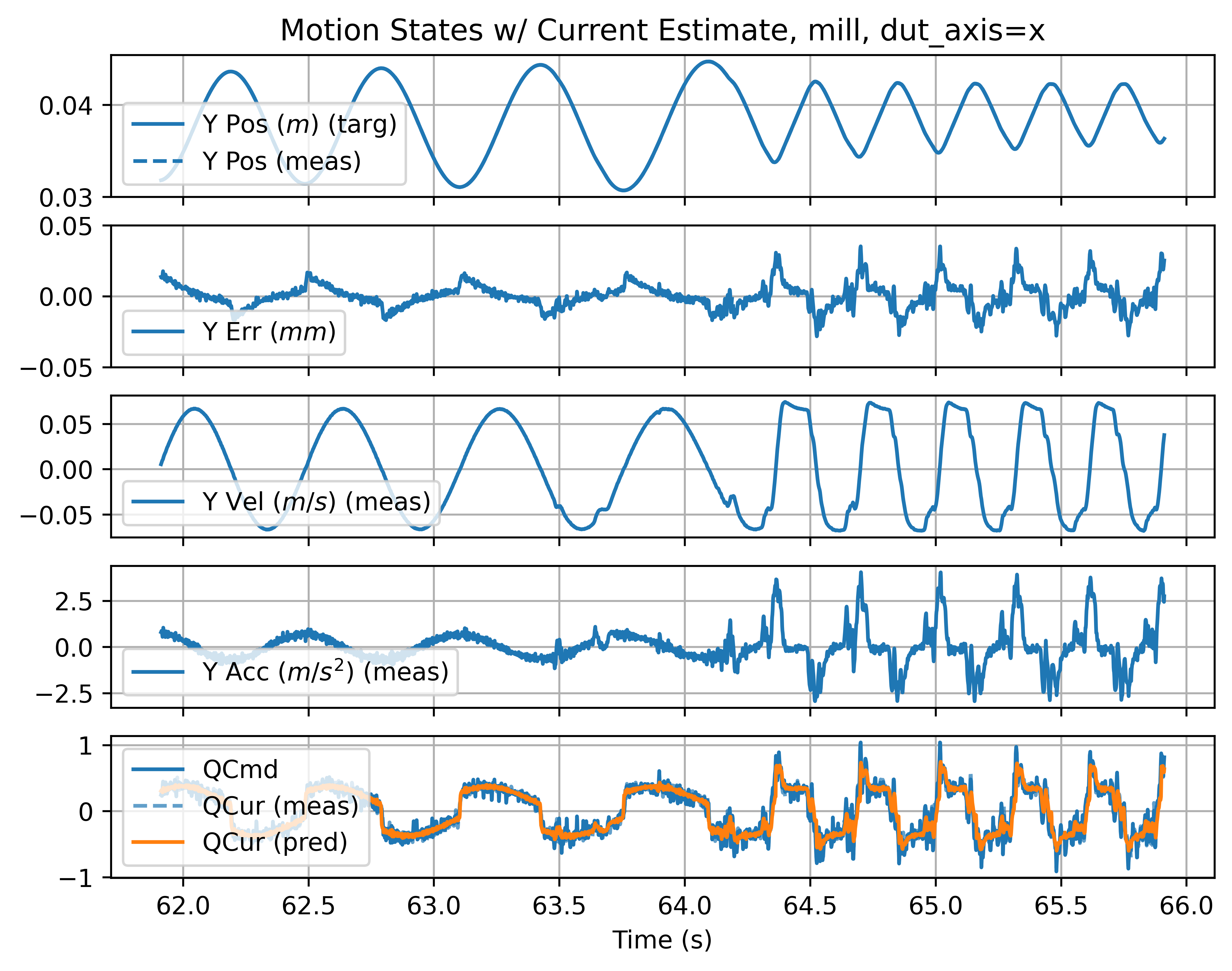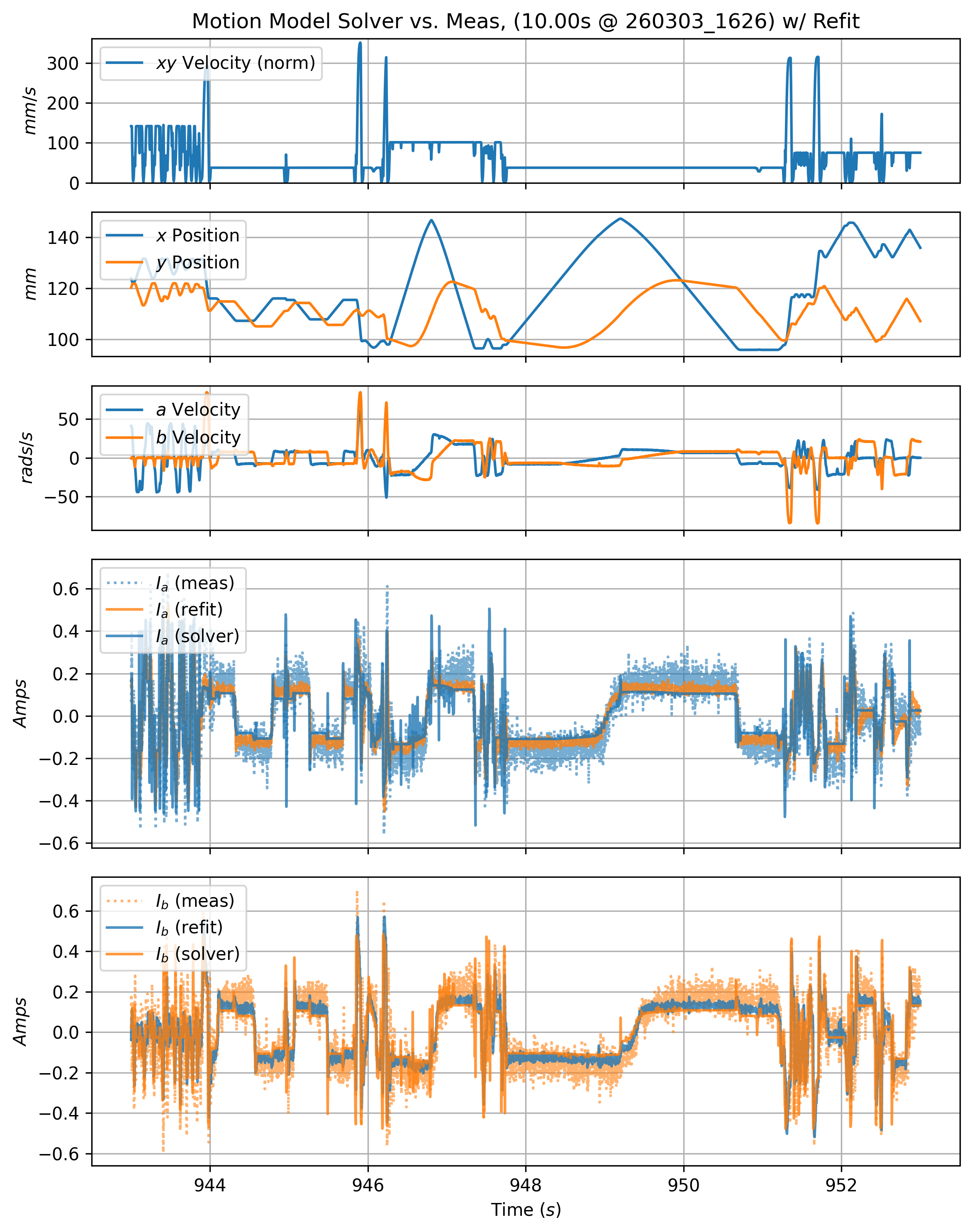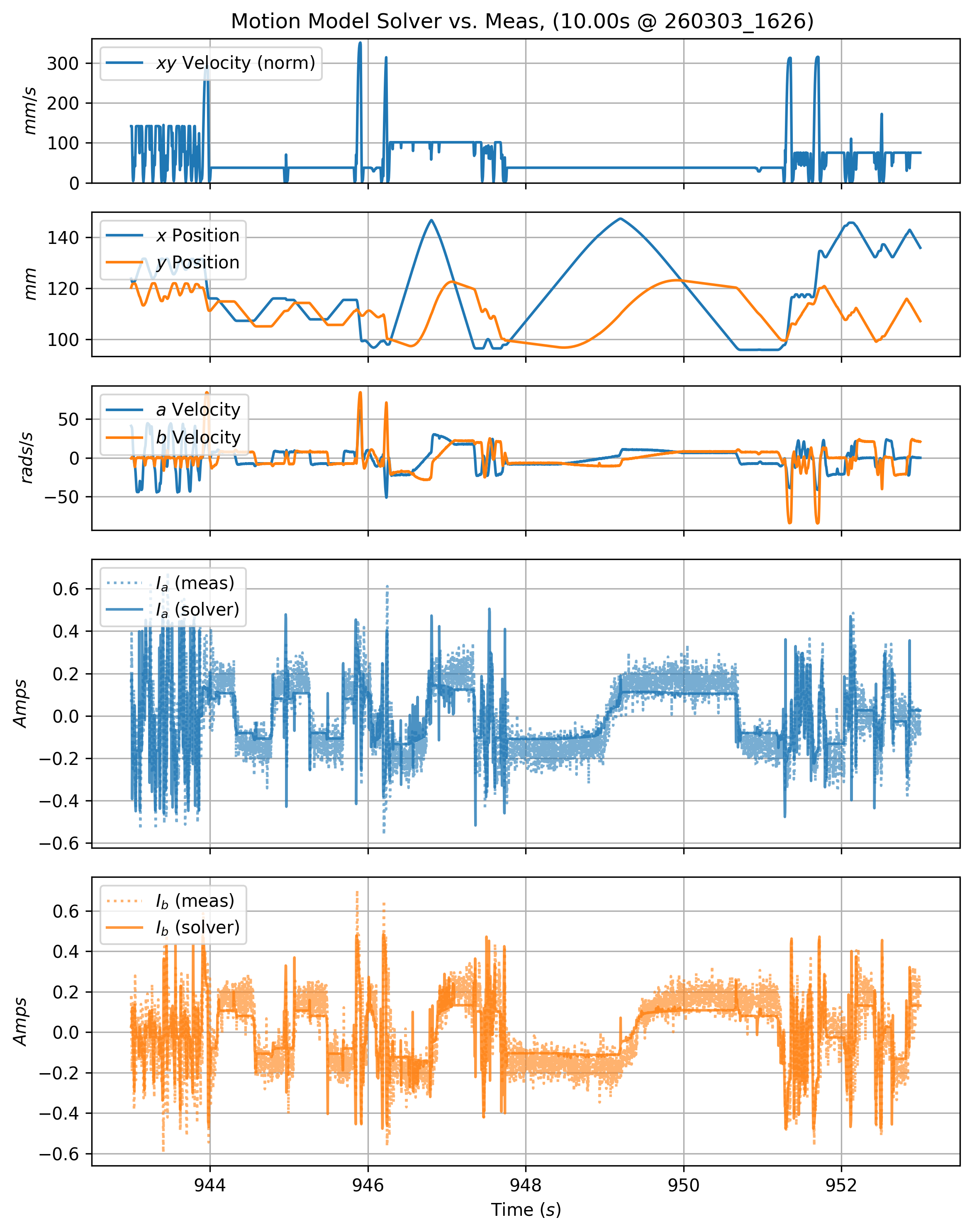In Section 6.10.1, results from each part include an error metric on motion model fits. This metric measures the average deviation of the solver’s motor current estimates from measured motor states. Those are calculated from time-series like those shown below, which renders a twelve second slice of motion data from one of the prints. In it, we can see predicted motor currents (solid lines) vs. measured currents (dotted lines with some transparency).