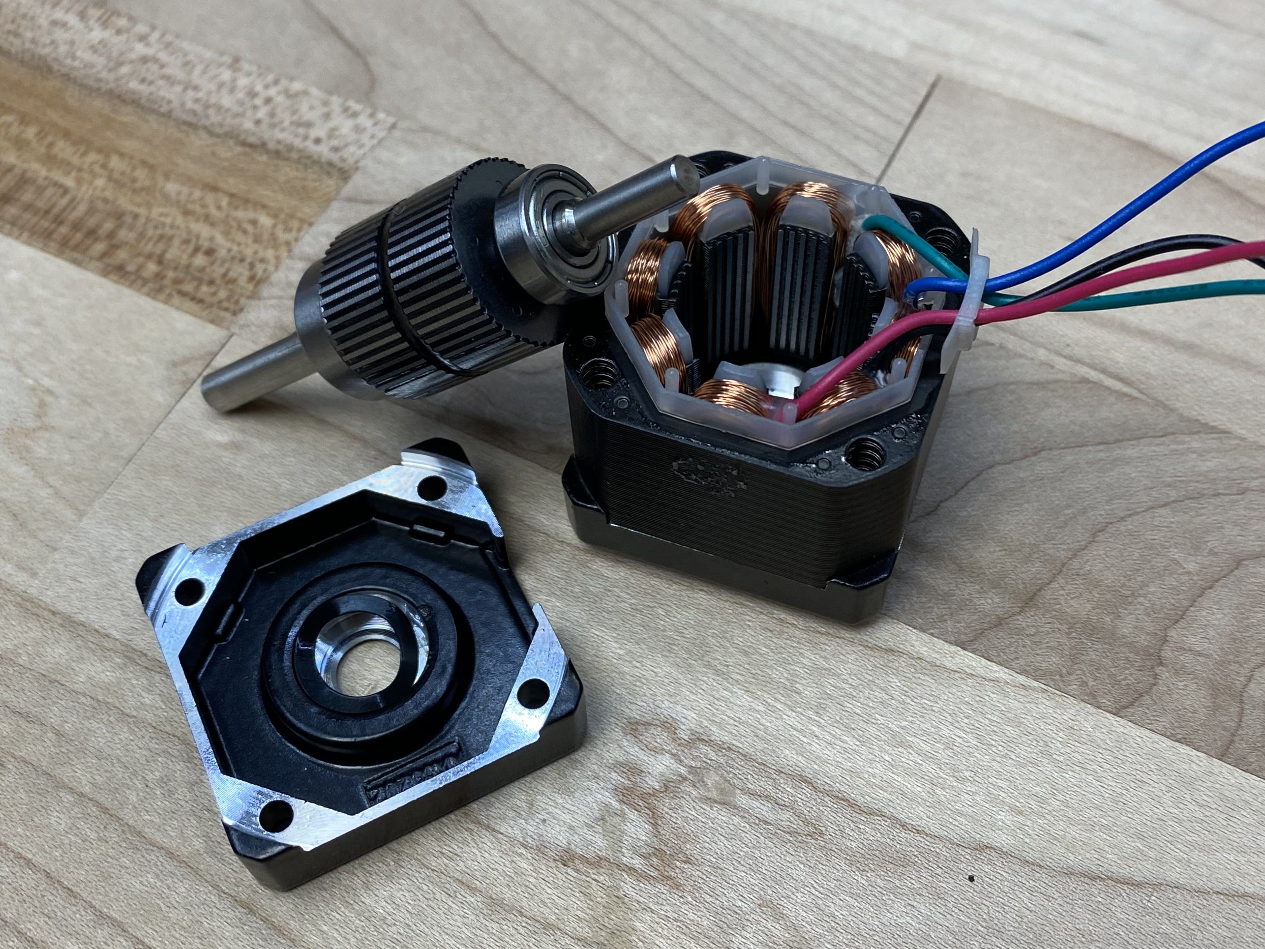 Our motor has a stator (the static part) with electromagnetic windings that can generate a magnetic field, and a rotor that has a permanent magnetic field. Motors work because these two fields (in the stator and rotor) want to line up with one another (which is a way of saying that they are in a lower energy state when they are aligned). The teeth in a stepper motor are arranged such that these aligned states are closer together: given some stator field, the closest alignment for the rotor is never more than \(7.2^\circ\) away from the rotor’s current position. That is, for every electrical rotation, when we rotate the magnetic field through \(0, 2 \pi\) only \(1/50^{th}\) of a mechanical rotation occurs.