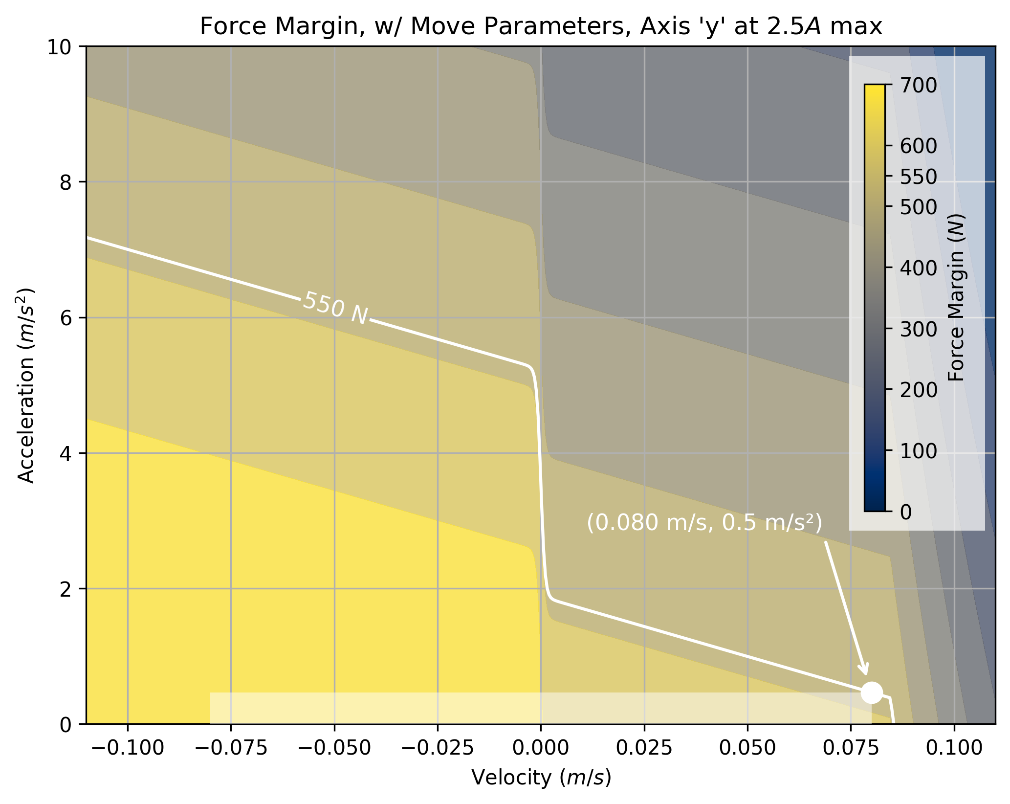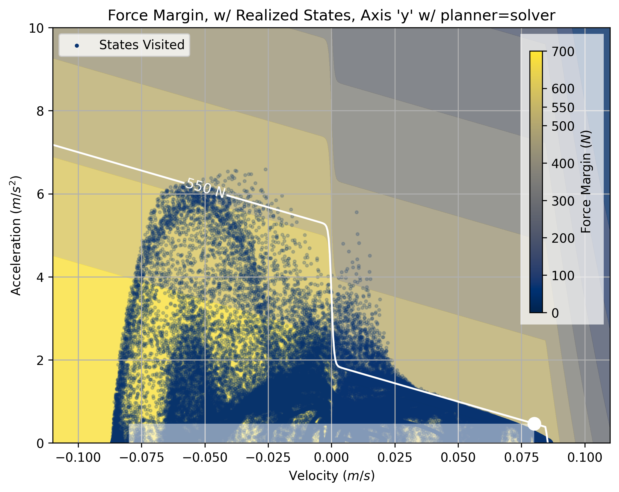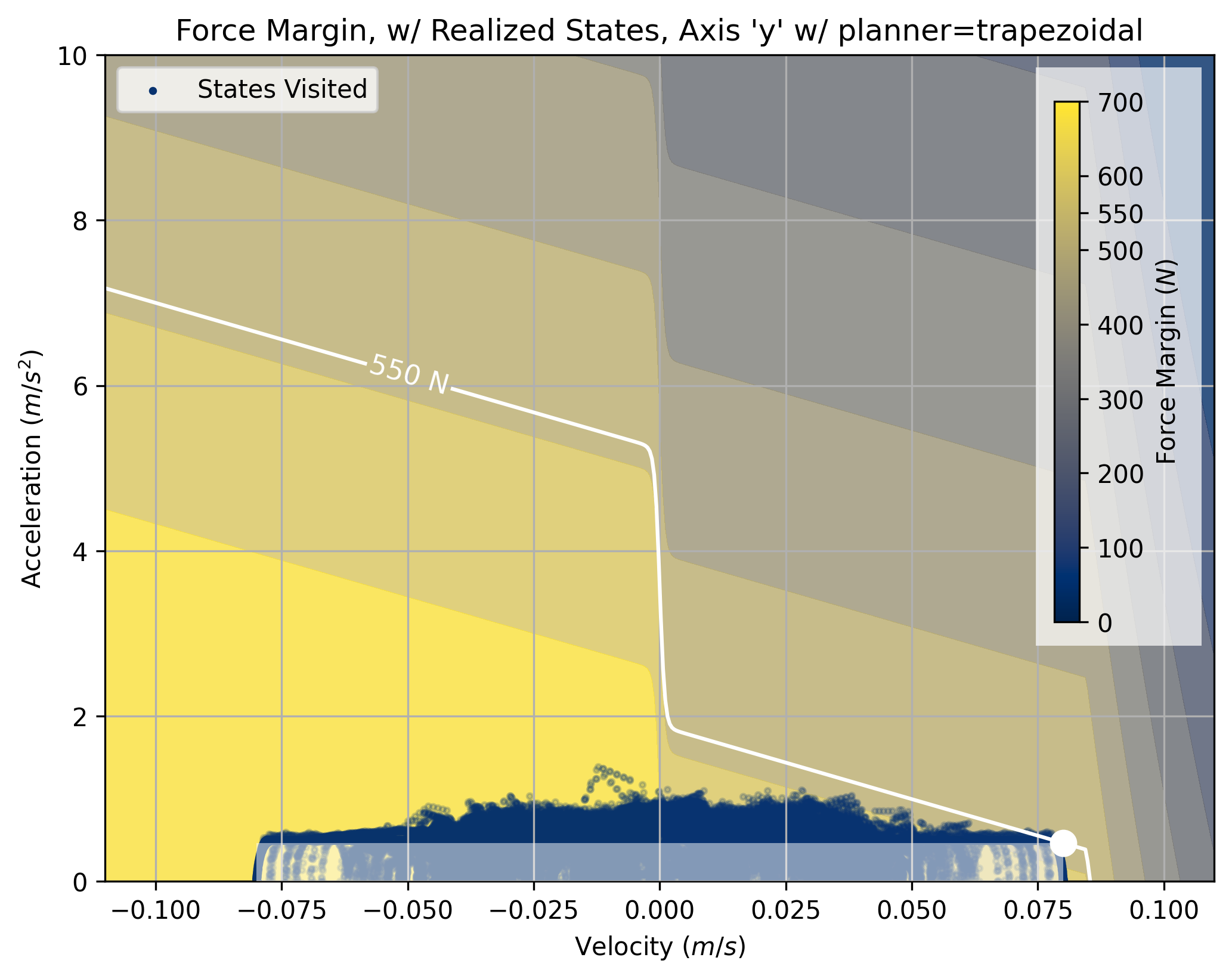In Section 7.3.1, I show that we can use models to select these parameters for trapezoidal solvers. An example of one such selection is below. The shaded area marks the space where the trapezoidal solver can operate. However, the real boundary (marked by \(550N,\) a force margin) encloses a larger area, especially in the left-hand side of the plot.