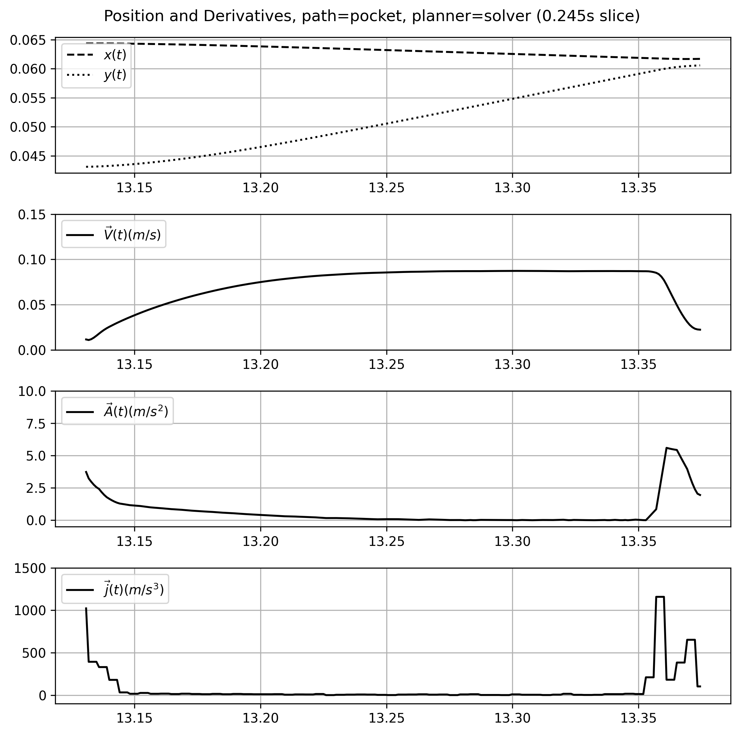 We can see that the solver exploits the system’s damping dynamics: the front half of the speed curve (where it is working against friction) is much shallower than the tail, where it is working with friction. These plots are taken over the same trajectory segment: the solver also traverses it in less time \((0.245s \ vs \ 0.345s)\)