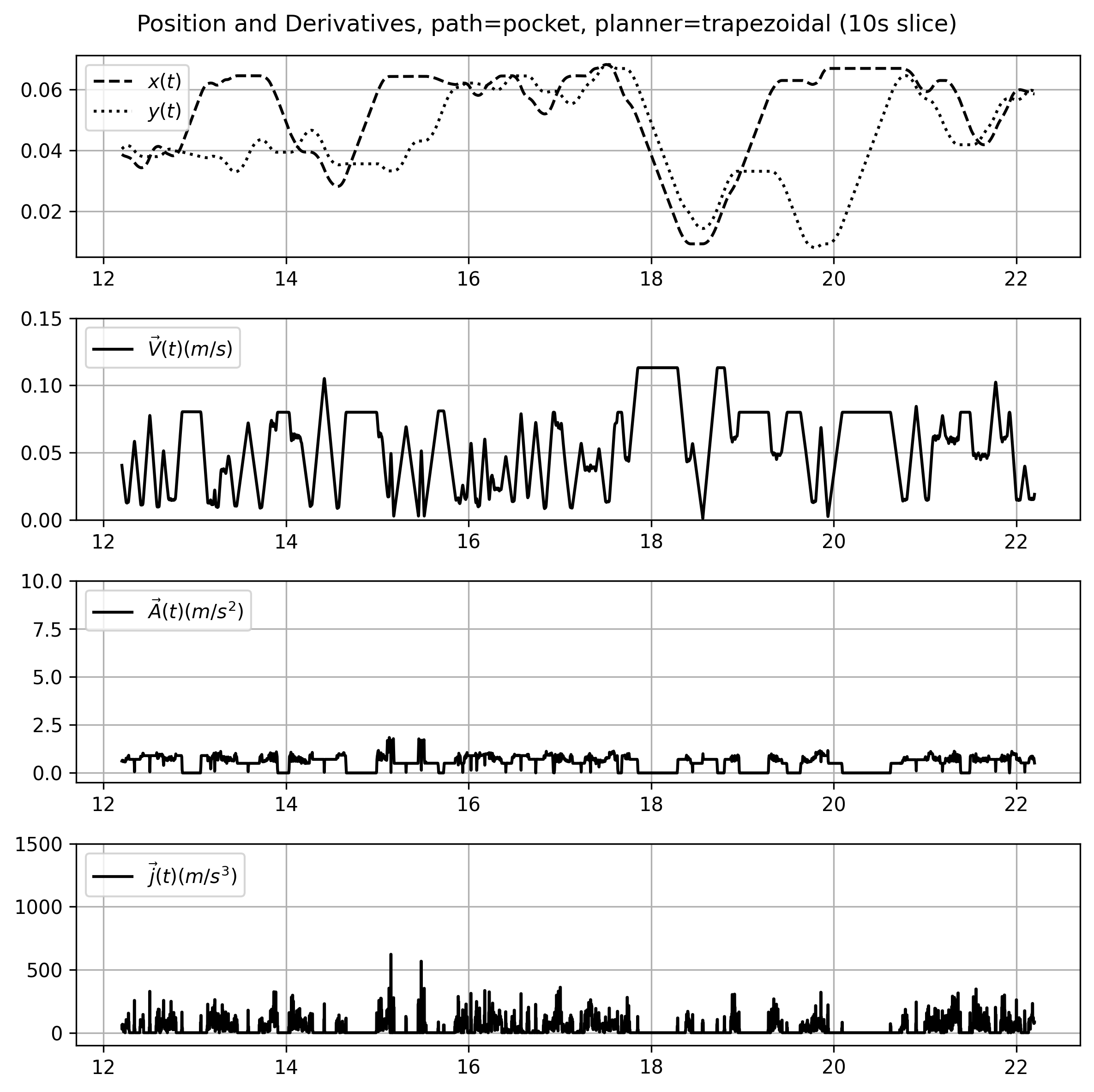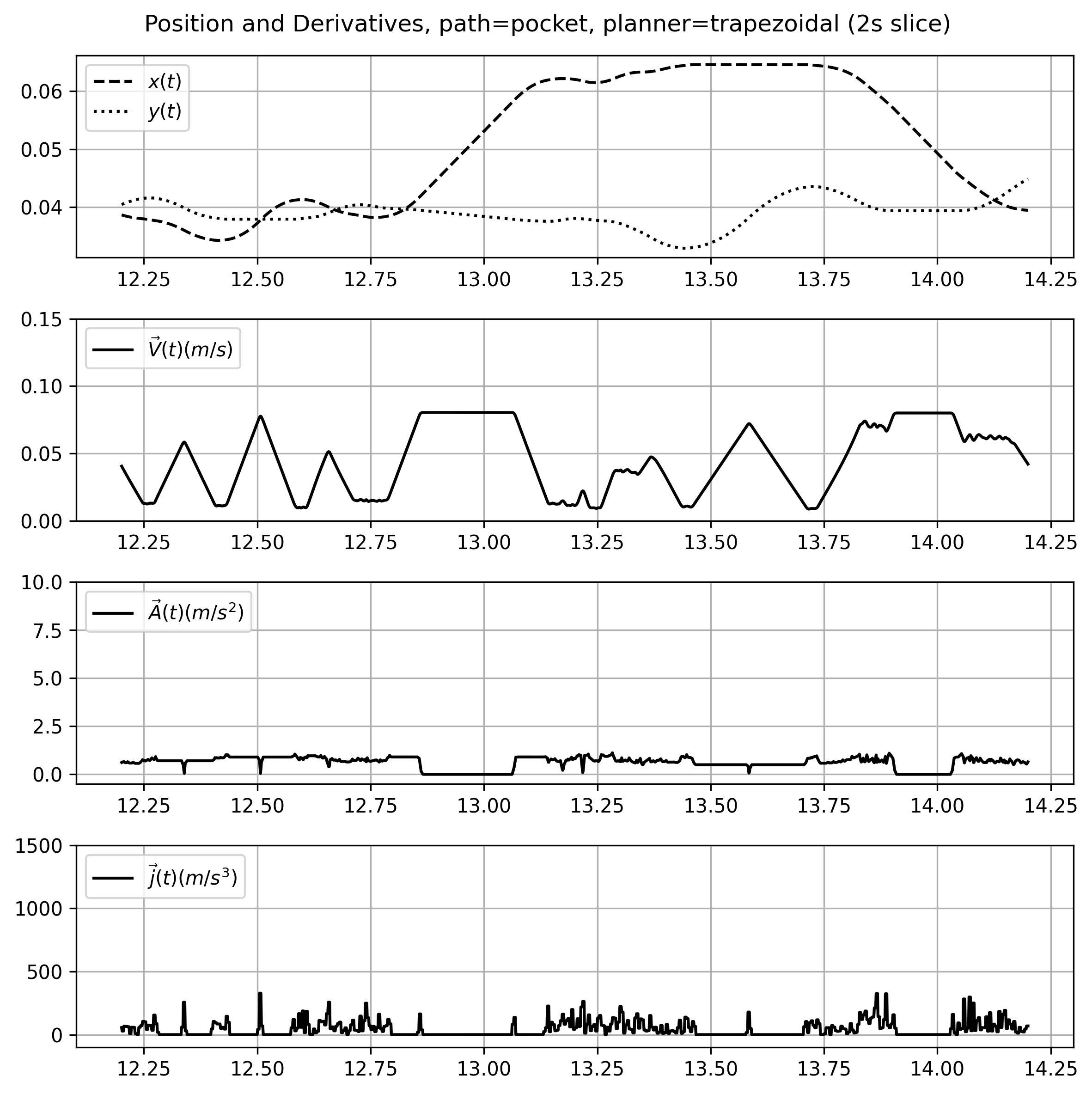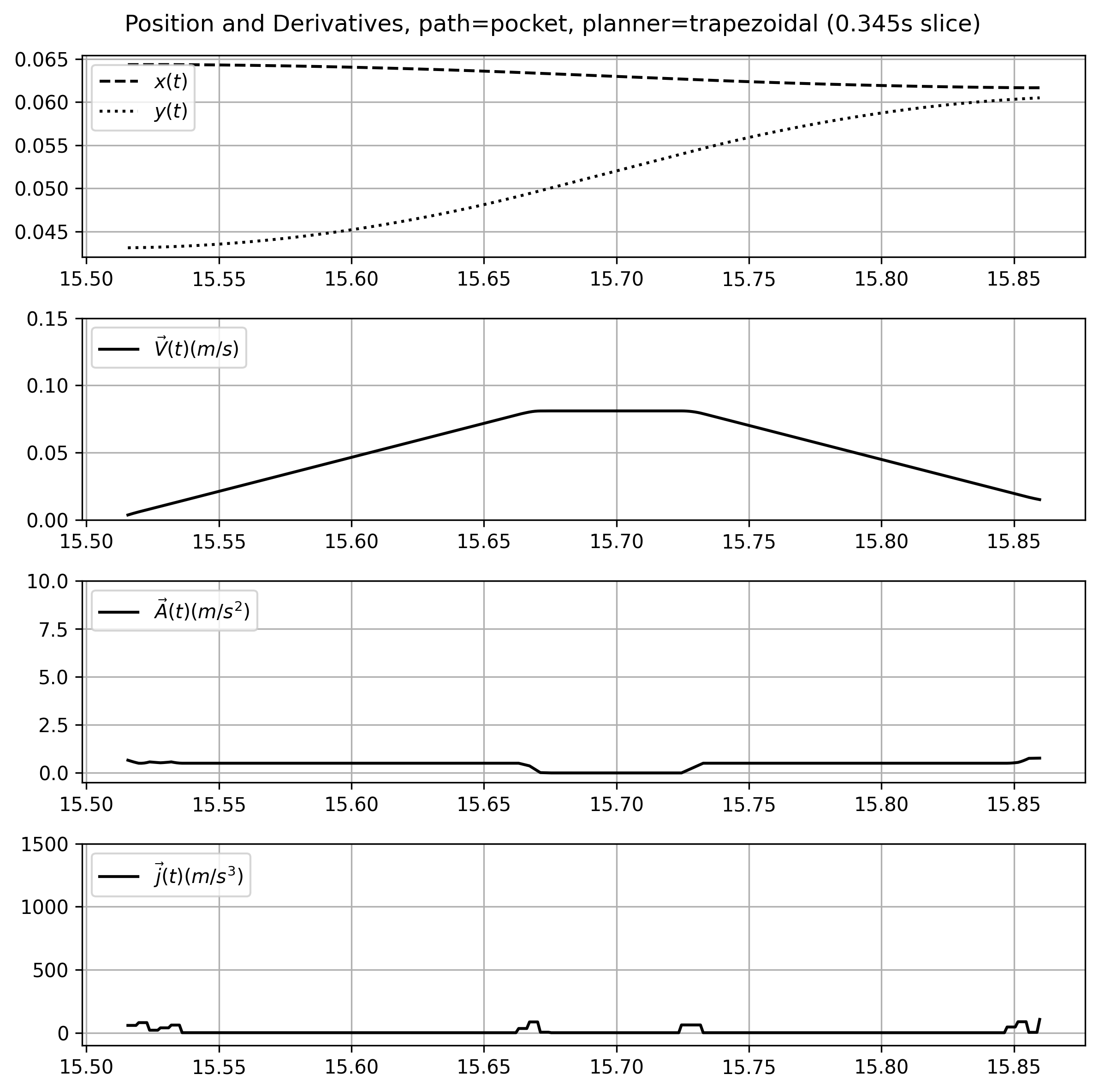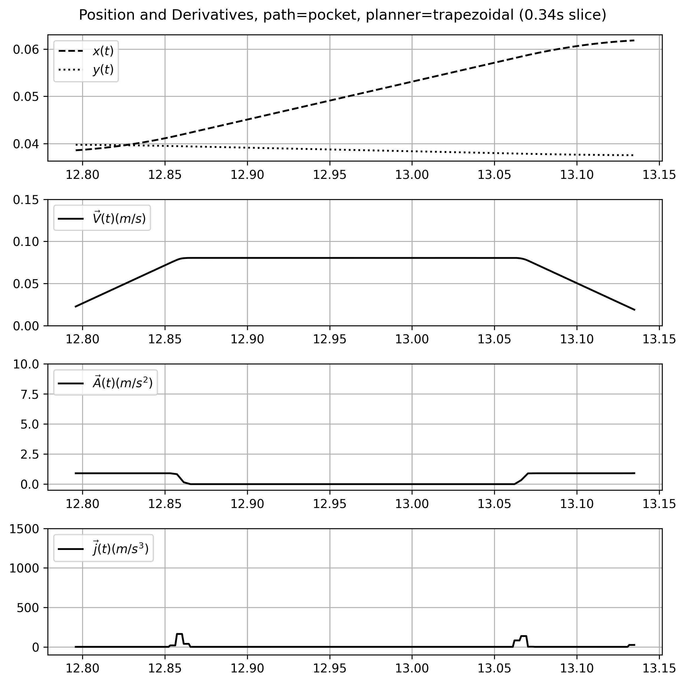 In the state of the art, this is done using a type of solver called a trapezoid planner or s-curve generator (depending on who you ask). I explain how those work in more detail below (5.2.1), which are configured using estimated parameters for a machine’s maximum velocity, acceleration, and (in some cases) jerk. However, this approach greatly reduces the dynamic range used by machine actuators during operation and ignores exploitable motion dynamics like damping assymetry (we can decelerate faster than we can accelerate because friction is working with us).