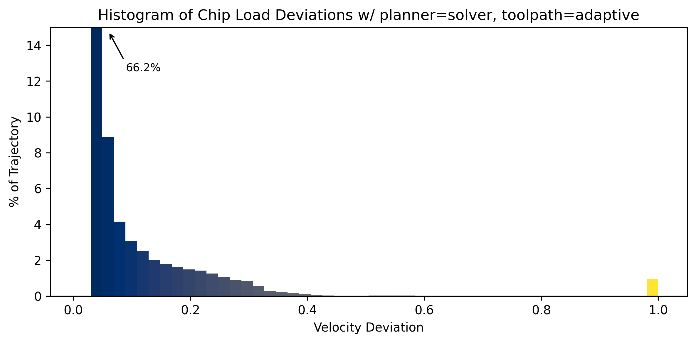 I evaluate this planner against a trapezoid-based solver in Section 5.7.1, showing how this work increases the dynamic range used by our actuators and thus improving overall speeds. I also assess the quality of our models in (5.7.2) and show how they can be iteratively improved using data from real-world machine operation (5.7.3).
