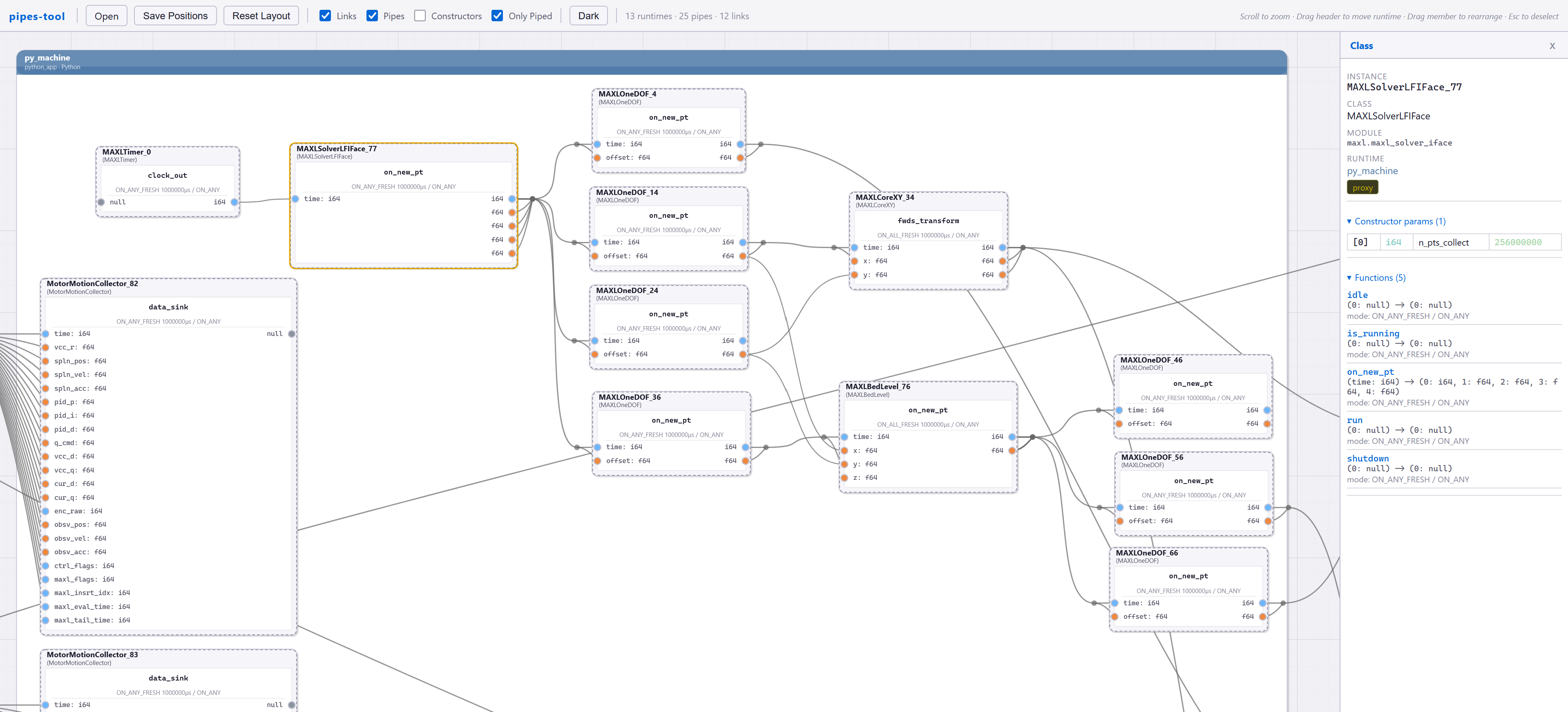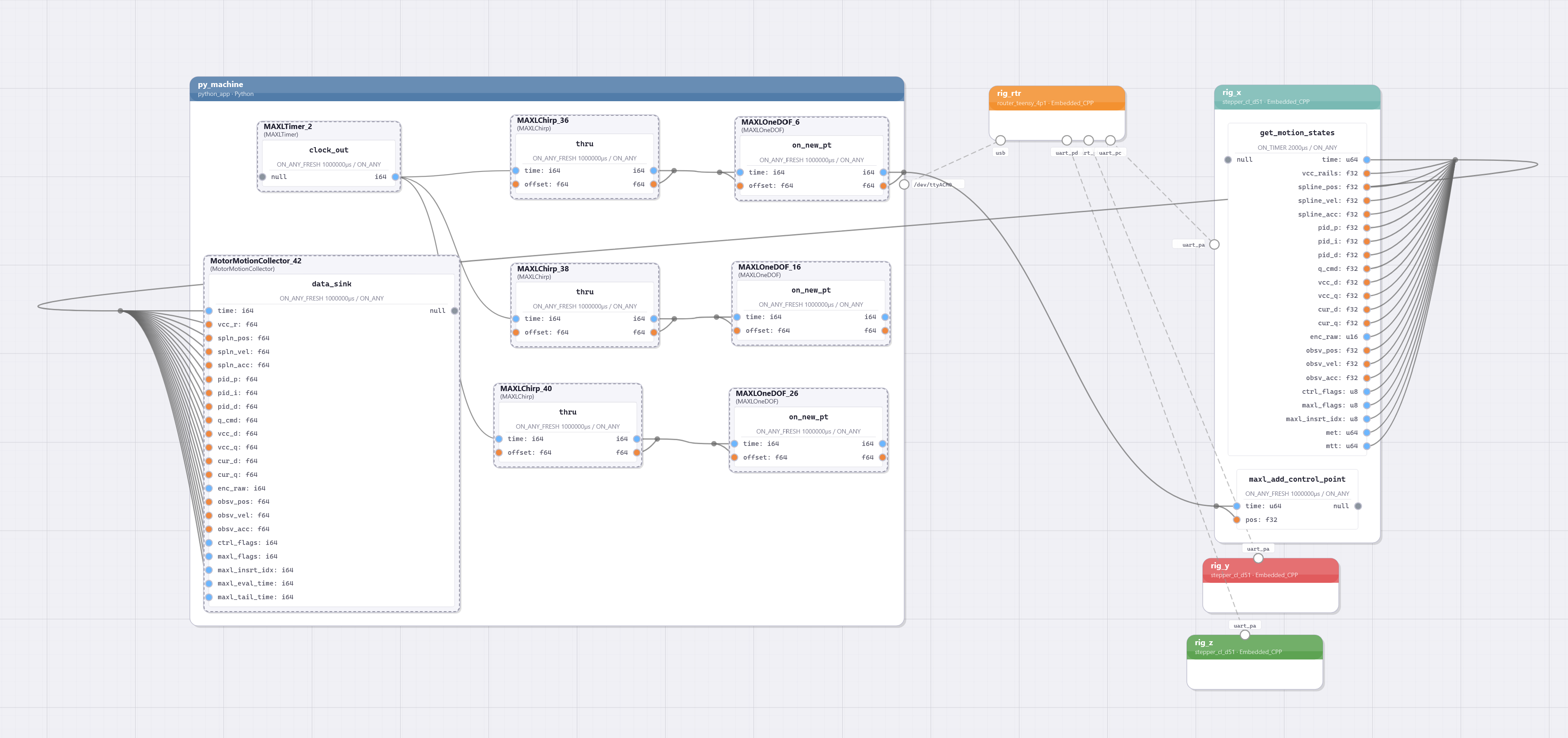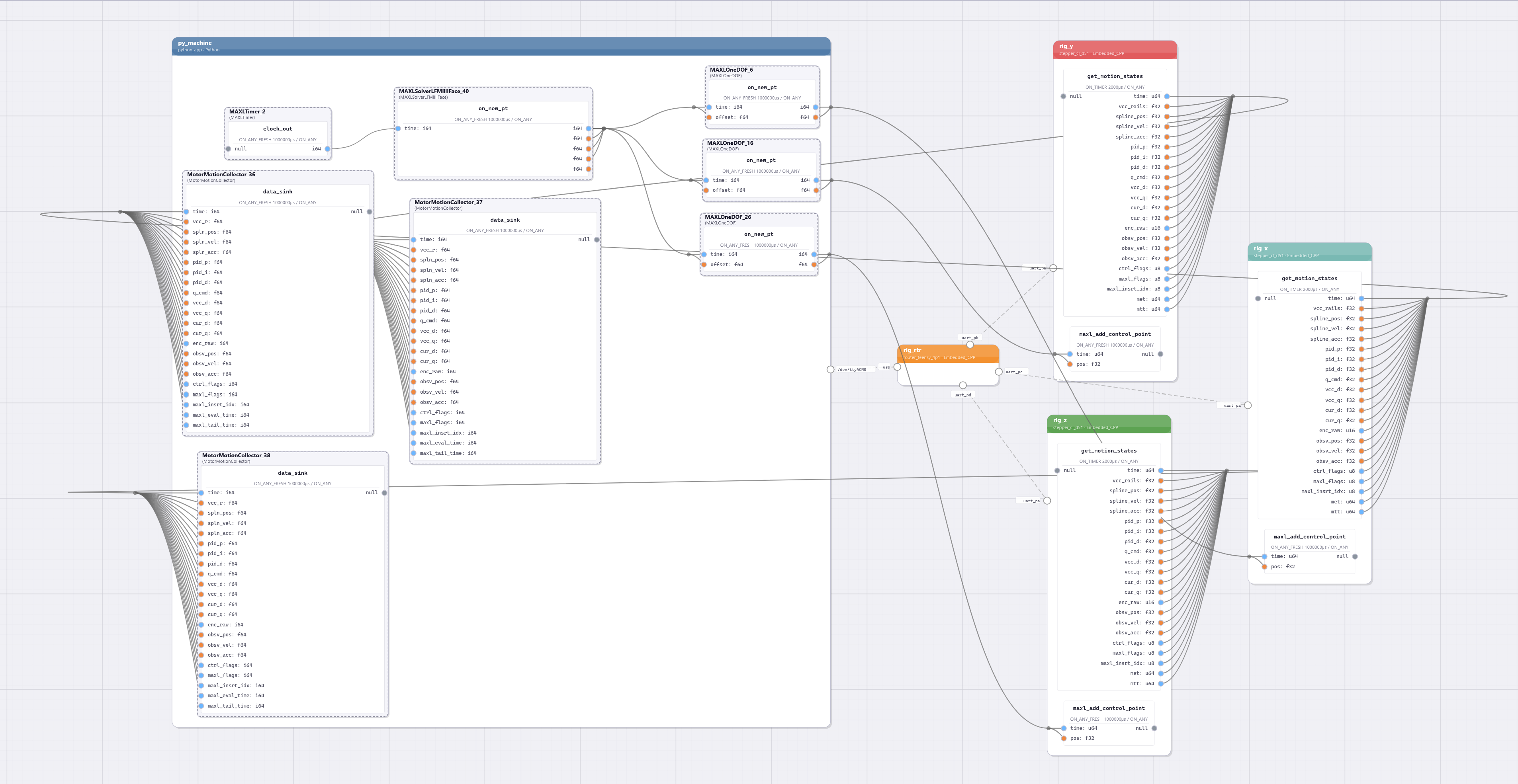 The core principles should extend to make it possible to very quickly build automation more generally: conveyors, material handlers, etc: imagine all of the machines in a bottling plant. These are all subject to motion dynamics, but across “n dofs,” some of which are coupled but many are not. Graphs that contain motion flows and normal logic elements could be a really good framework for assembling their controllers.
