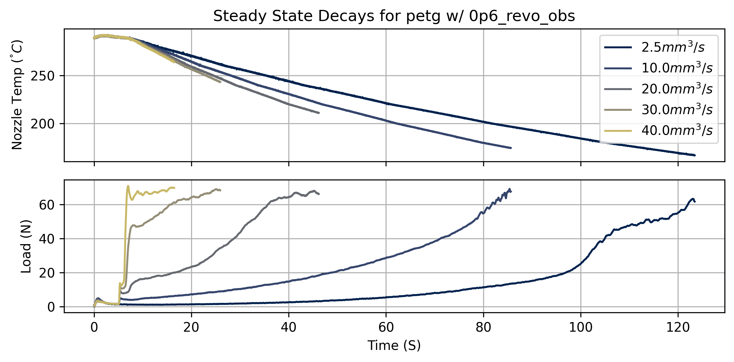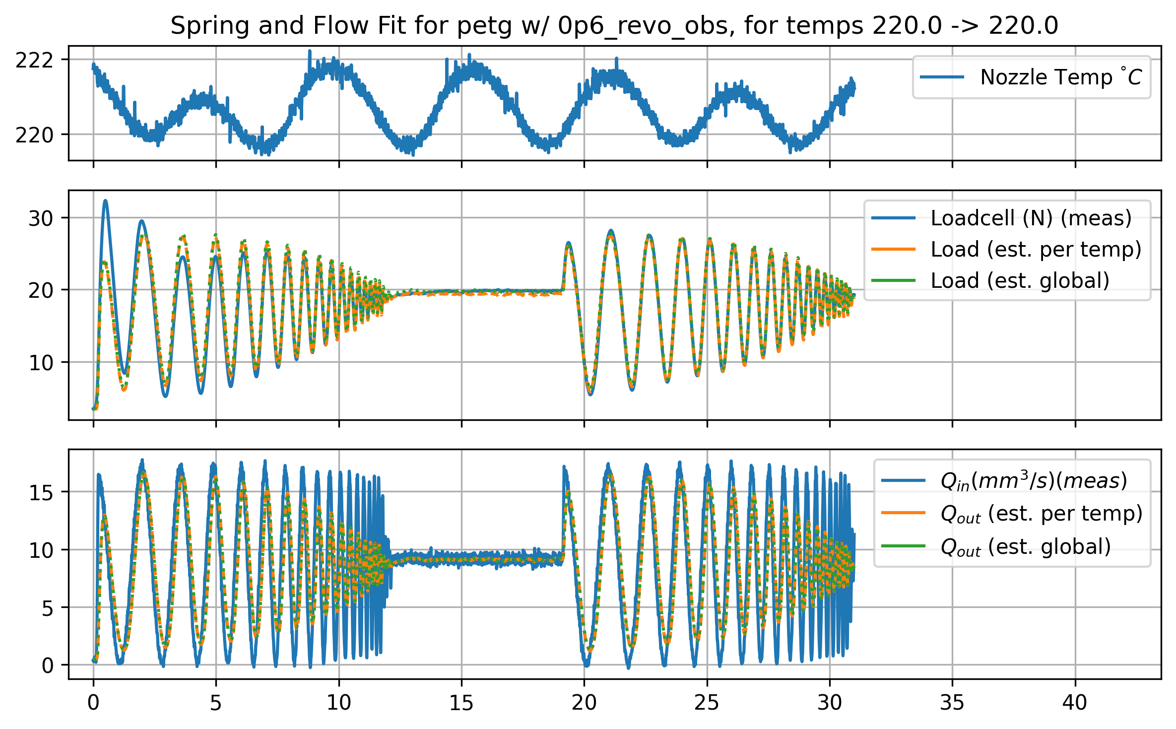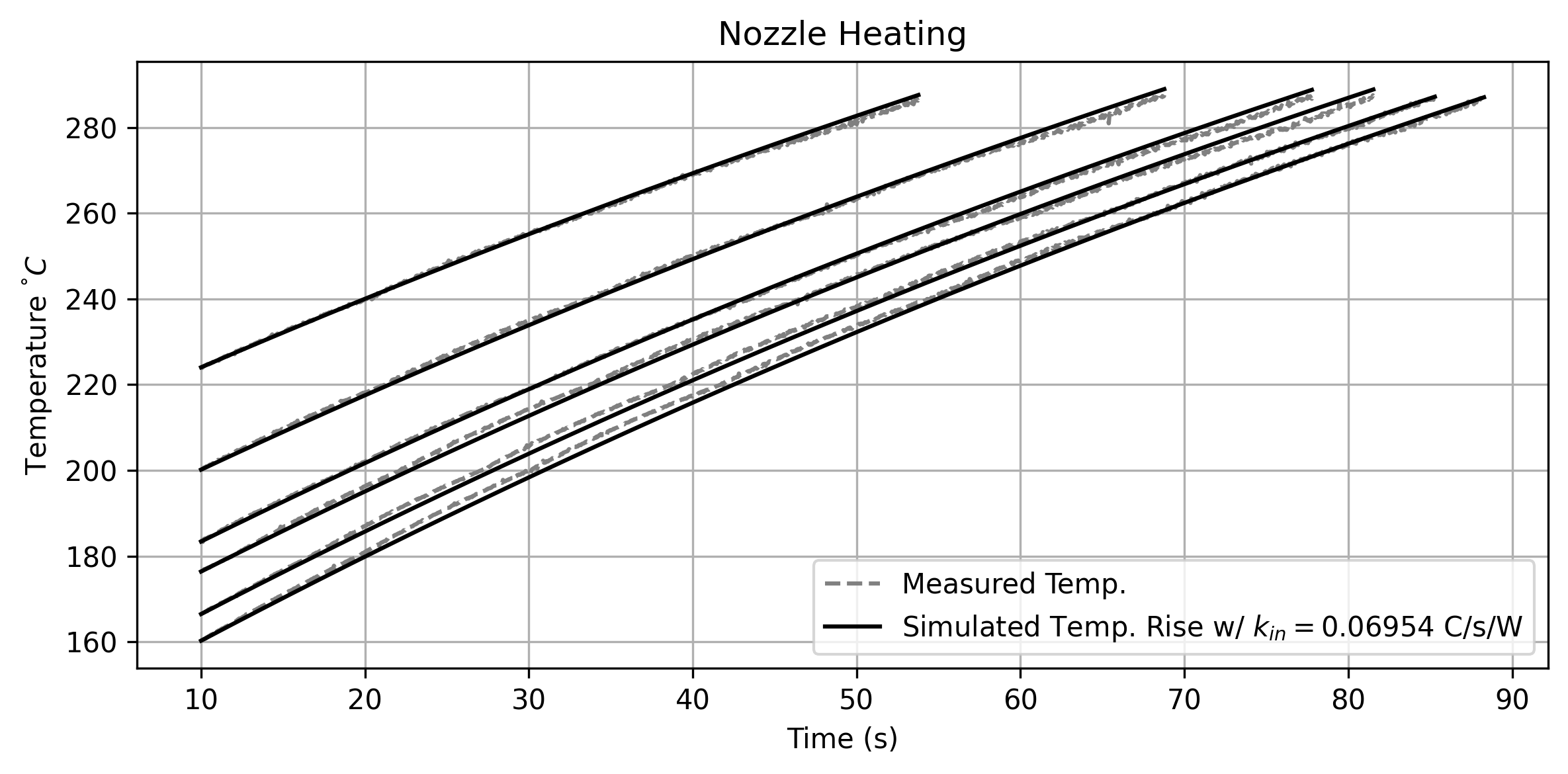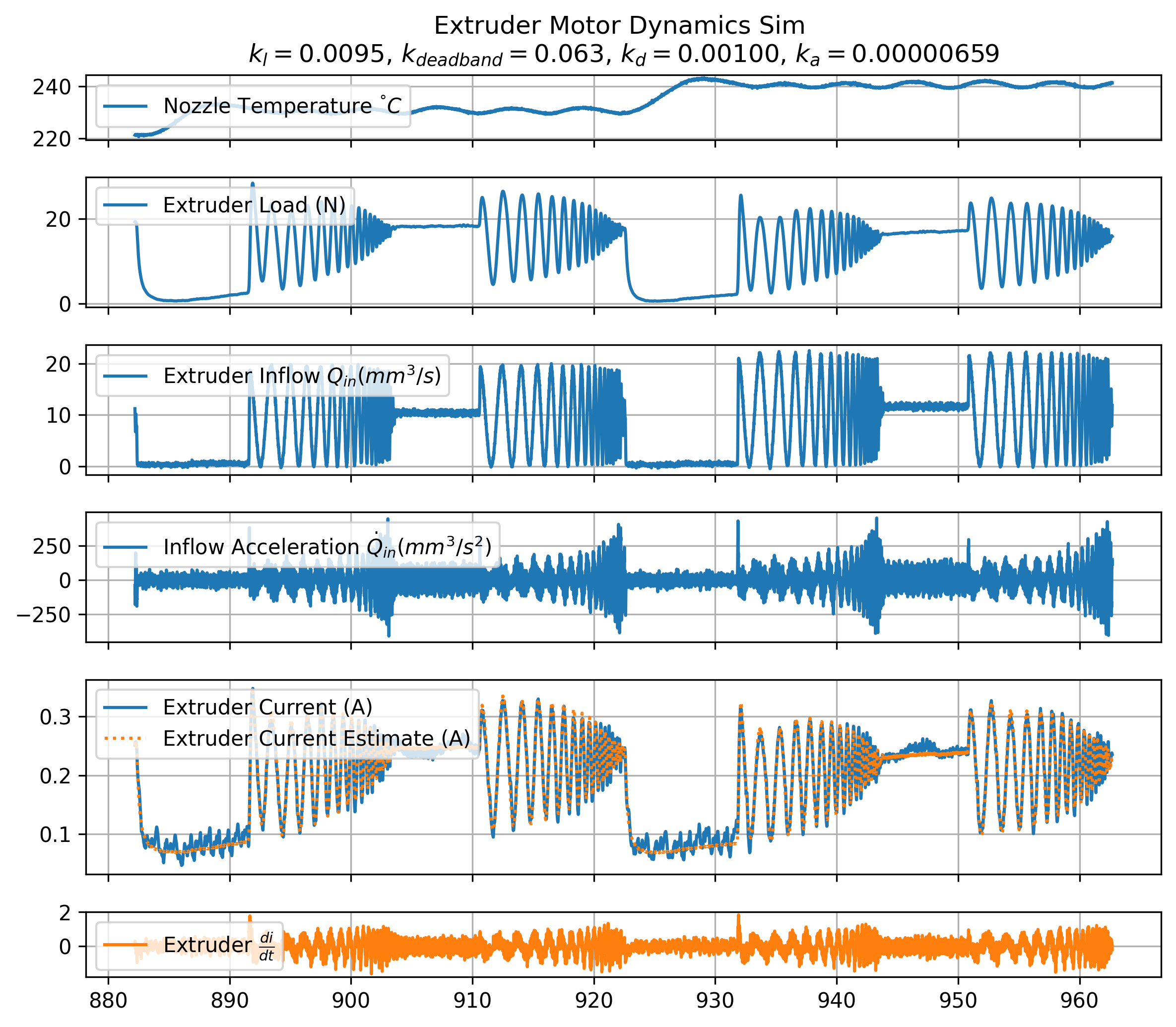 Here’s another upside for this task: nozzle thermal control is still done mostly with simple PIDs. Developing better controllers for the nozzle itself requires finding, again, those same parameters: heater block and nozzle heat capacities (and our existing power measurement) are critical also for feed-forward terms in thermal controllers. To date, these are not so important because we rely on the heat capacity in the heater block being much larger than that of the melt flow to simply smooth all of this out - then just about any PID gains will work well enough to keep the nozzle at the setpoint.