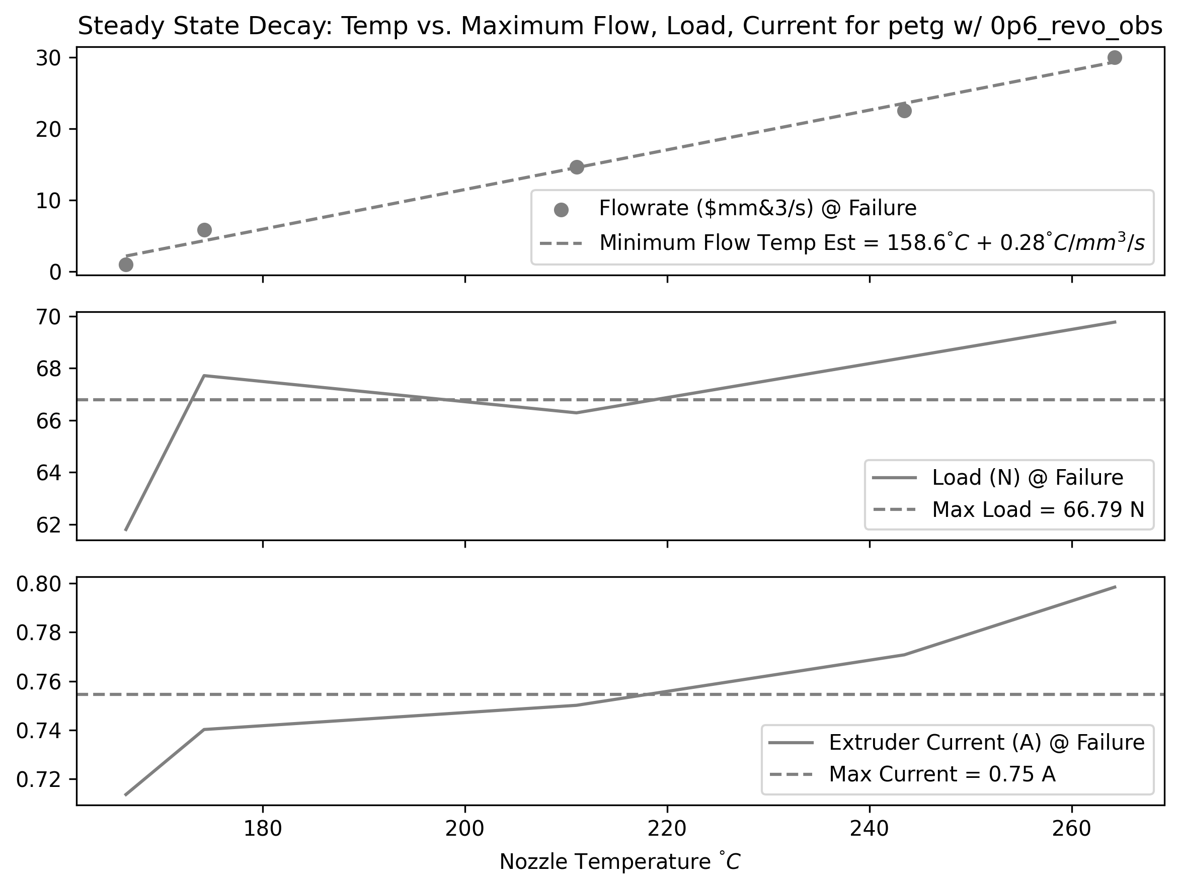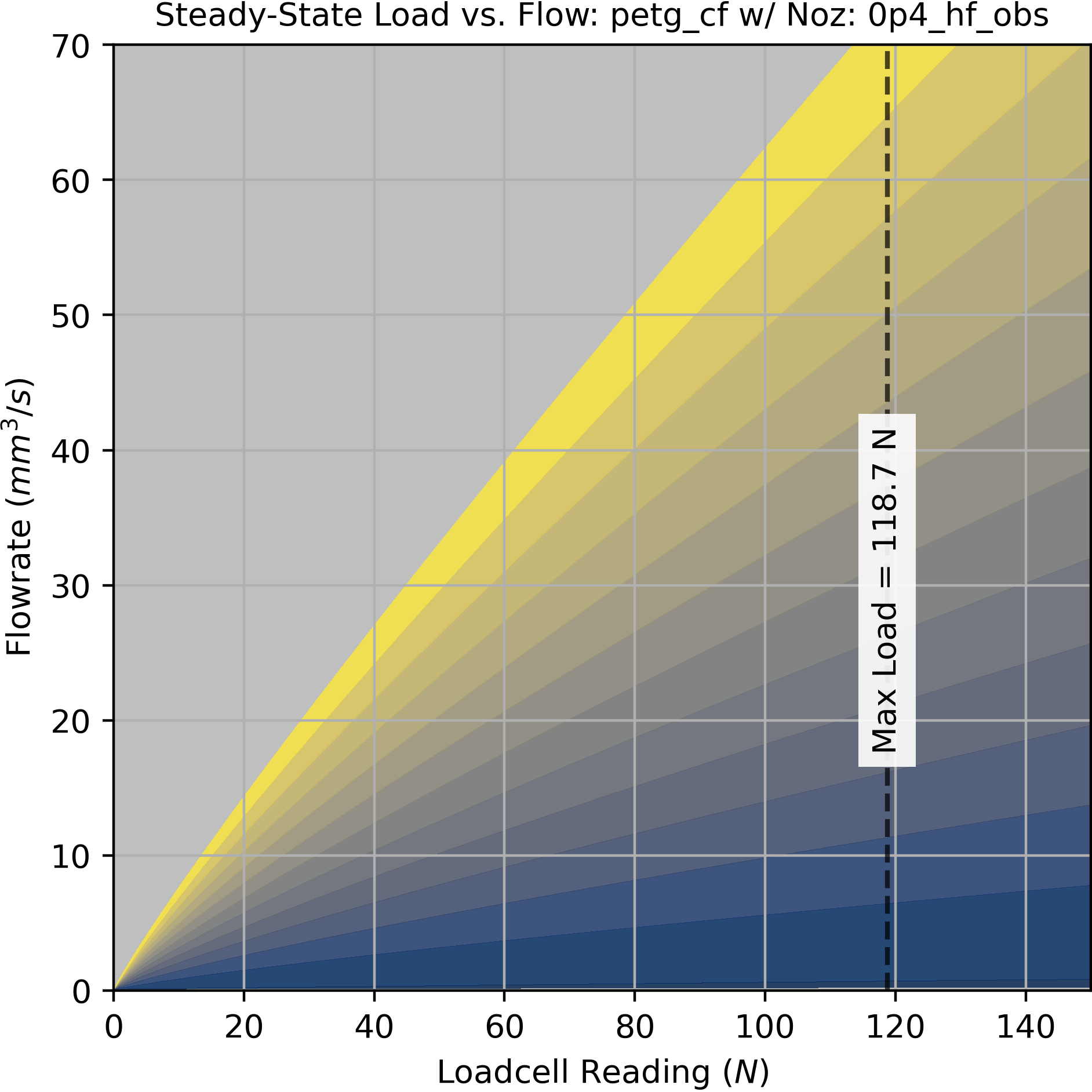 Before I started this project, I assumed that filaments with fiber fill (carbon or glass) were overall harder to print. Looking at their flow models, I was surprised to see that filled materials actually tend to have favourable flow properties. Models for PETG (without, and with) carbon fill are shown below, both with the same nozzle.