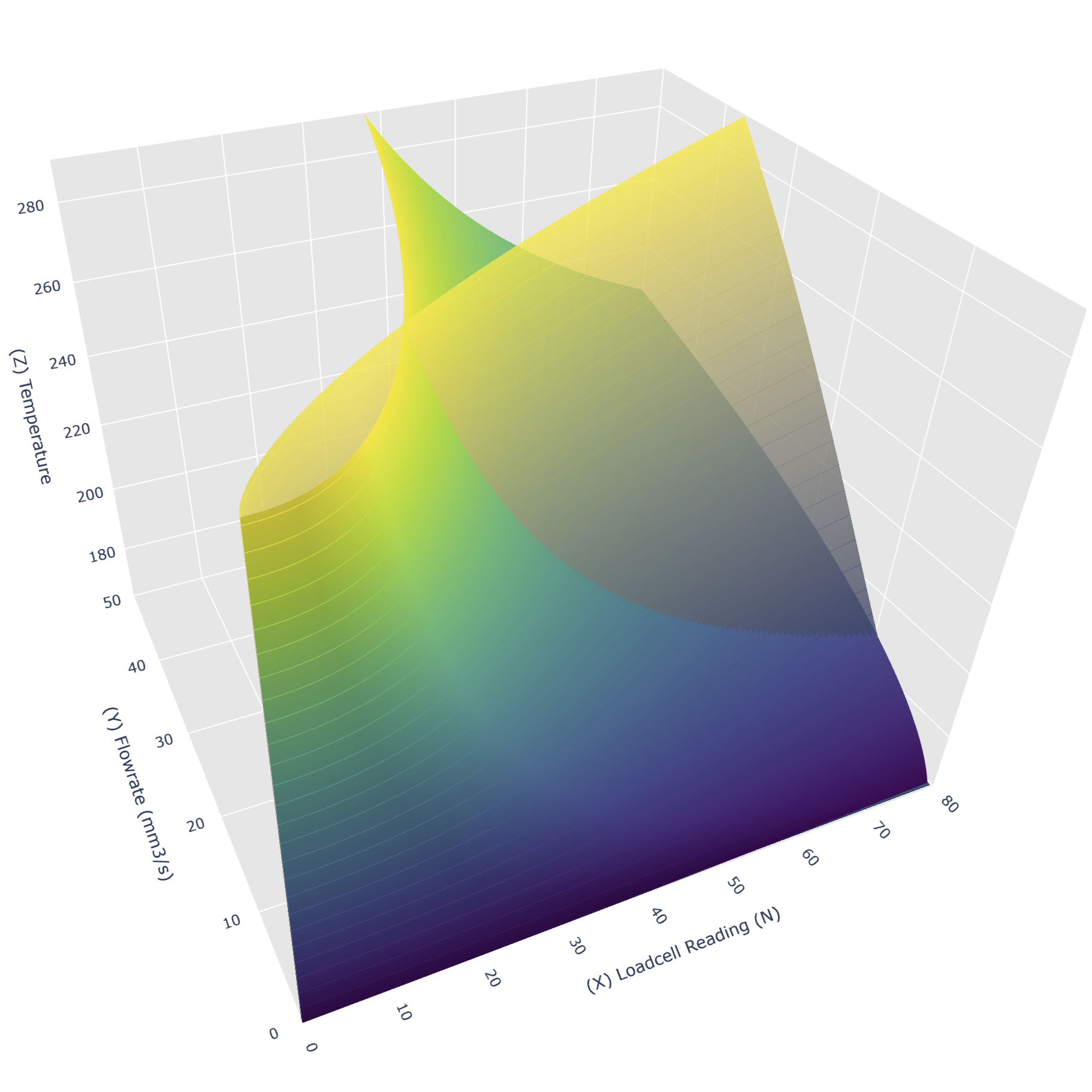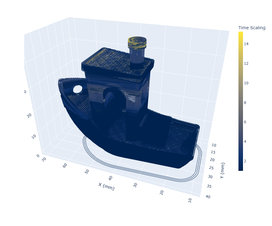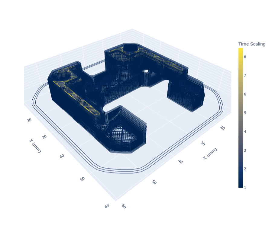 We could also develop this more completely to scan a print from bottom to top layers, analysing an ideal temperature for each layer such that print speed is maximized while the layer is sufficiently cool before the next begins. For example a print with large layers near the bottom and small near the top should begin with large nozzle temperatures and slowly cool as it approaches the small, detailed sections. This would require models not only for part cooling, but for the available thermal ramp rates of the nozzle. New printers are also being developed that use induction heating of the nozzle which greatly reduces thermal mass and enables much faster thermal response. These could be exploited to very quickly change nozzle temperature layer-to-layer or even feature-to-feature in a print. Lookahead solvers that account for short-term dynamics (acceleration, pressure) and longer-term dynamics (thermals) could presumably be developed to suit.