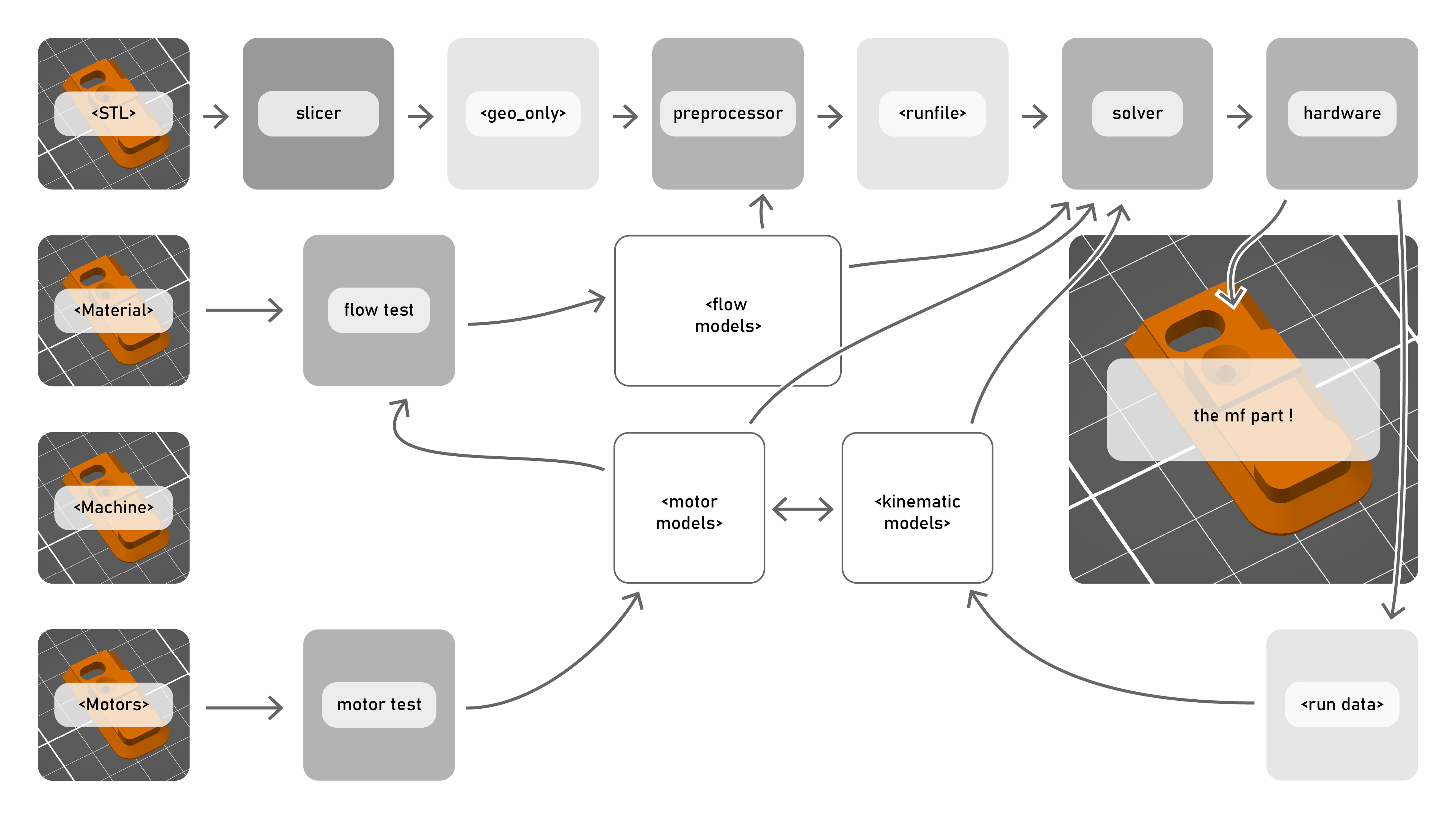 Rather than setting low-level parameters explicitly, this workflow uses models to pick those parameters. I do not take on the task of generating path geometry, instead focussing mostly on the parts of the problem that combine motion and flow optimizations, i.e. speed selections. While geometry and motion are of course coupled in reality, we can safely generate one part geometry and print it in multiple materials so long as we adjust our rates accordingly.