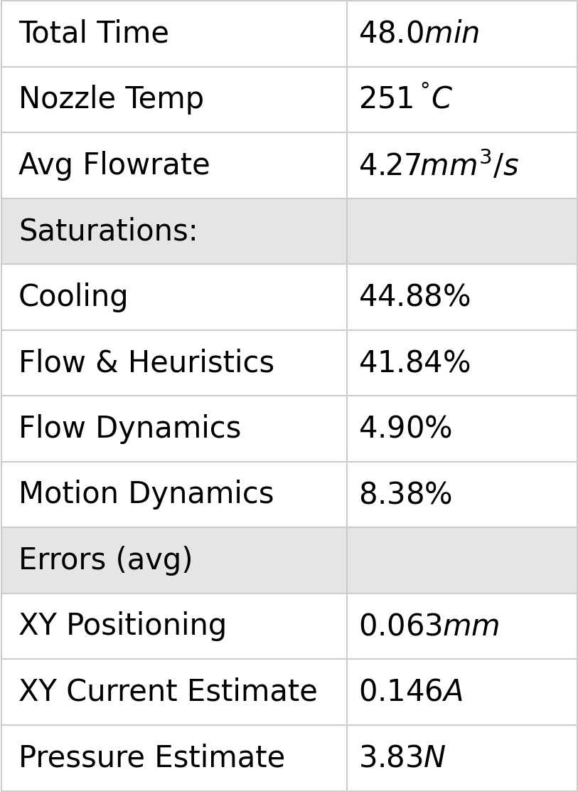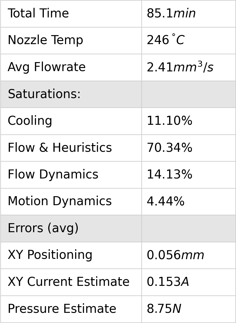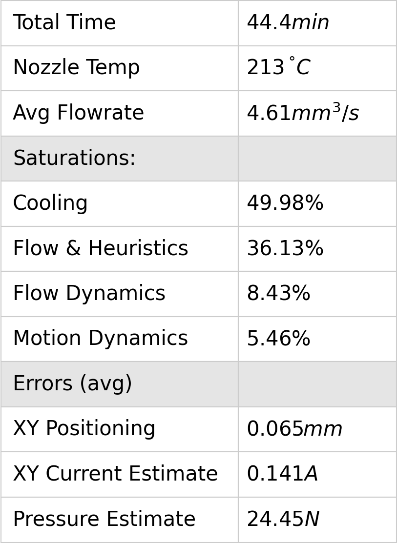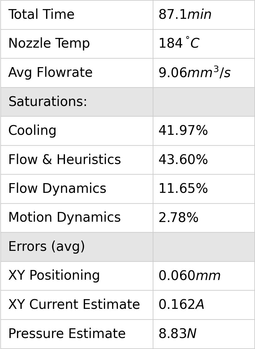 | Solid Infill | \(20 - 250\) | \(mm/s\) | Motion, Flow |