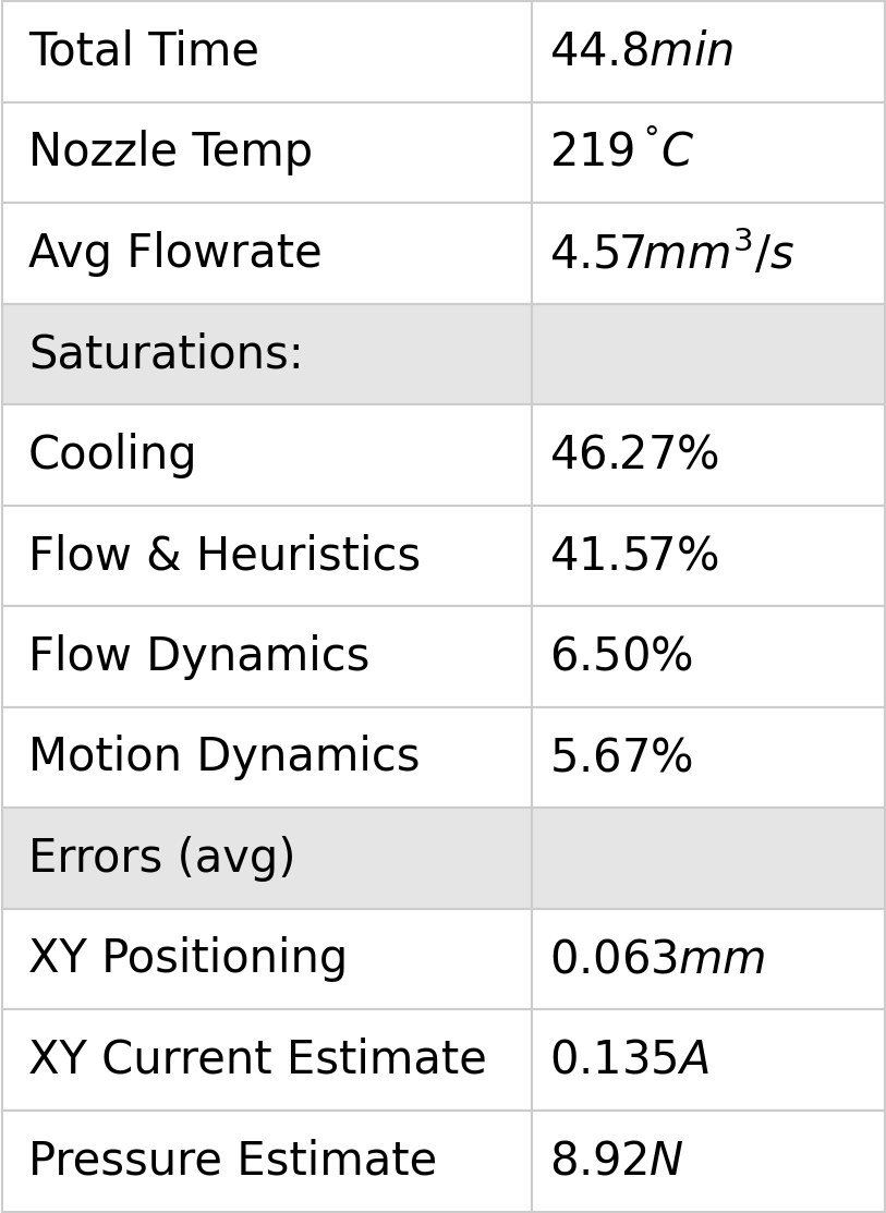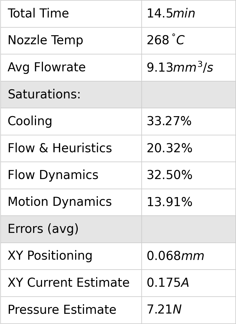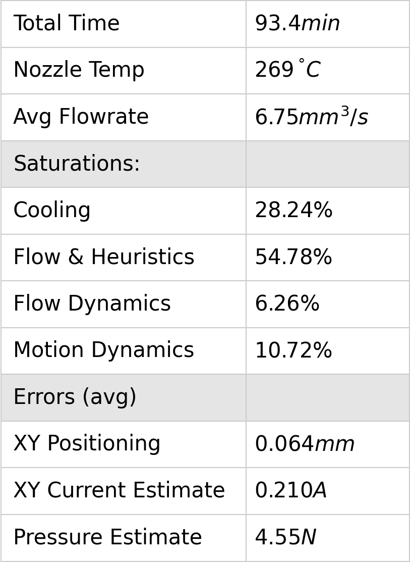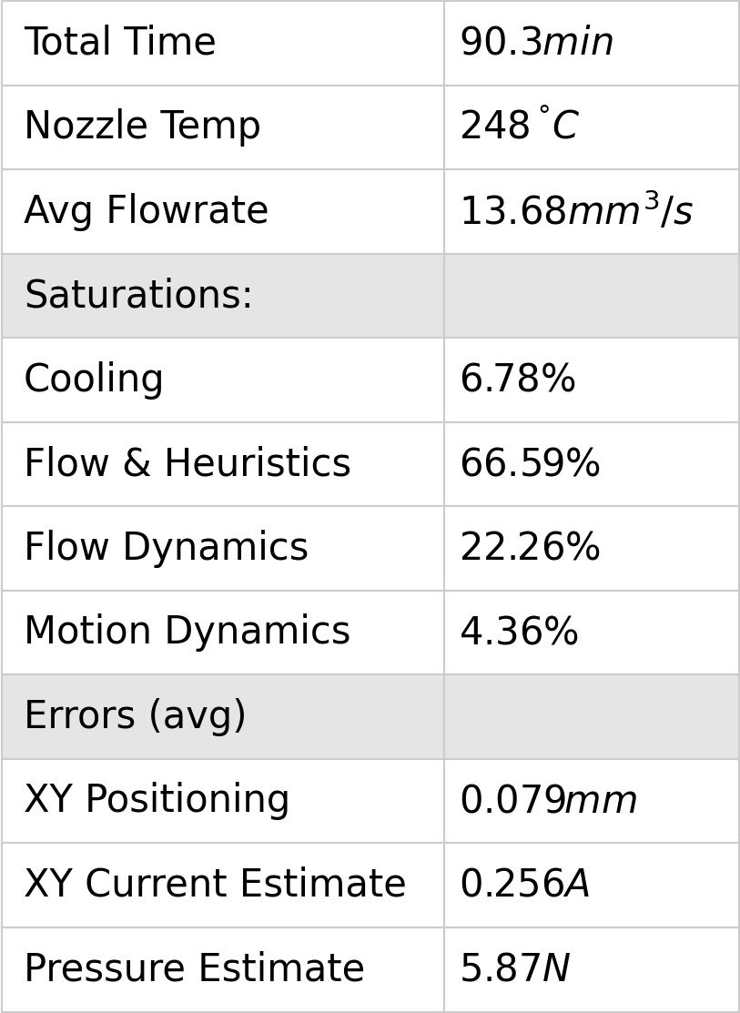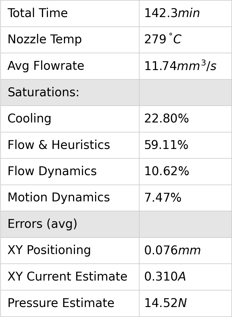 | Solid Infill | \(20 - 250\) | \(mm/s\) | Motion, Flow |