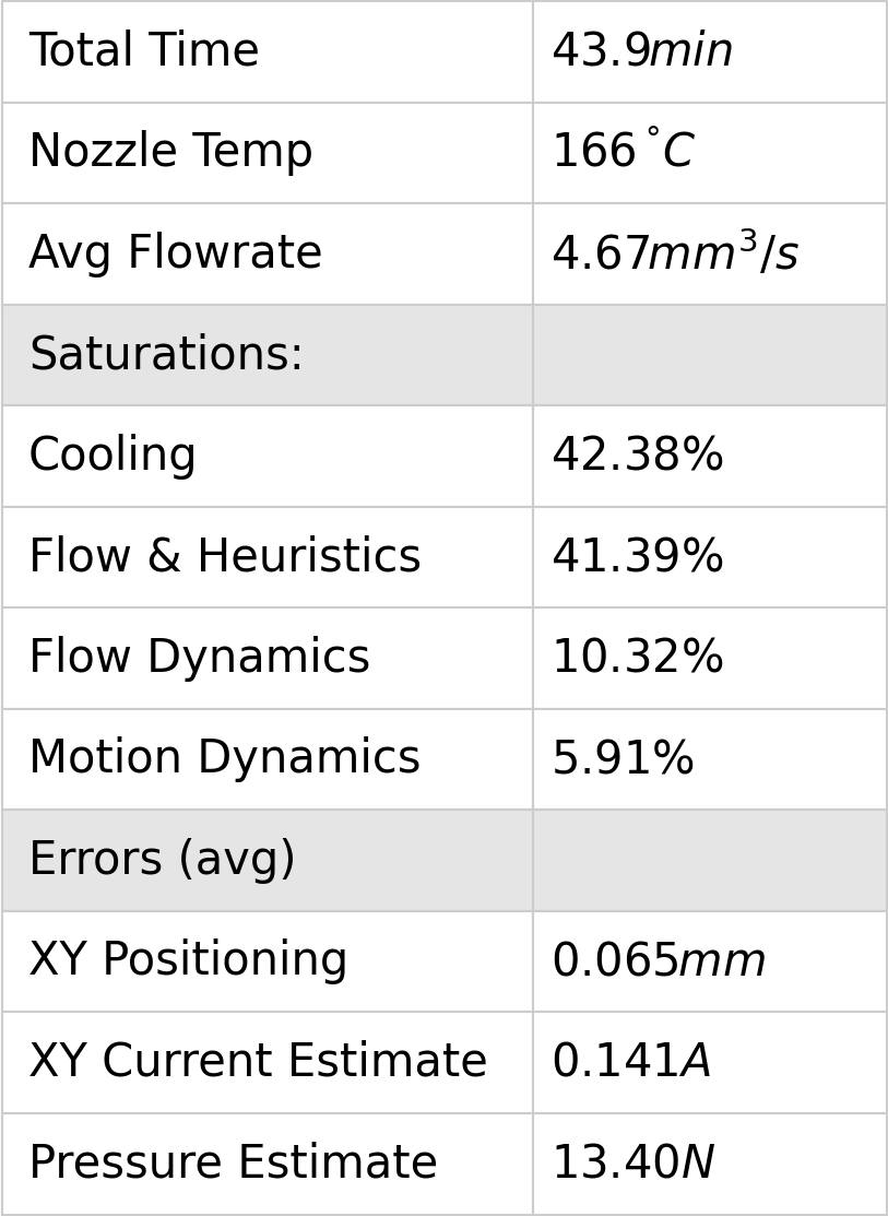 | Infill | \(2000 - 10000\) | \(mm^2/s\) | Motion, Flow |