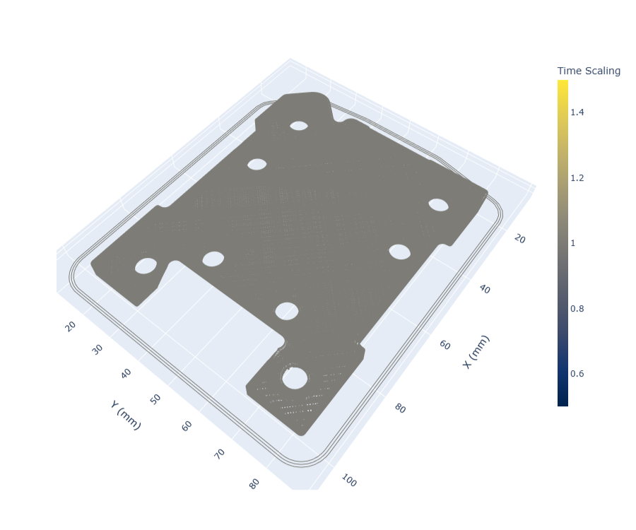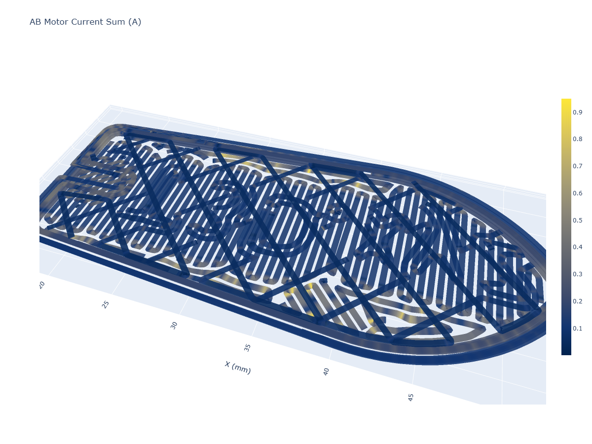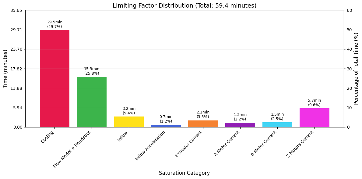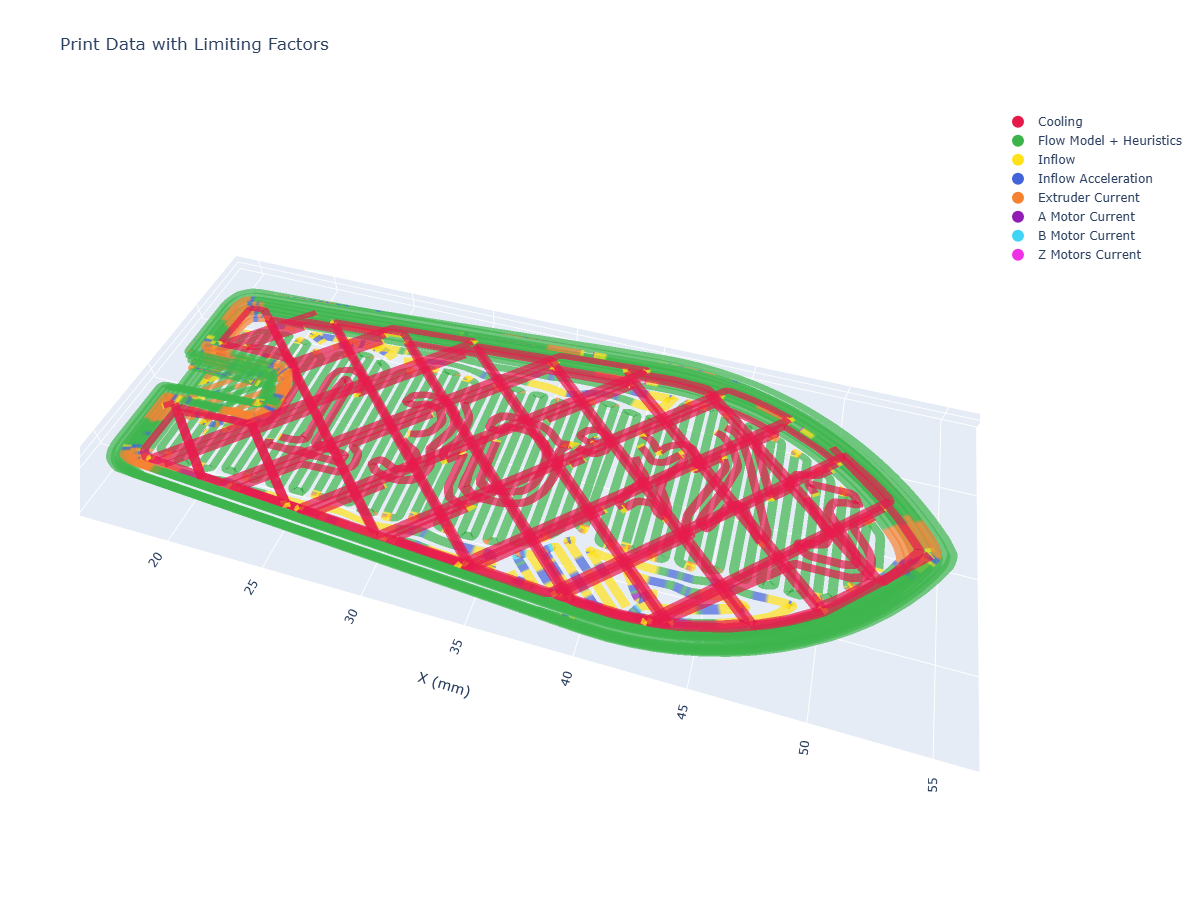 To generate these outputs, we compare time series data of each component’s outputs state with the relevant limit, for example motor current utilization vs. the maximum current available at that time. Each segment has a maximum velocity set via flow models and related heuristics, when that velocity is saturated we know that nothing else is constraining speed - and when that velocity has been scaled to meet a minimum layer cooling time, we know that the part cooling model has limited speed at that point.