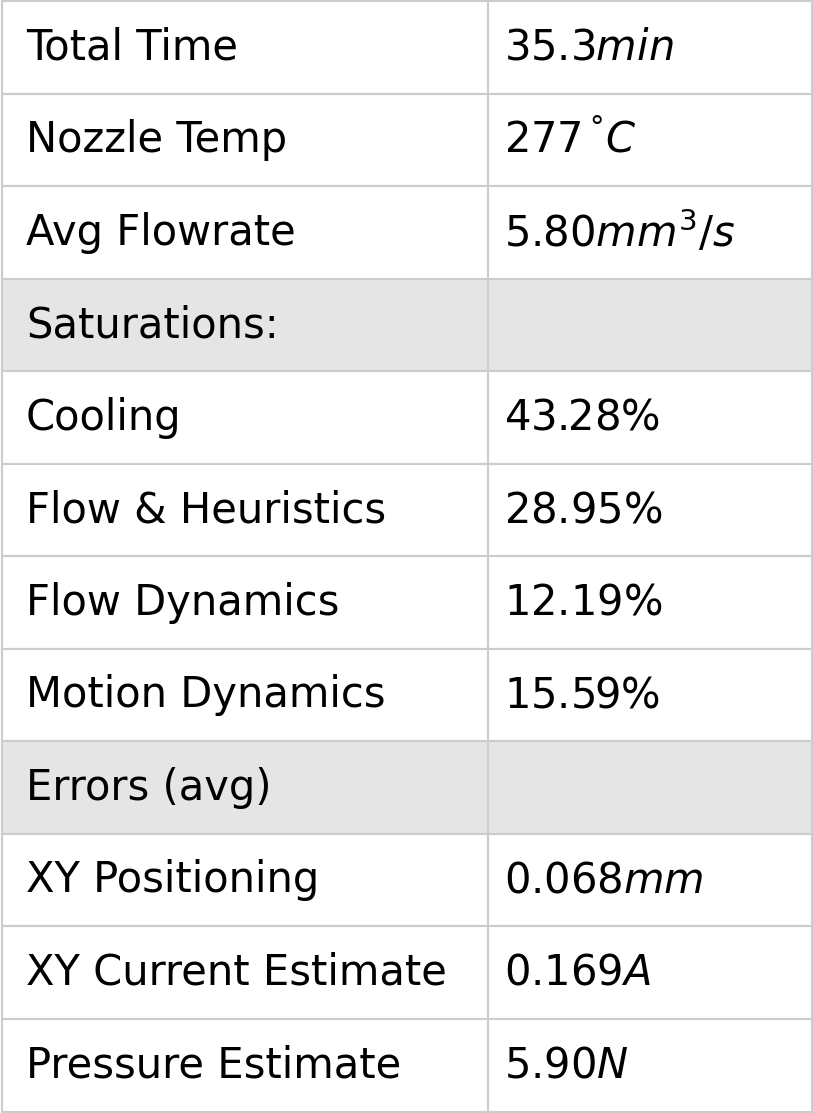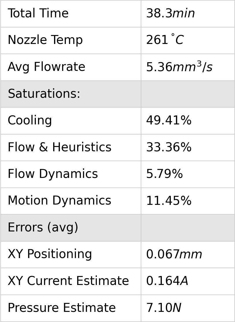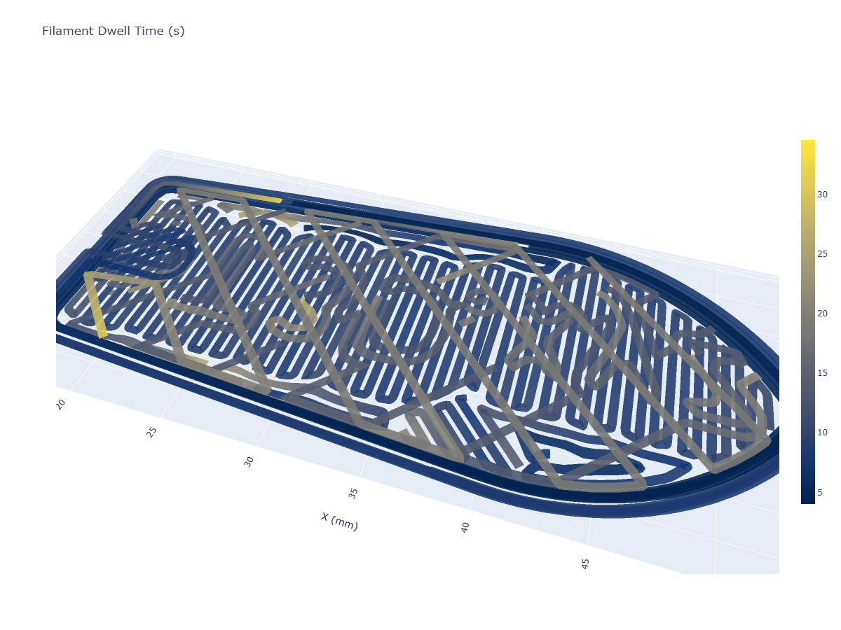 To generate these outputs, we compare time series data of each component’s outputs state with the relevant limit, for example motor current utilization vs. the maximum current available at that time. Each segment has a maximum velocity set via flow models and related heuristics, when that velocity is saturated we know that nothing else is constraining speed - and when that velocity has been scaled to meet a minimum layer cooling time, we know that the part cooling model has limited speed at that point.