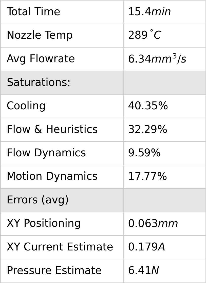 | Infill | \(50 - 350\) | \(mm/s\) | Motion, Flow |