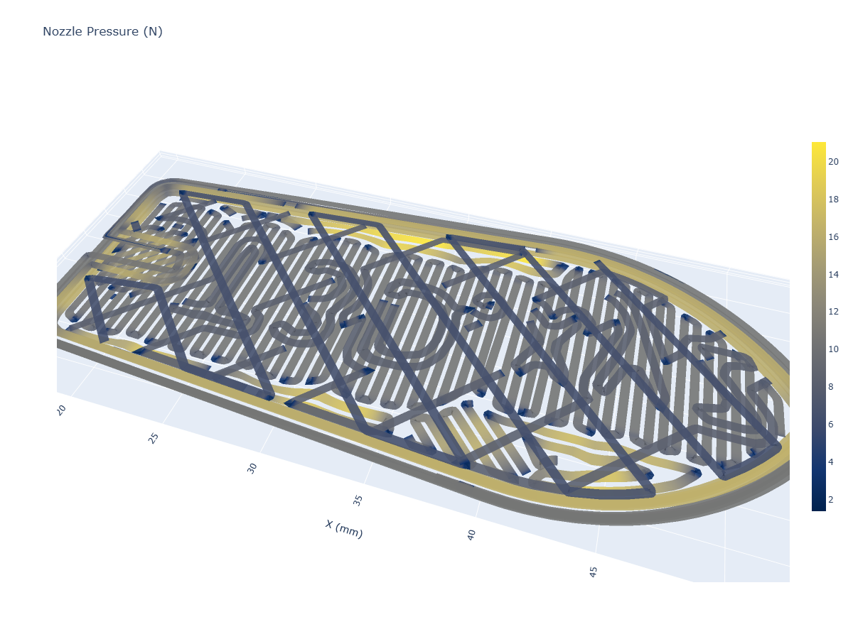 For example if we double the layer height but retain the same speeds we double the flowrate of the polymer melt: this has huge ramifications for the physics of the process, but that is not reflected anywhere else in the parameter set. Manually changing print speeds to reflect the new layer height would mean updating nine other parameters (excluding those that can be set by a percentage). Nor are those parameters related to longer-term outcomes like the resulting thermal history of the print’s inter-layer joints, which are a main indicator of part strength (Coogan and Kazmer 2020). Inversely, if we increase the nozzle temperature we often unlock more flow rate, but there is no way to update print speeds as a function of temperature, or increase layer cooling time. Instead of having any knowledge of print physics built into the slicer, users need to intuit how these many parameters will relate to the machine’s operation.