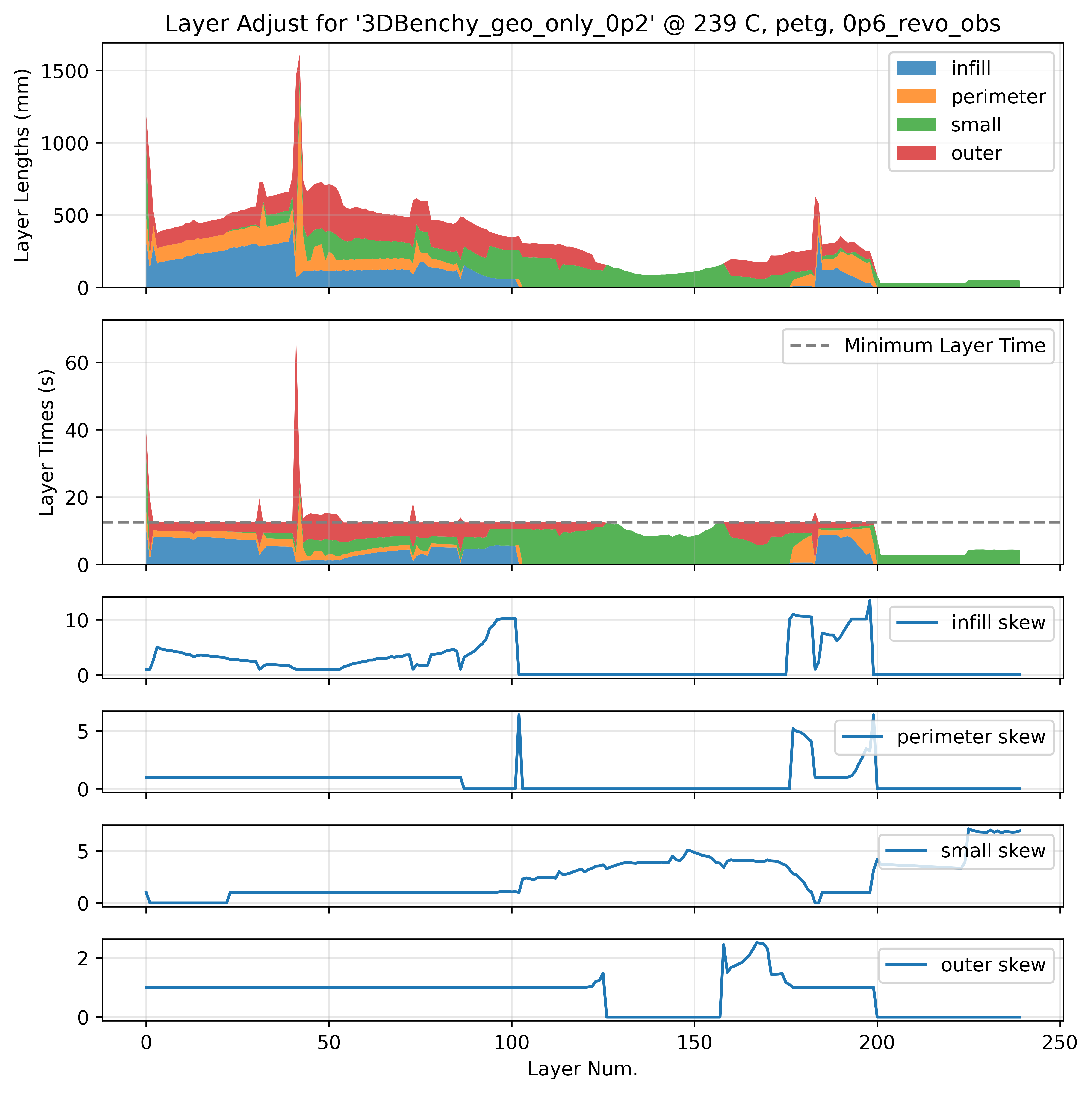 While I do not develop this, could formulate trade-offs for precision, speed and layer strength by defining optimal results for each. Optimal speed is obvious: we measure total time. Overall precision is a strong function of our cooling target (and overall flow speeds, slower flows being more predictable). Layer adhesion / part strength is a function of the layer interfaces’ thermal history, which I have shown can be modelled ~ basically just using layer times (we just need to integrate interface temperature over time). What is missing from the current work is a characterization of how much layer strength is gained from a given increase in interface temperature / time, and how much precision is gained from slowing down and over-cooling parts. However, I think that good heuristics could be developed in these cases, and the literature contains a slew of studies on each topic.