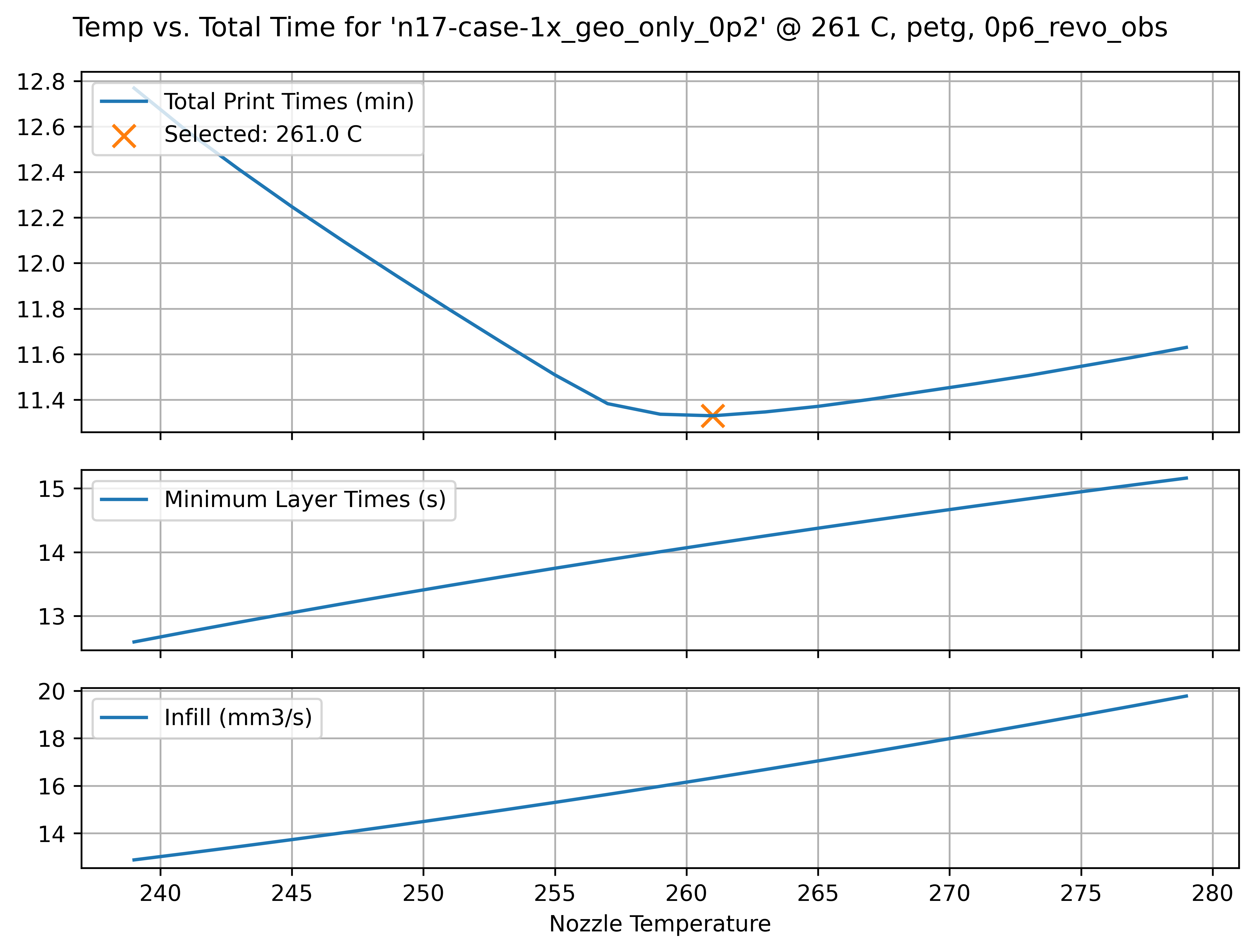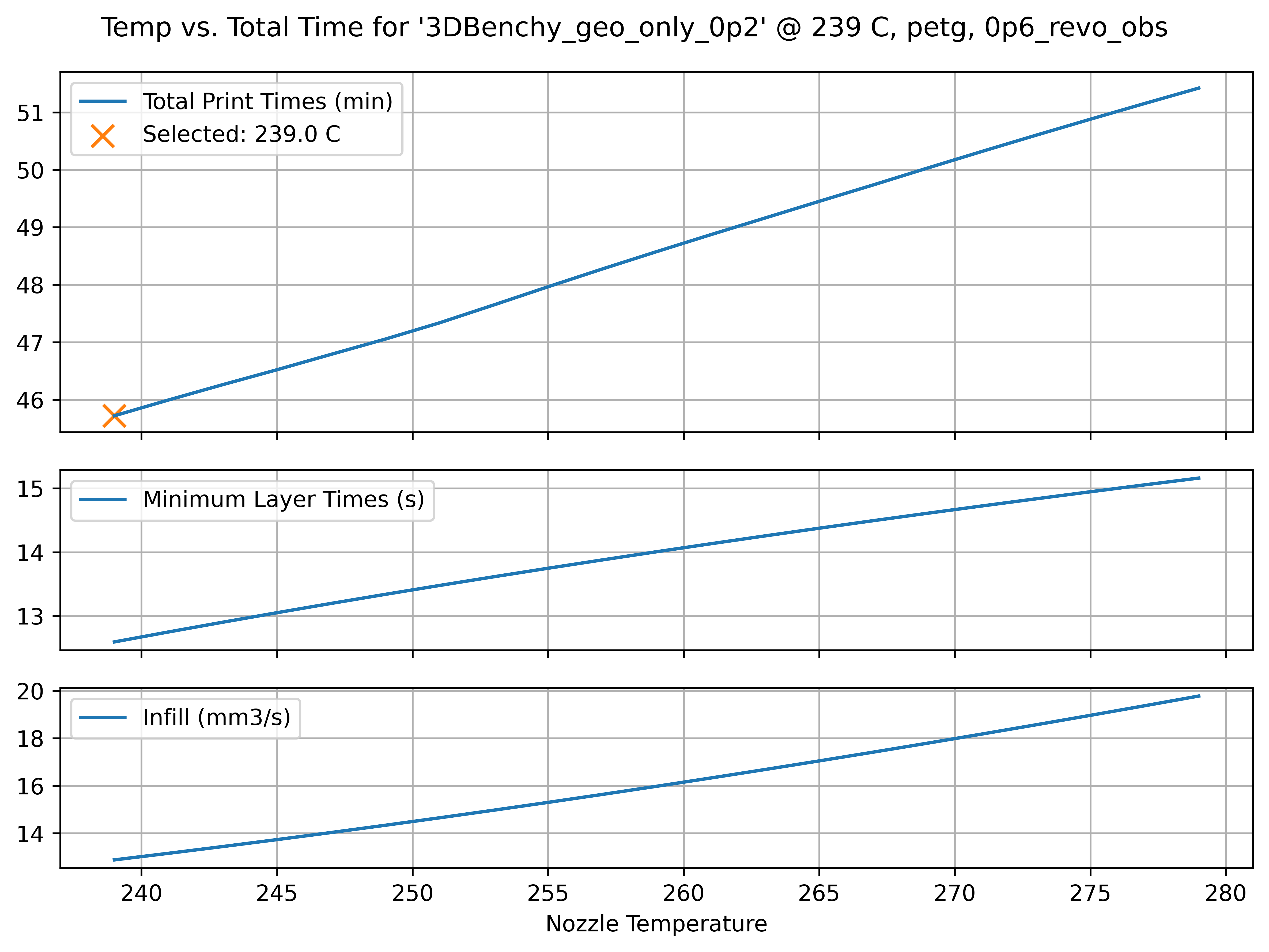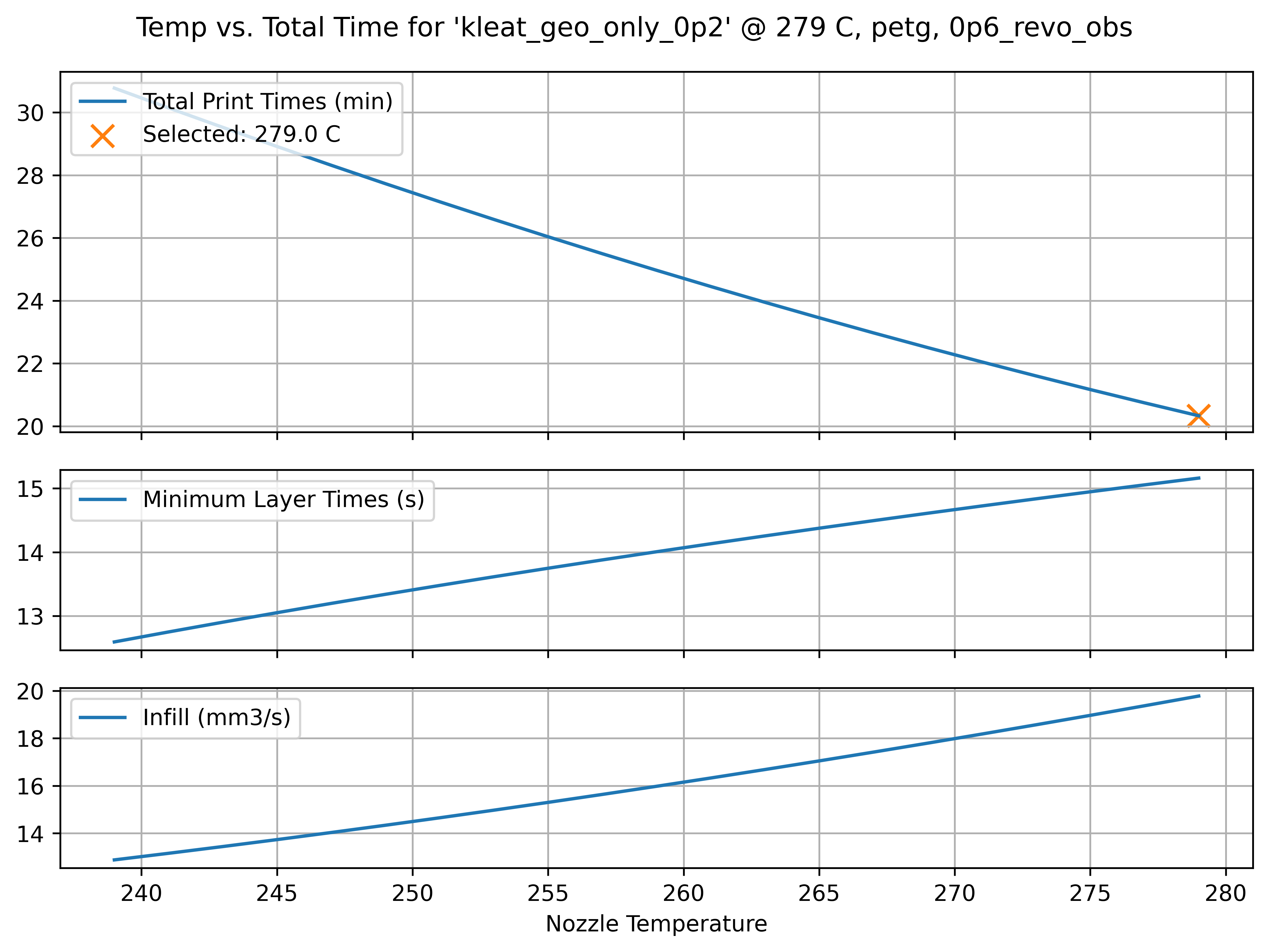 The key tuning knob in the optimum nozzle temperature step is picking our target layer temperature \(T_{targ}\) - if we favor “hot and fast” prints that may be somewhat slumped (but stronger), we can dial this up: the minimum-time optimization will be penalized less for warmer flows (as minimum layer times will be shorter). If we want precision above all, we can turn this down and we will see the opposite result. This makes up one axis in a theoretical pareto frontier, which trades strength (at the cost of precision) for speed.