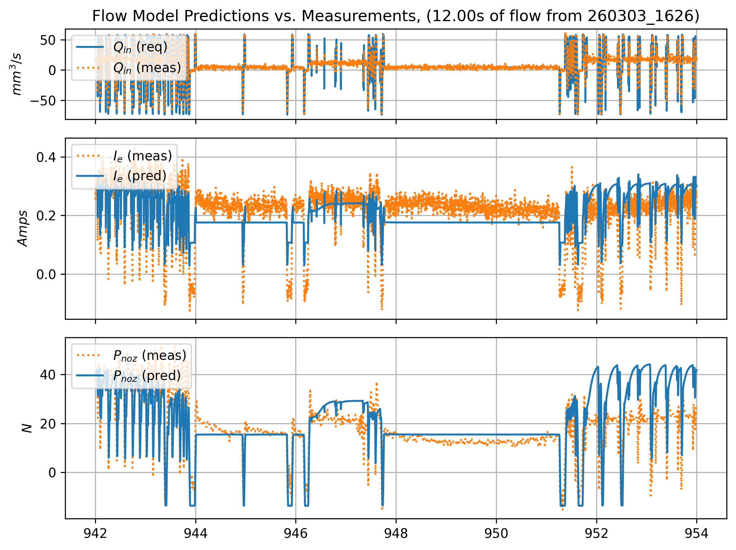 Flow models are typically accurate only to 5-per-cent or so, and can be particularely bad over certain intervals in a part. I tally total model performance, per part, in the tables beside each print output (measuring average deviation of the pressure prediction from reality over the course of the print). Below, I show a time-series slice of data from the pressure system. We can see divergence in values for the extruder and pressure measurements, and even divergence in phenomenology.