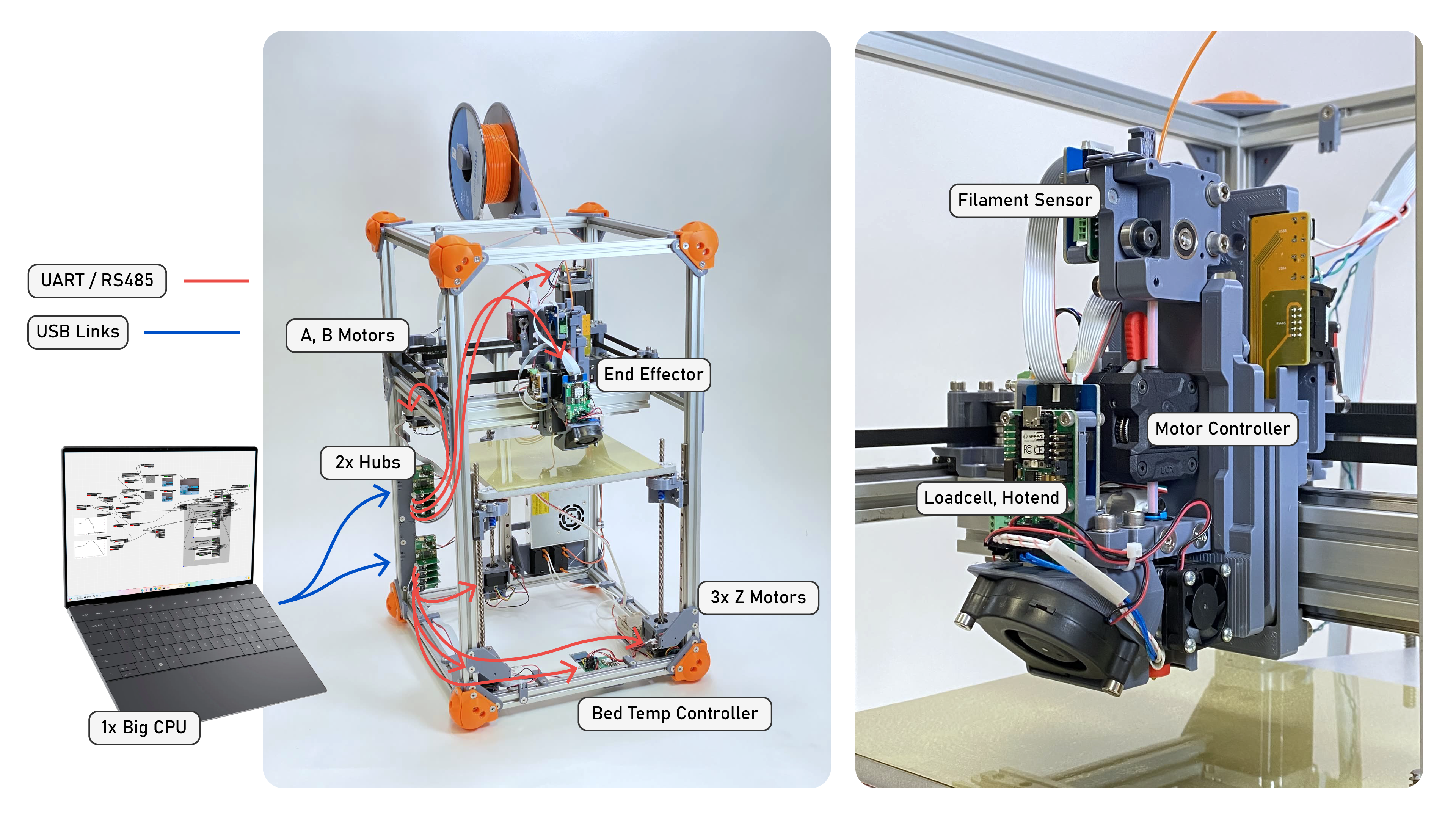 Accomplishing these goals takes a few steps. In Section 6.4 I build two instrumented machines that modify state of the art FFF hardware, enabling them to build as well as use models. The first was a development mule. The second is a modified off-the-shelf machine that demonstrates how the work in this thesis can be implemented without requiring that we rebuild our machines themselves. It also serves as a 1:1 comparison to state of the art workflows.