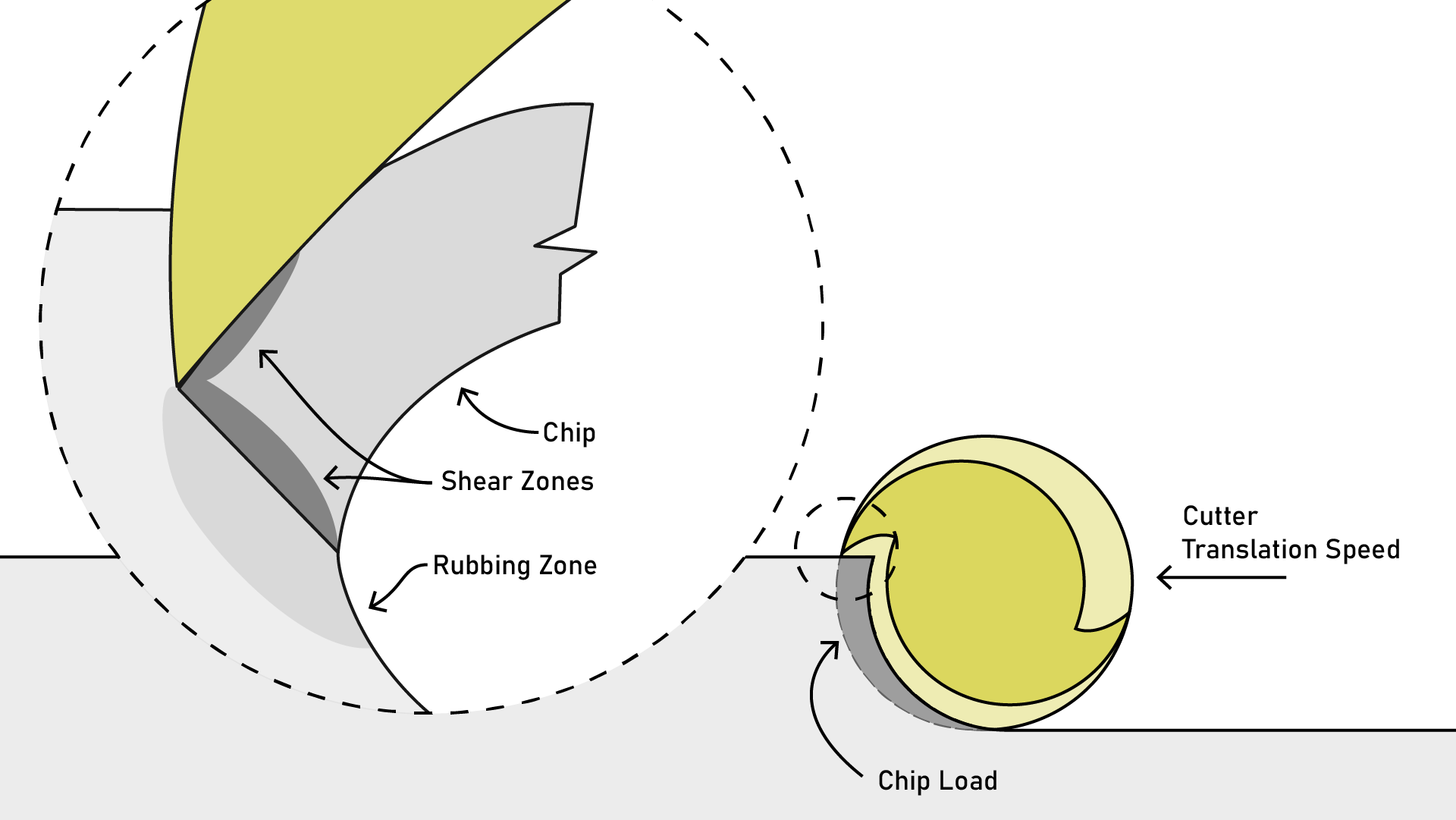 Another important parameter is surface speed, which is the speed which the flute edge passes by the material being cut. It is a function of tool diameter and spindle RPM. Physically, this is related to the shear rate in the material as it is being separated from the work piece. Changes in shear rate affect chip formation: low shear rates tend to make larger chips (which can be difficult to evacuate from the work piece and can lead to “chip re-cutting”). Larger shear rates exert more total stress in the chip, leading it to break up into smaller chips that are more easily evacuated. The ideal shear rate for a cut is mostly a function of the material being cut and it’s temperature, but also of the tool geometry, sharpness and surface finish.