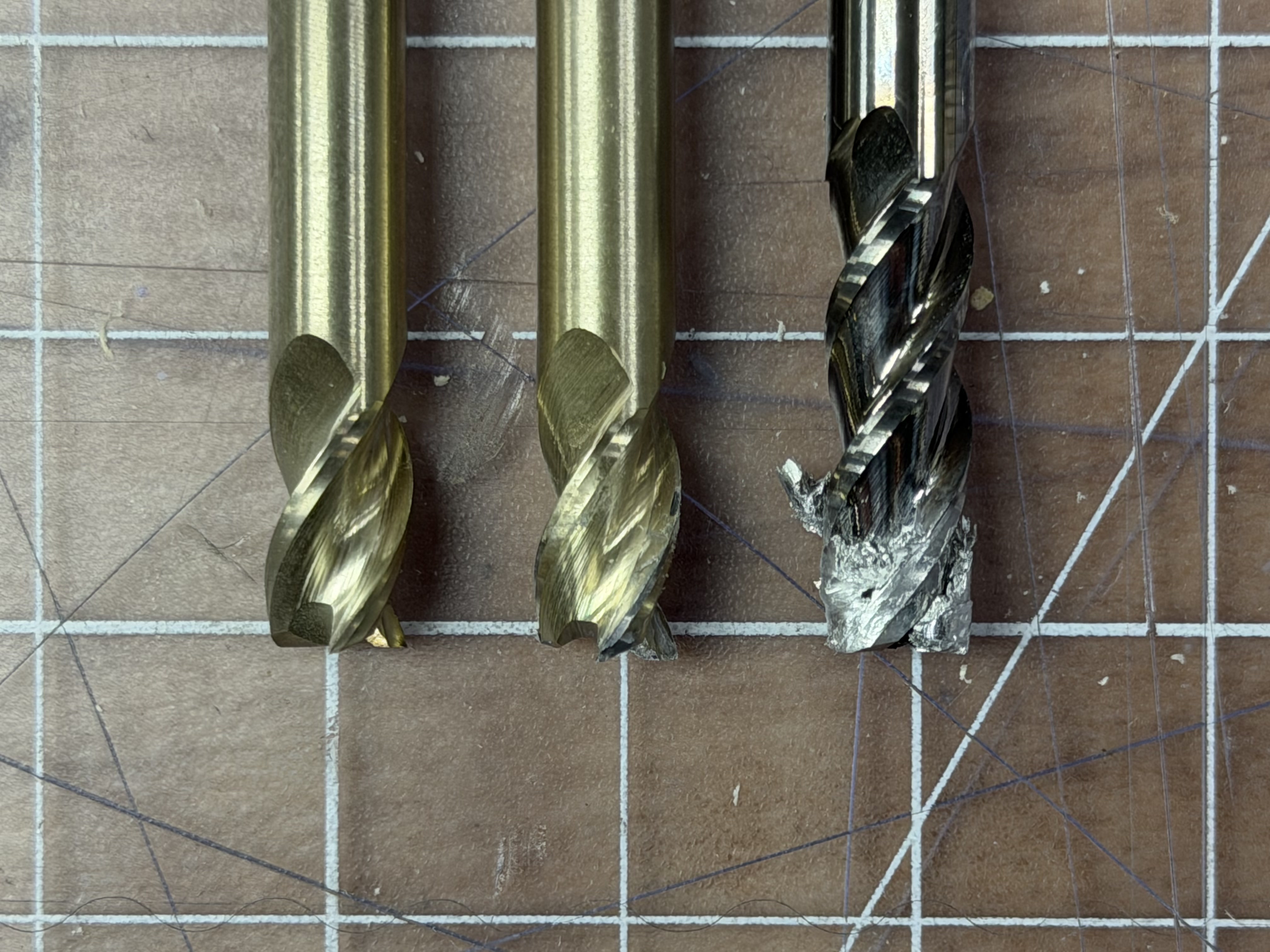 During the third test I had parameters set to the rates in the table above, except for the ramping feedrate, which I had lowered out of fear. This turned out to be the wrong intuition: the ramping rate, in combination with the higher spindle RPM, decreased the chip load such that the ramp failed again, melting the material rather than cutting it. The sacrificial endmill for this run is at right in Figure 7.2. I picked up on this for two reasons: (1) the endmill had obviously welded itself to the part and (2) the chips that were emerging at this point were much smaller than those that were thrown out of the part during the last successful cuts.