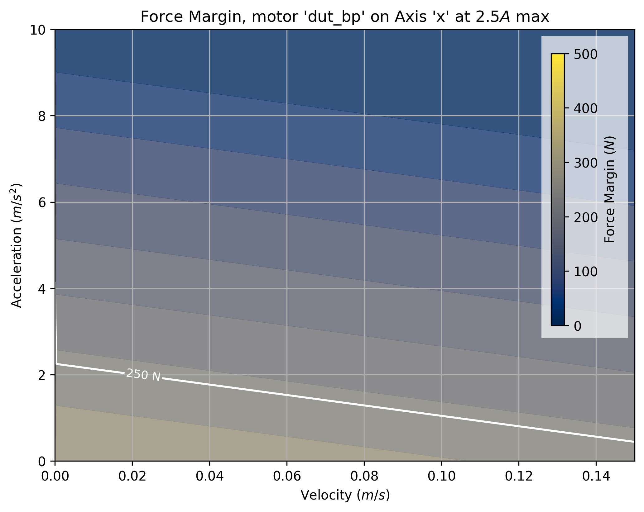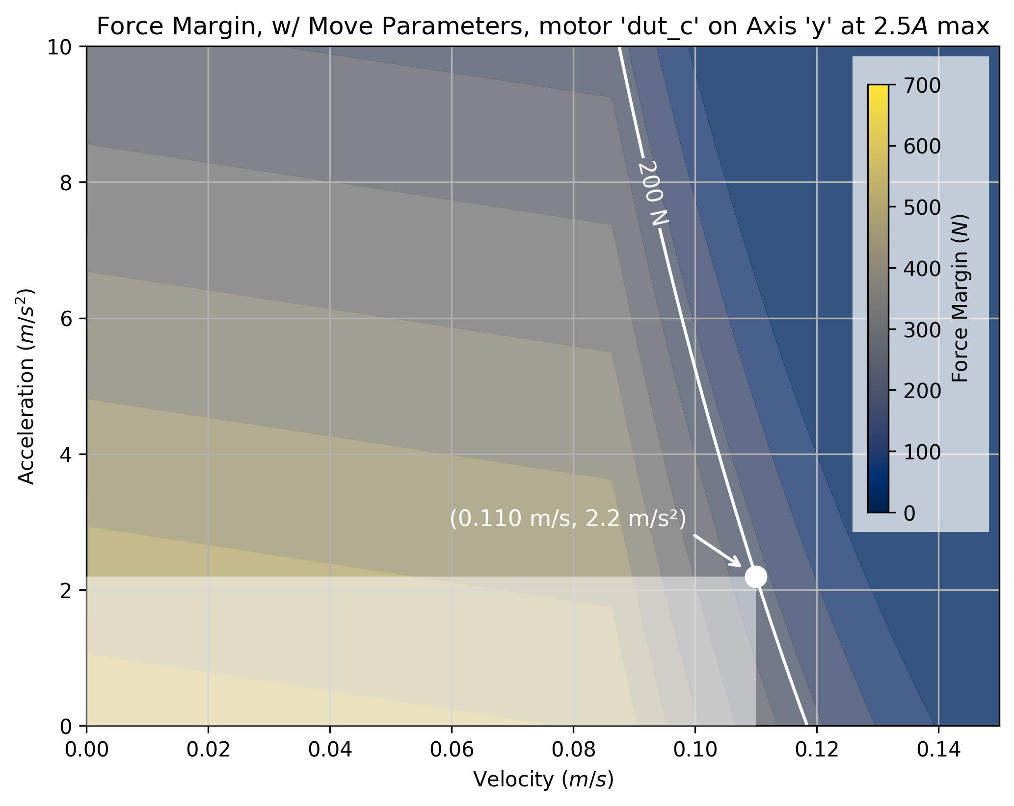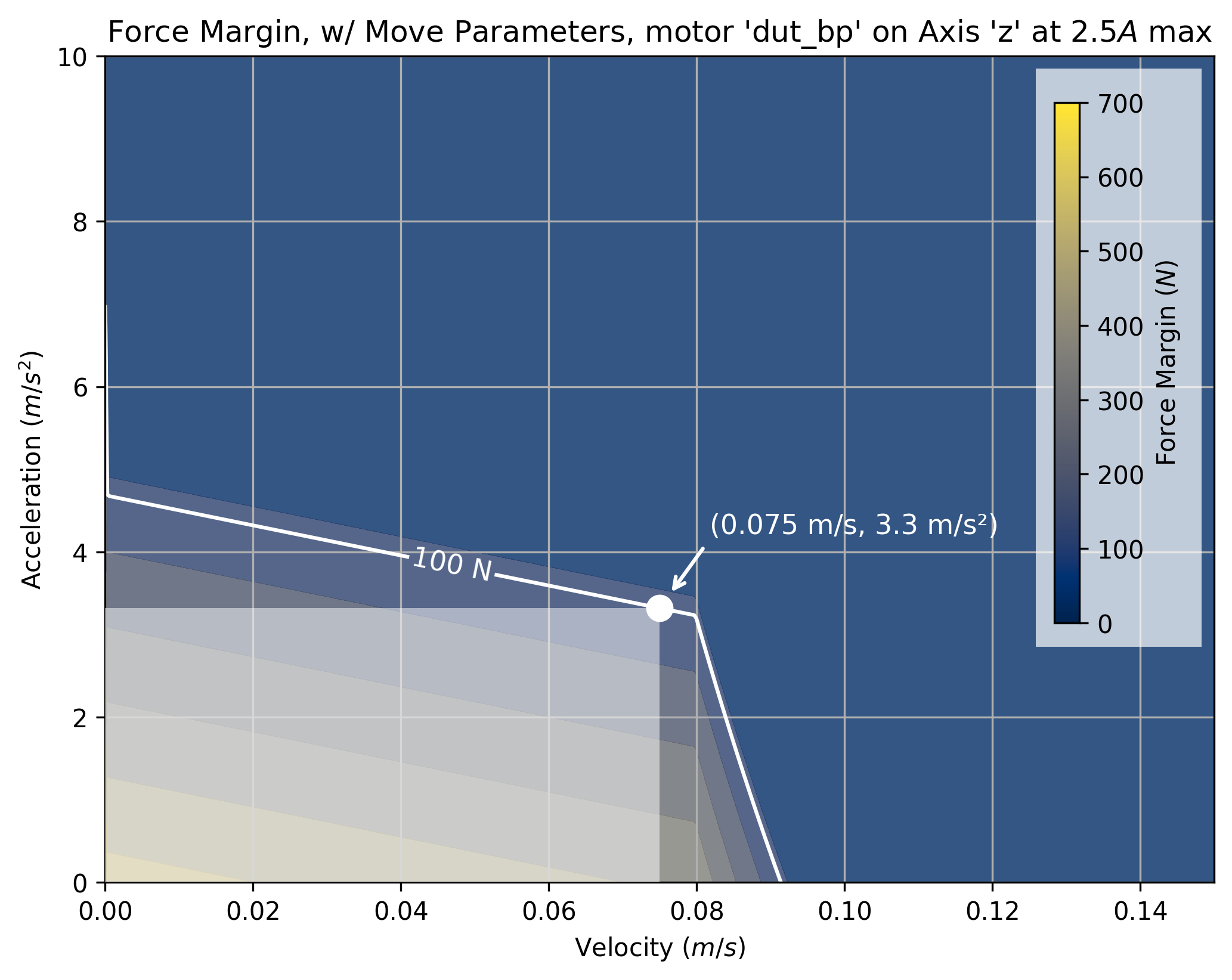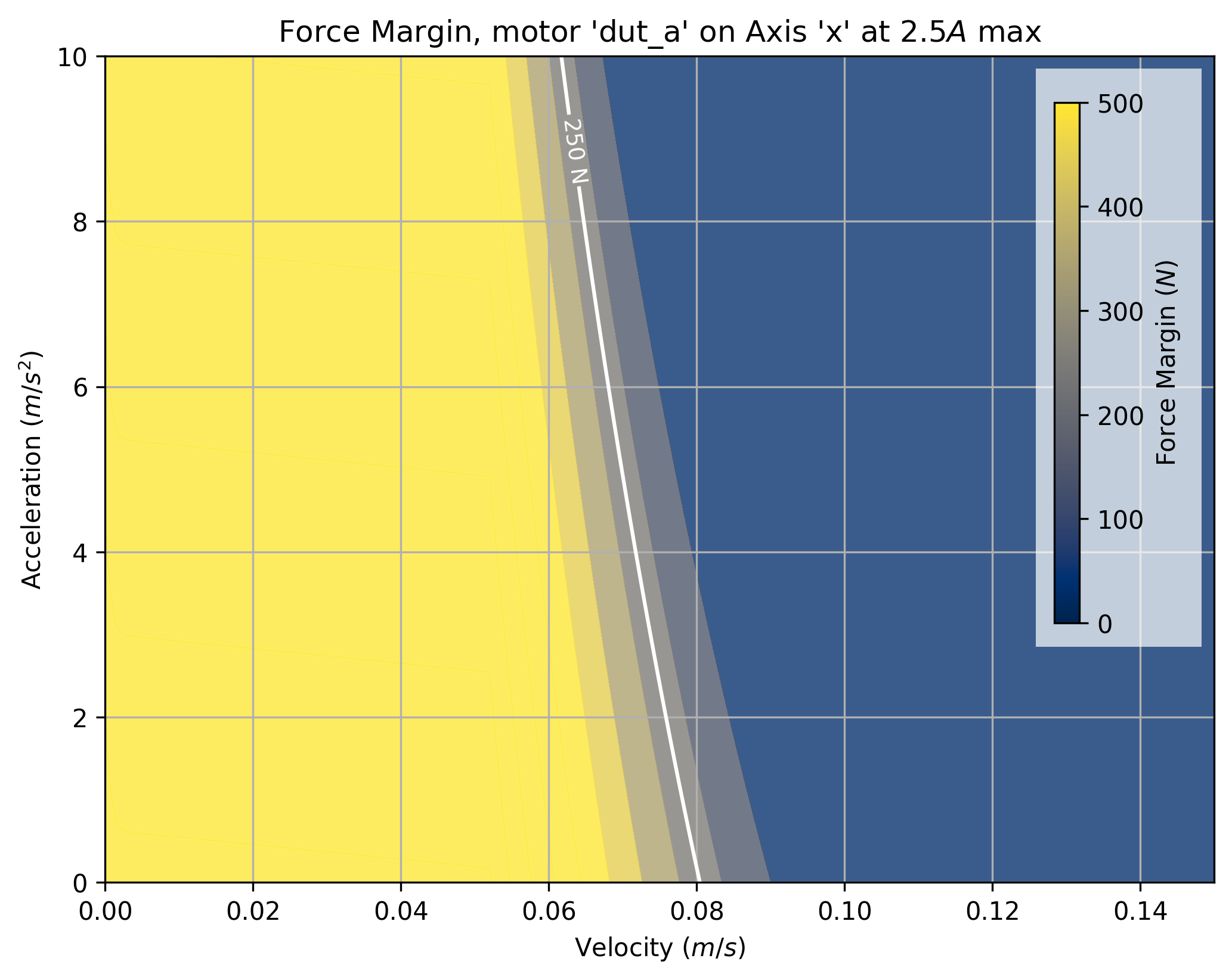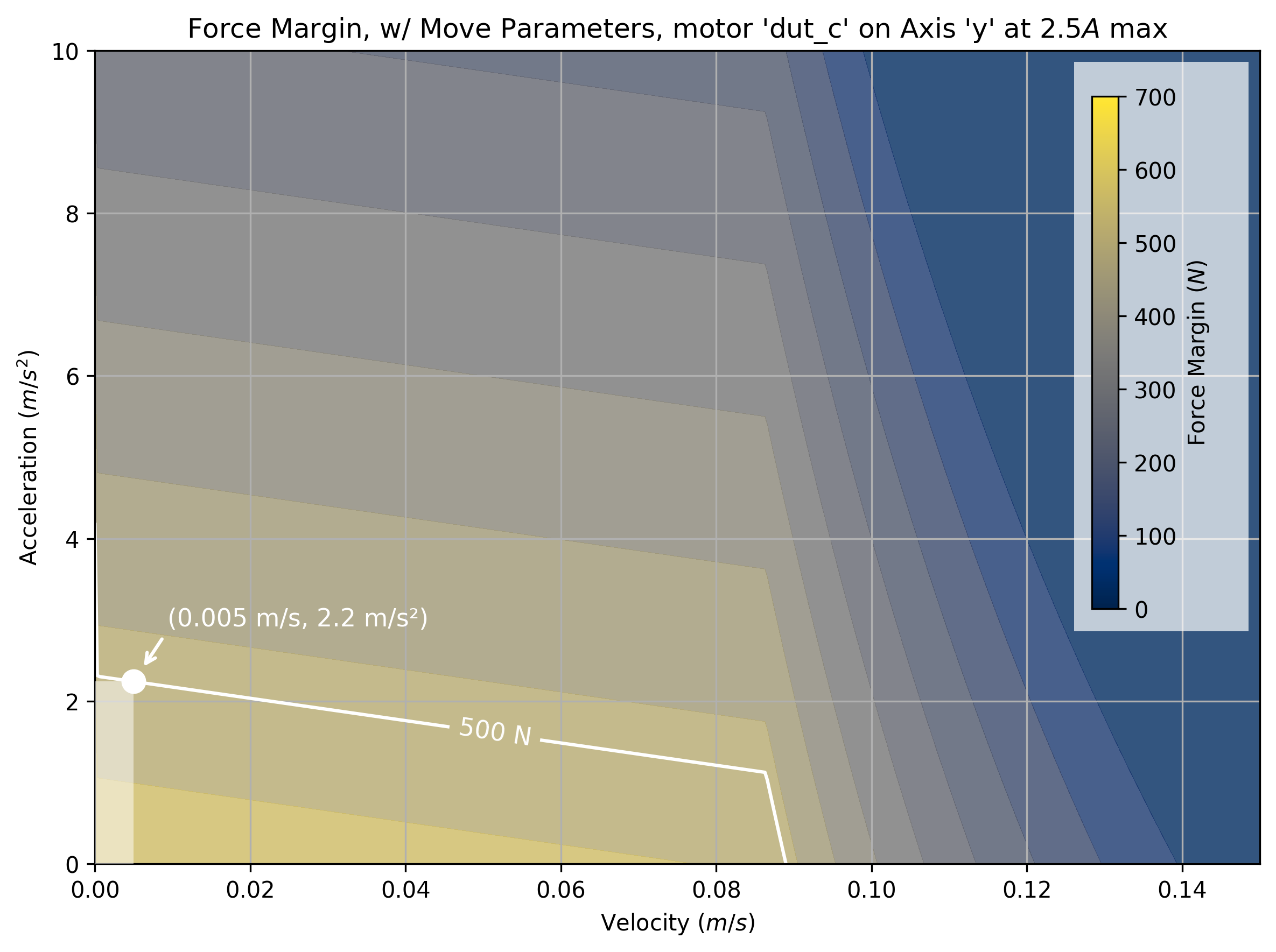 The tool takes a maximum current saturation parameter, and a generates a force margin (maximum available force from the motor, less forces taken up by motion) across a grid of velocities and accelerations.