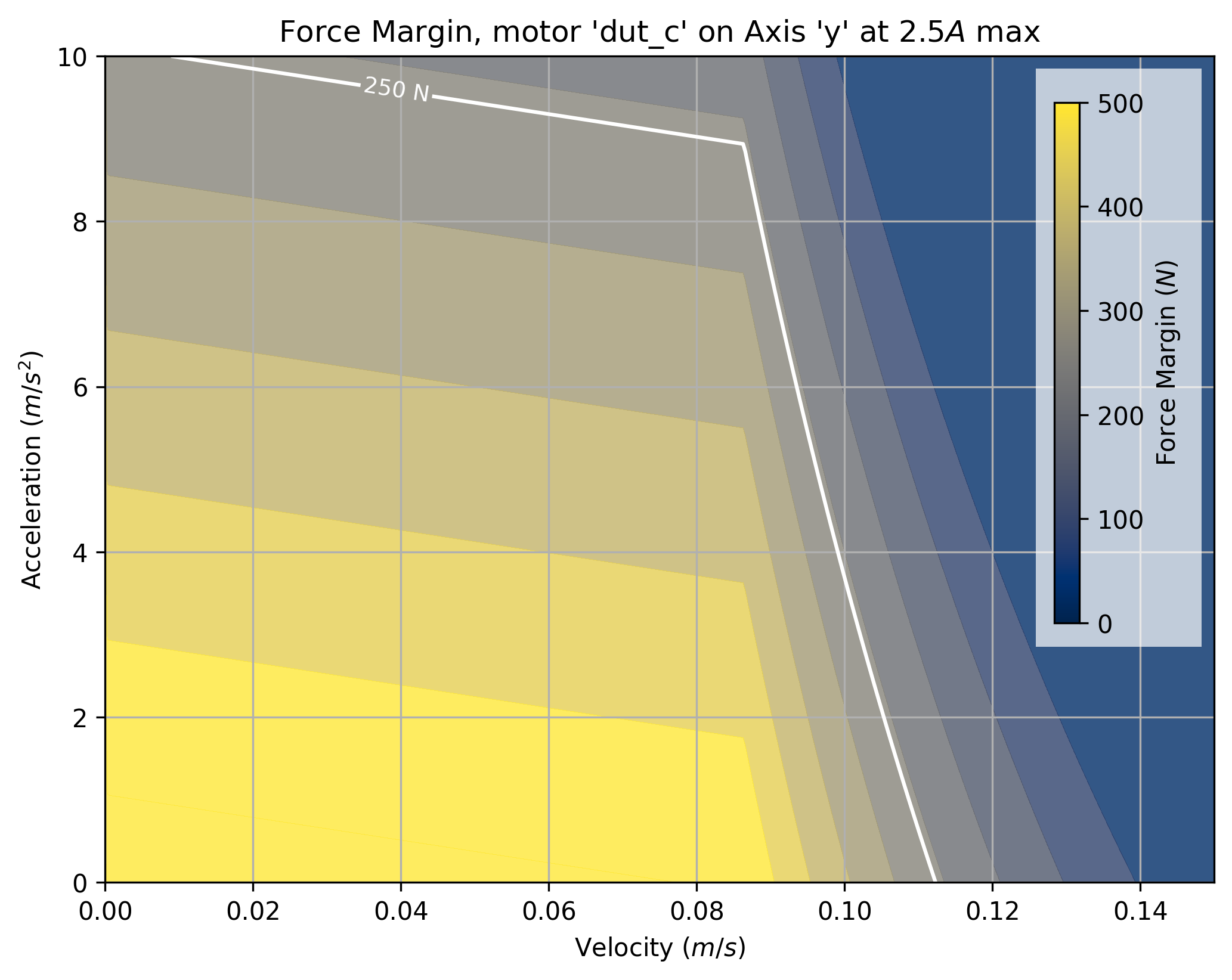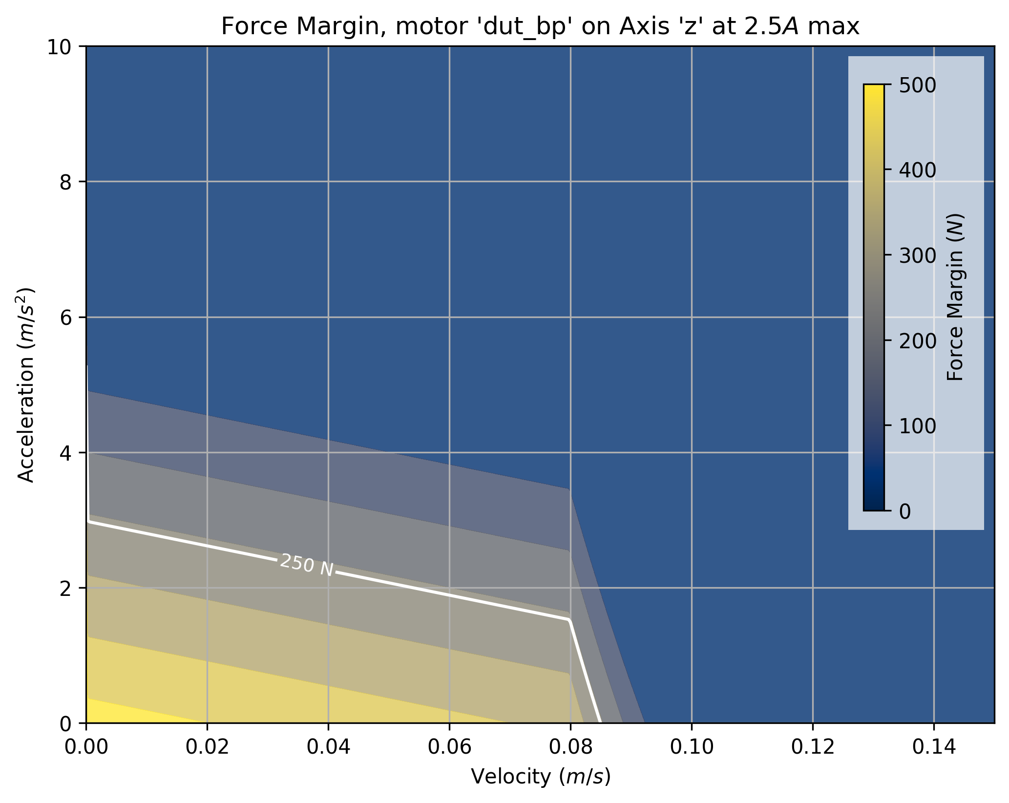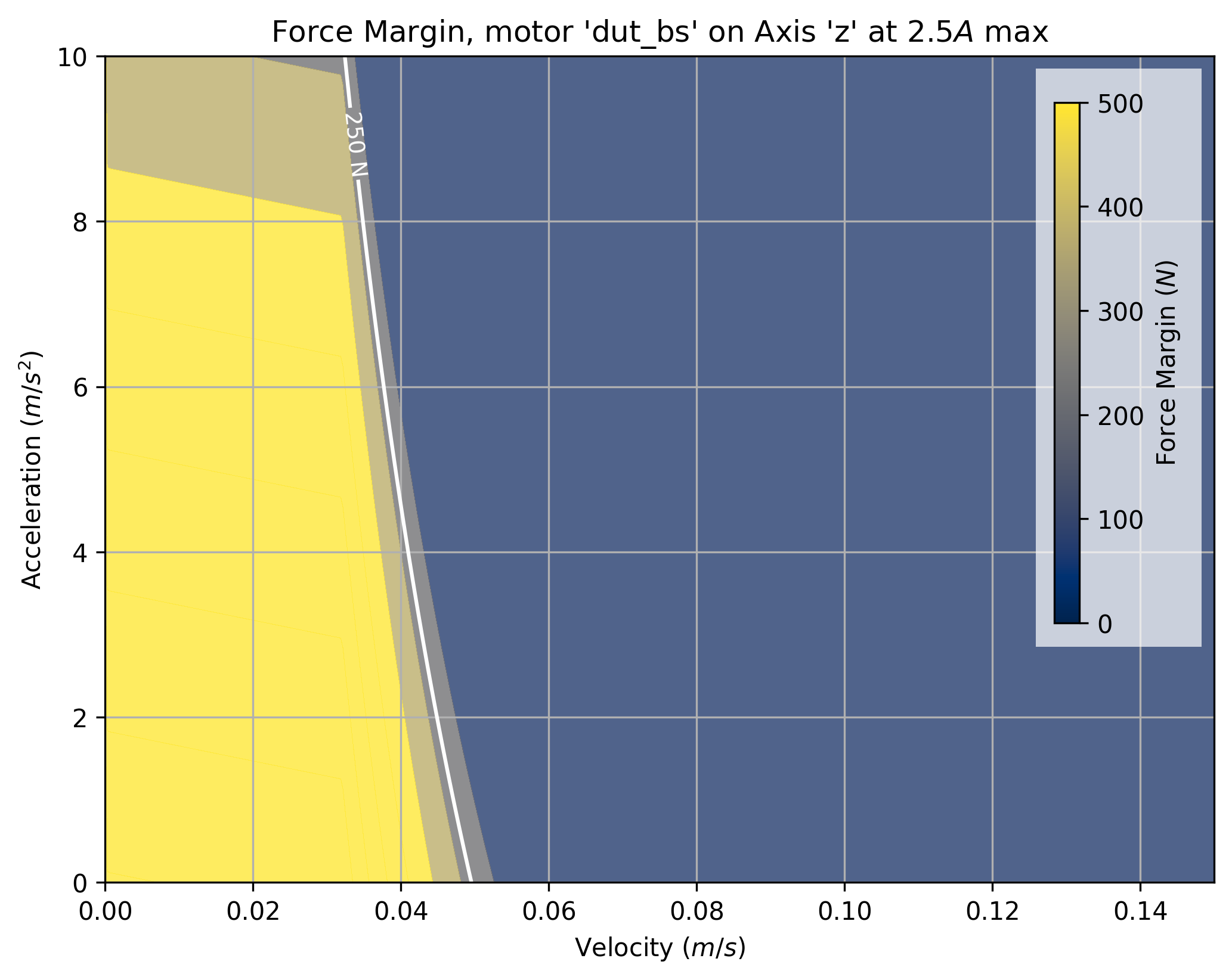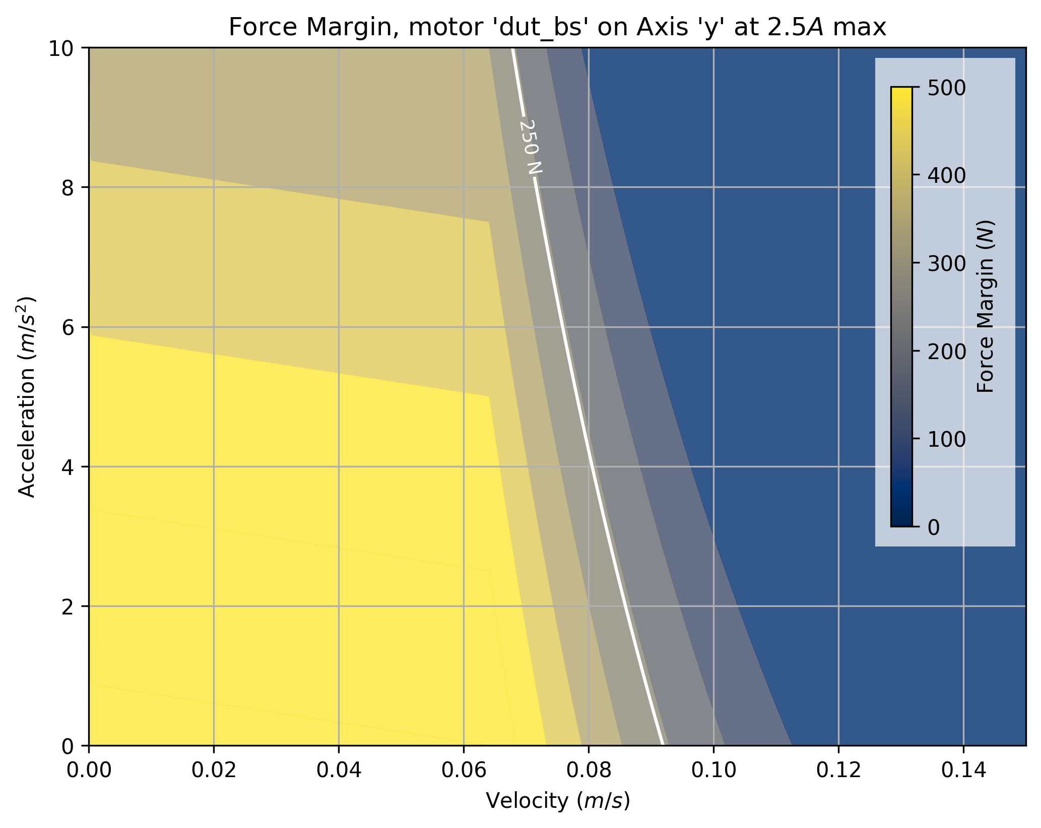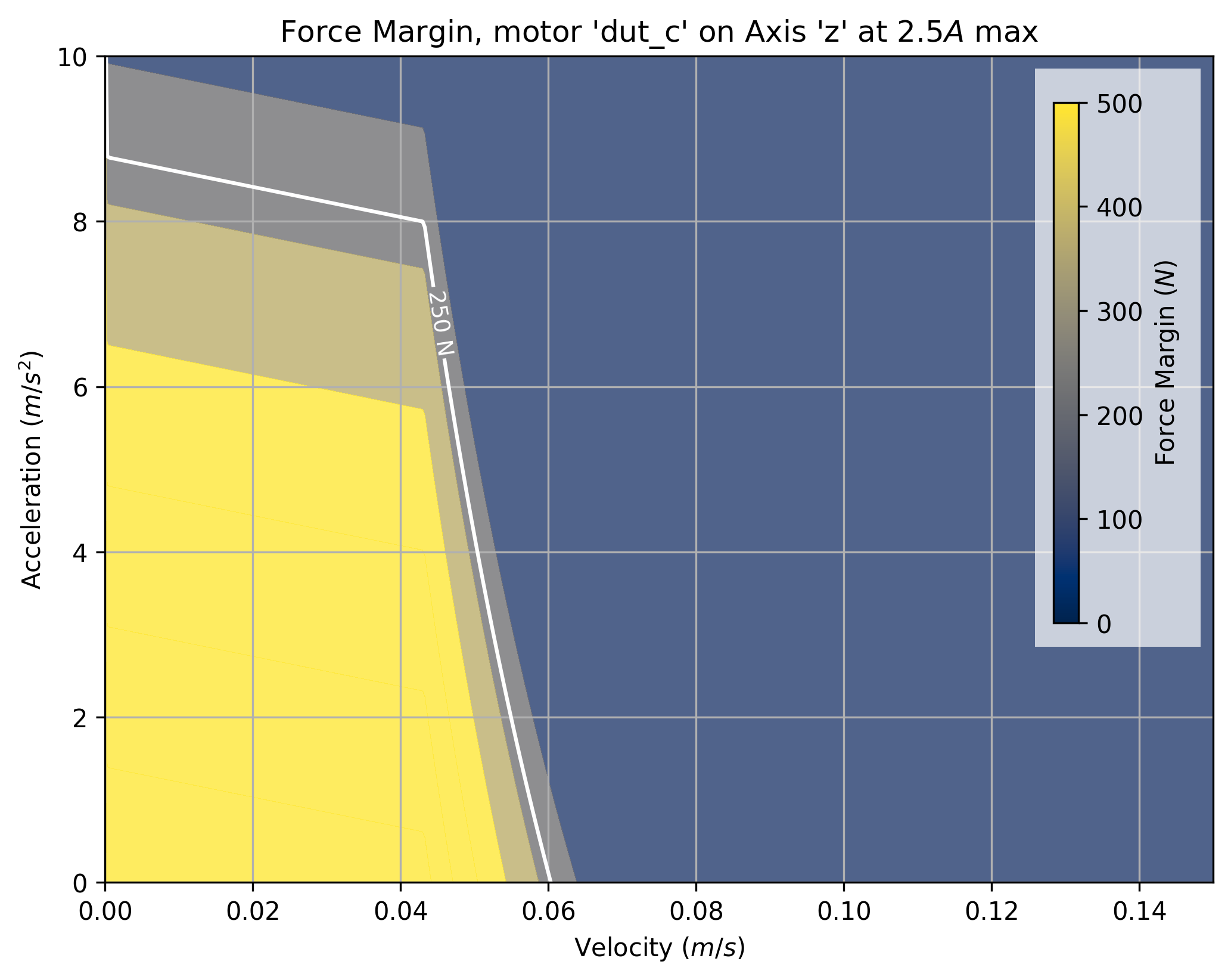 The tool takes a maximum current saturation parameter, and a generates a force margin (maximum available force from the motor, less forces taken up by motion) across a grid of velocities and accelerations.