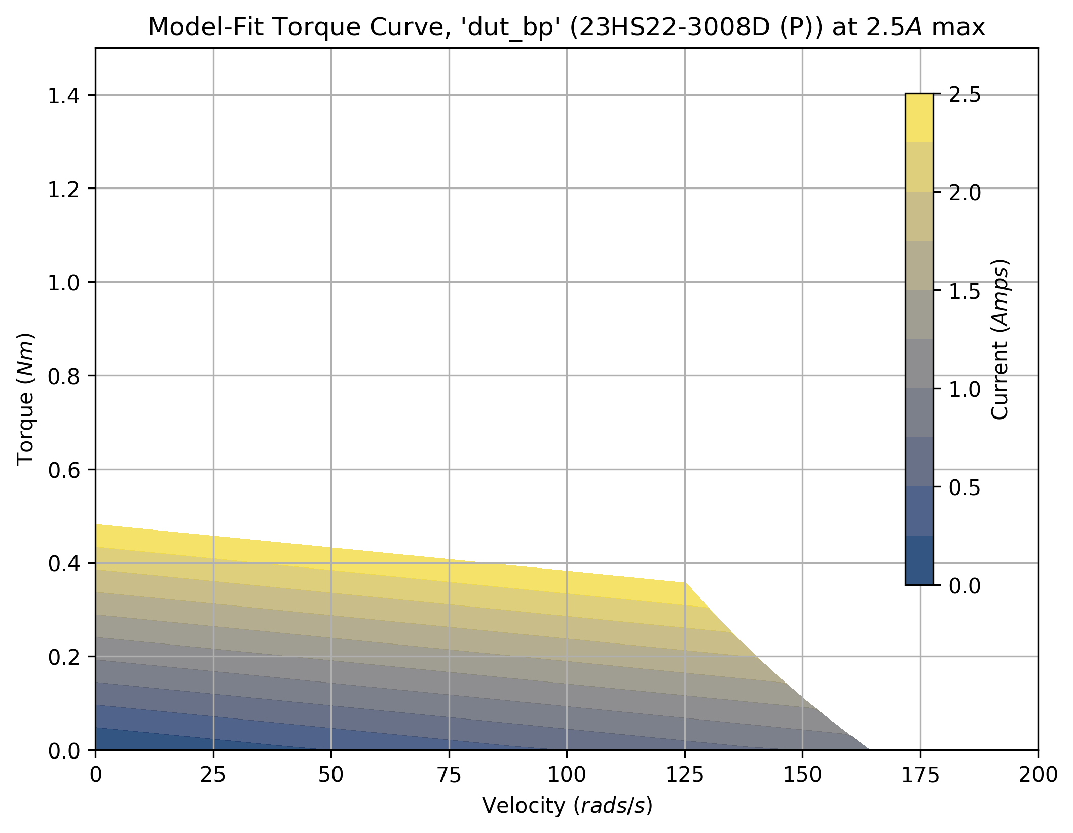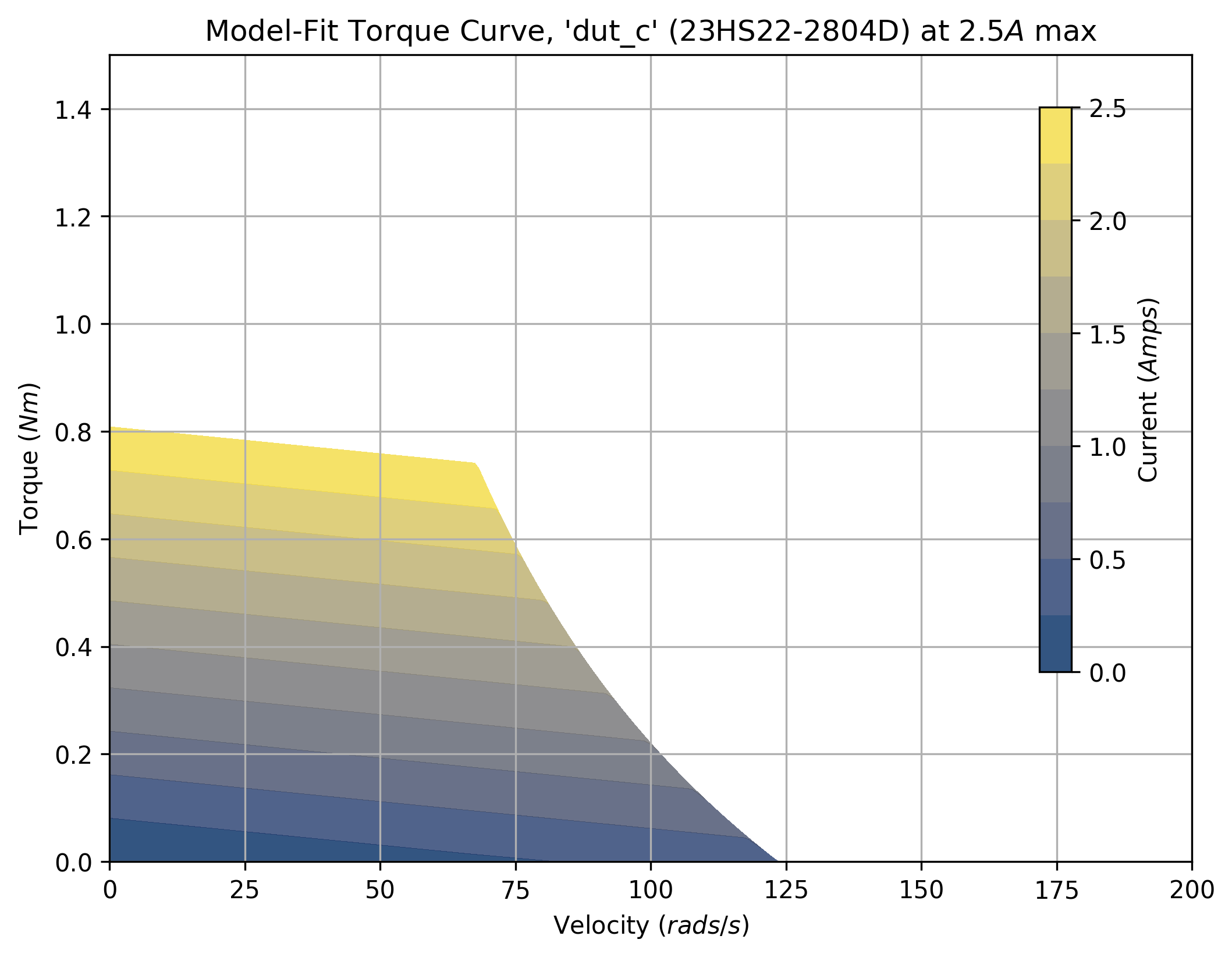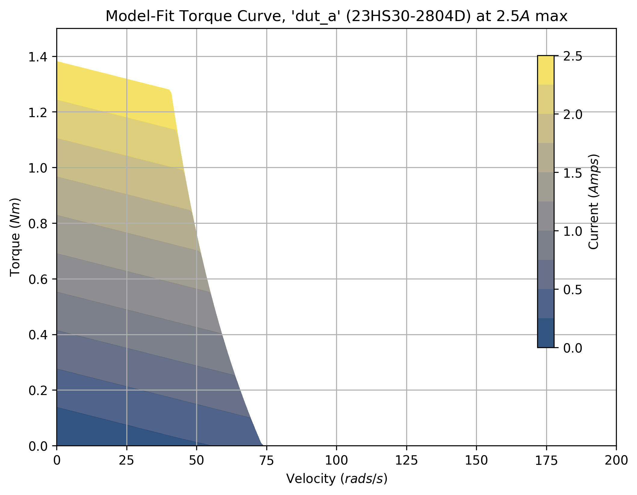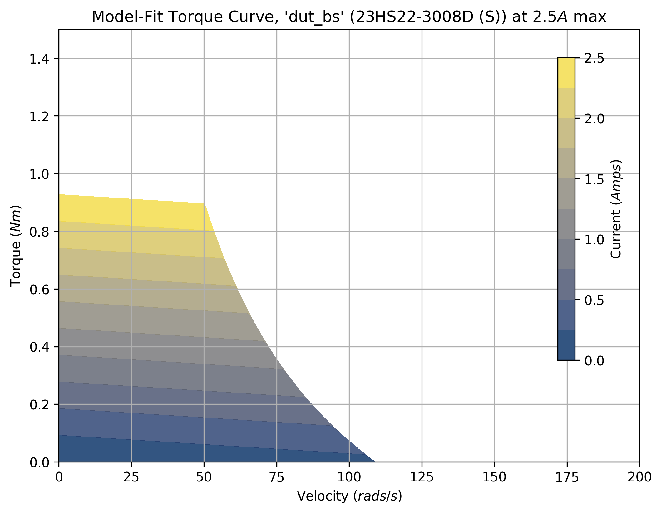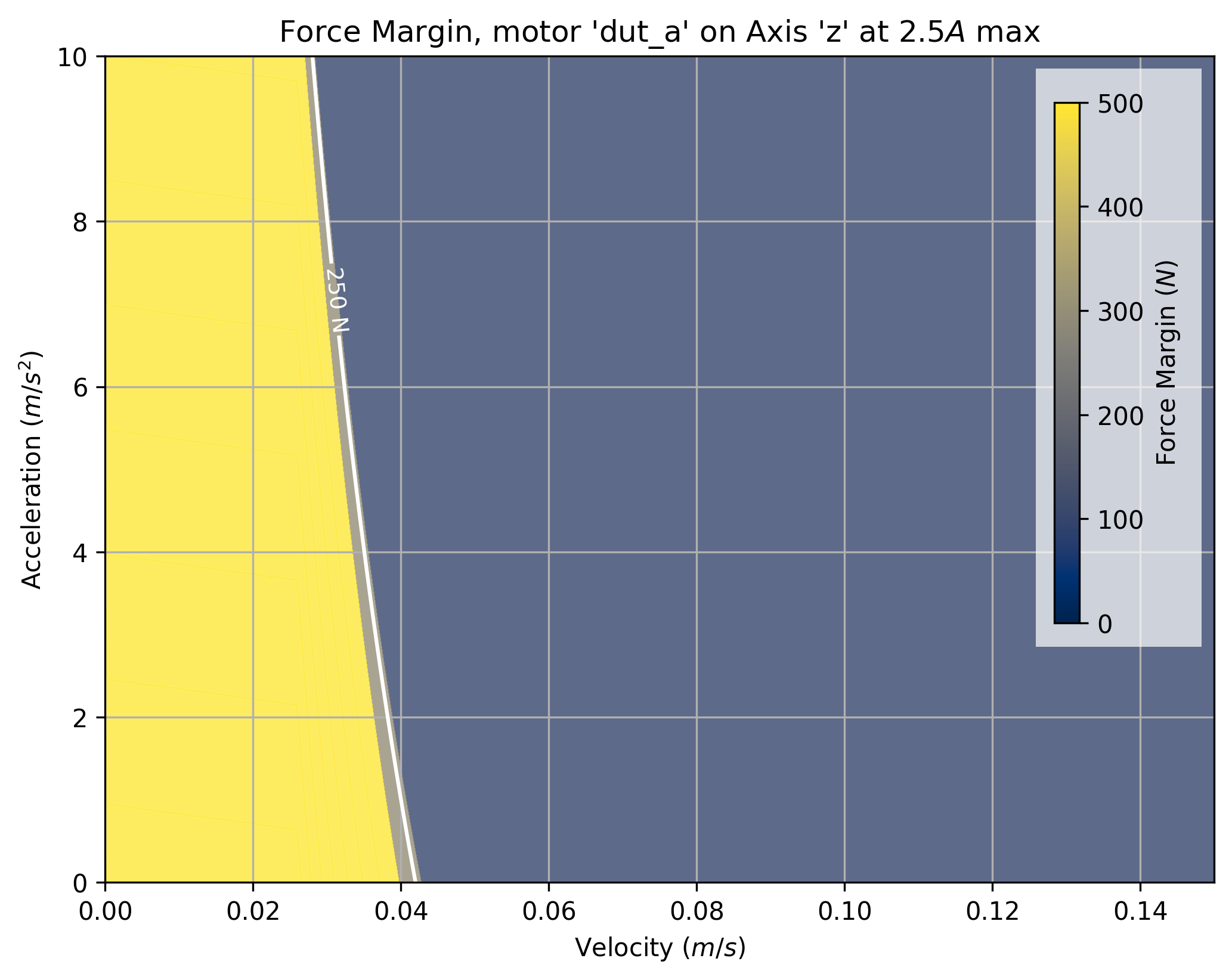 The tool takes a maximum current saturation parameter, and a generates a force margin (maximum available force from the motor, less forces taken up by motion) across a grid of velocities and accelerations.