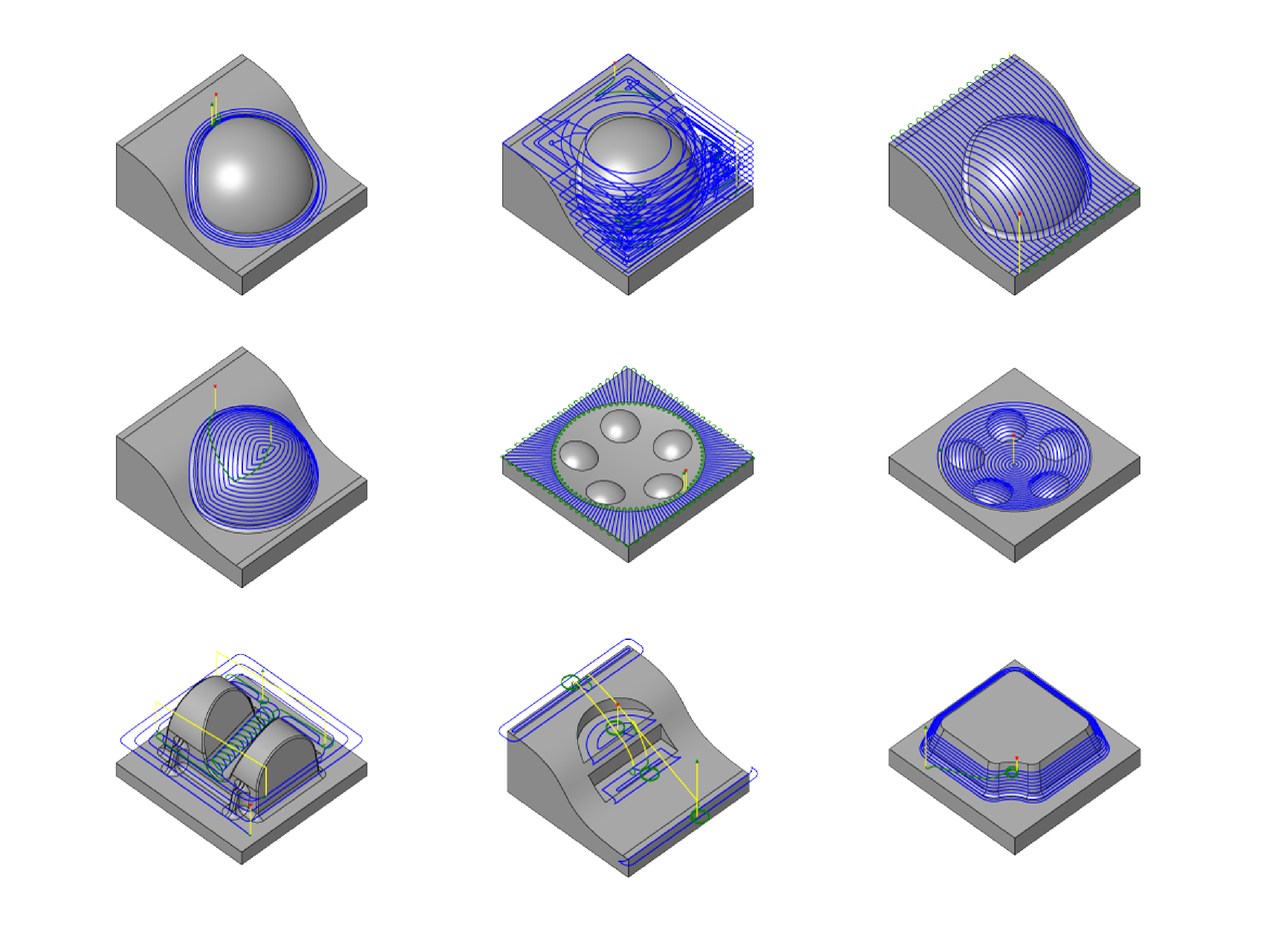 CAM for 3D Printing (aka ‘slicing,’ Section 6.2) is much simpler than CNC Machining because each job is effectively one operation: slice into layers, produce perimeters and then infill for each layer. That is, same basic geometric algorithms can be applied to just about every different part. A machining job can include many (tens or hundreds) of different path planning strategies for different geometric features, each selected manually. I show a selection of these strategies in Figure 7.3.