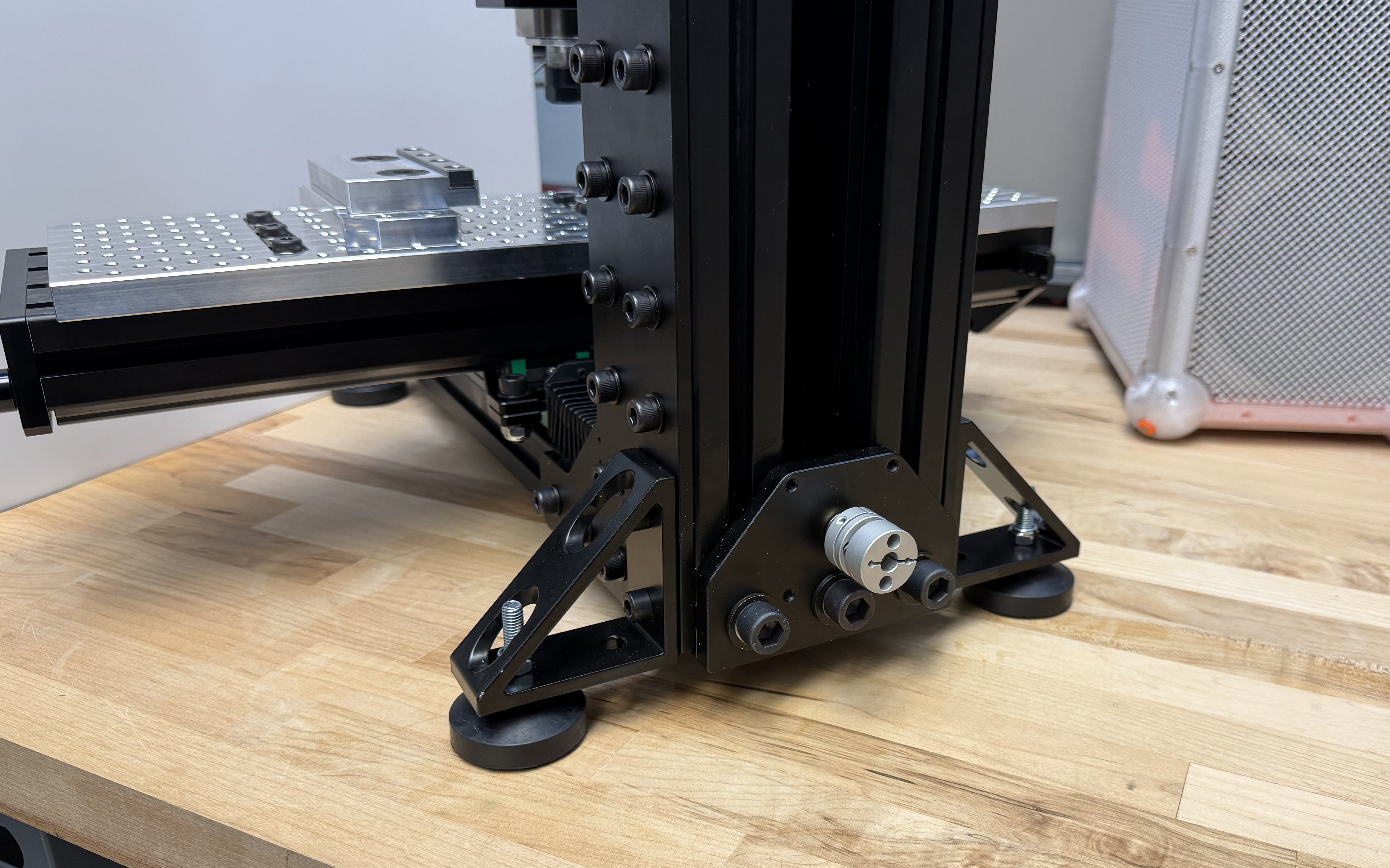 This process also led to the selection of dramatically improved motion parameters over the manufacturer’s recommended settings: 2x (xy axes) and 3x (z axis) increase in top speeds and 8x (xy axes) and 16x (z axis) increases in acceleration. The manufacturer selected motors have much higher rated holding torque over my selections, but a torque curve for their motor seems to be unavailable, meaning that they may have selected motors based on holding torque alone without analyzing performance at high speeds. Their selections surely also encode many of their heuristics, so we may simply differ in that regard. They also deploy open-loop steppers, where loss of a single step can be extremely troublesome, whereas our closed-loop motors allow us to push closer to the machine’s limits without worrying about occasional hiccups. That is to say, their margins to machine performance are probably much larger.
