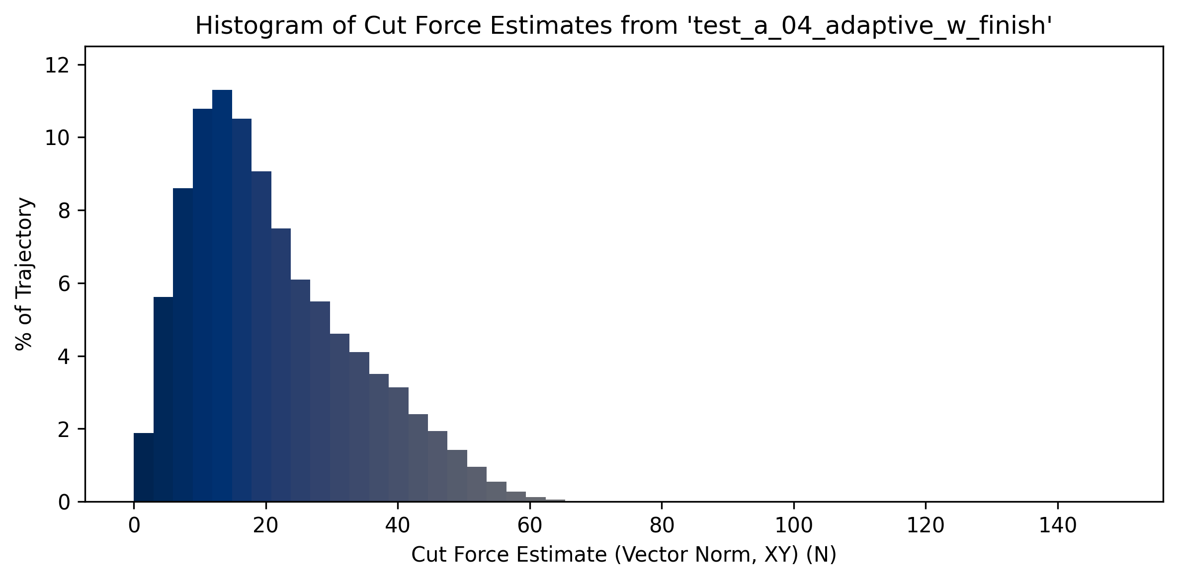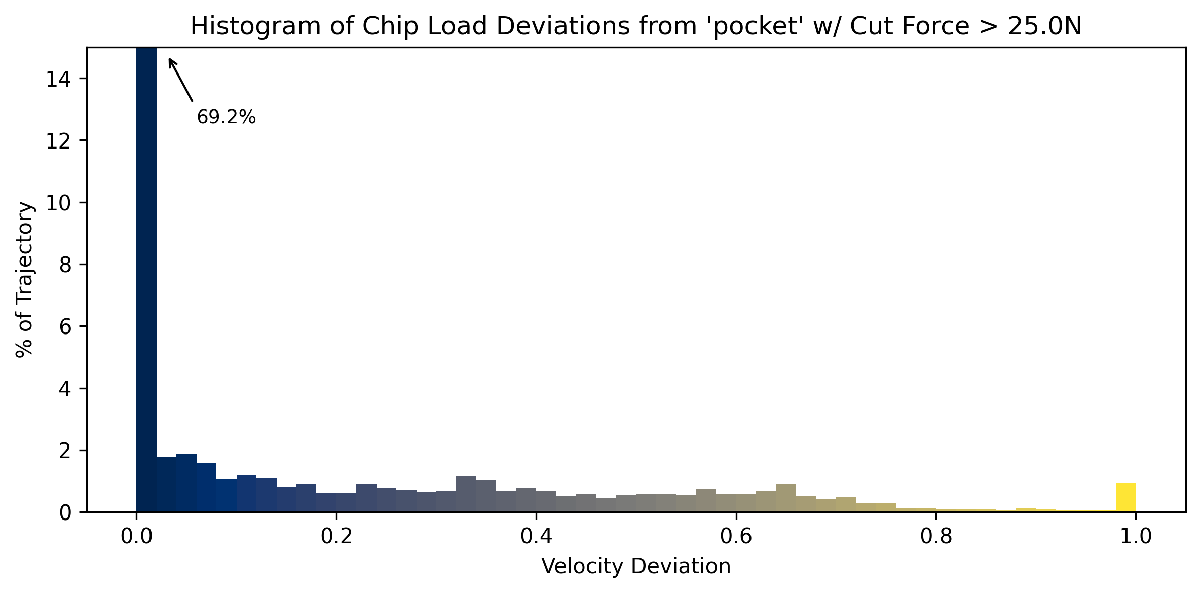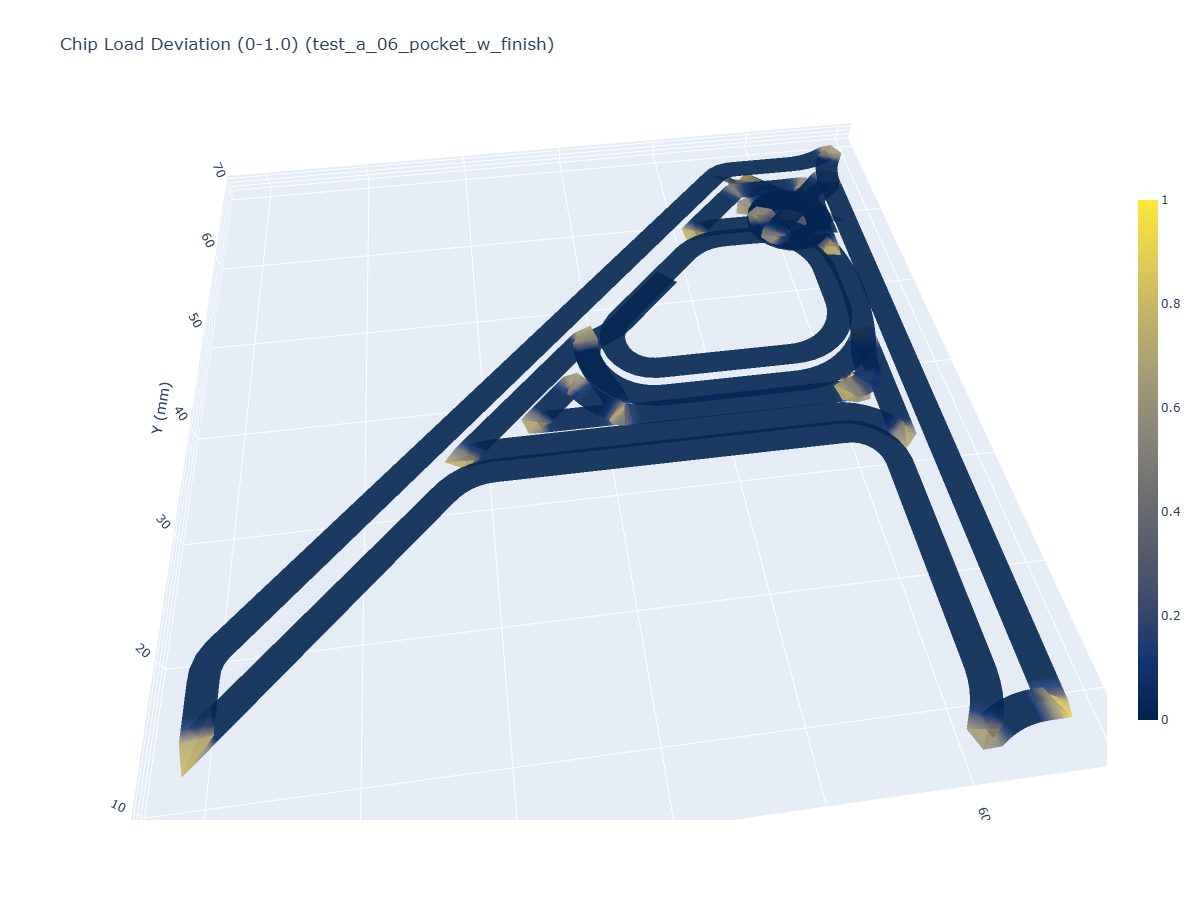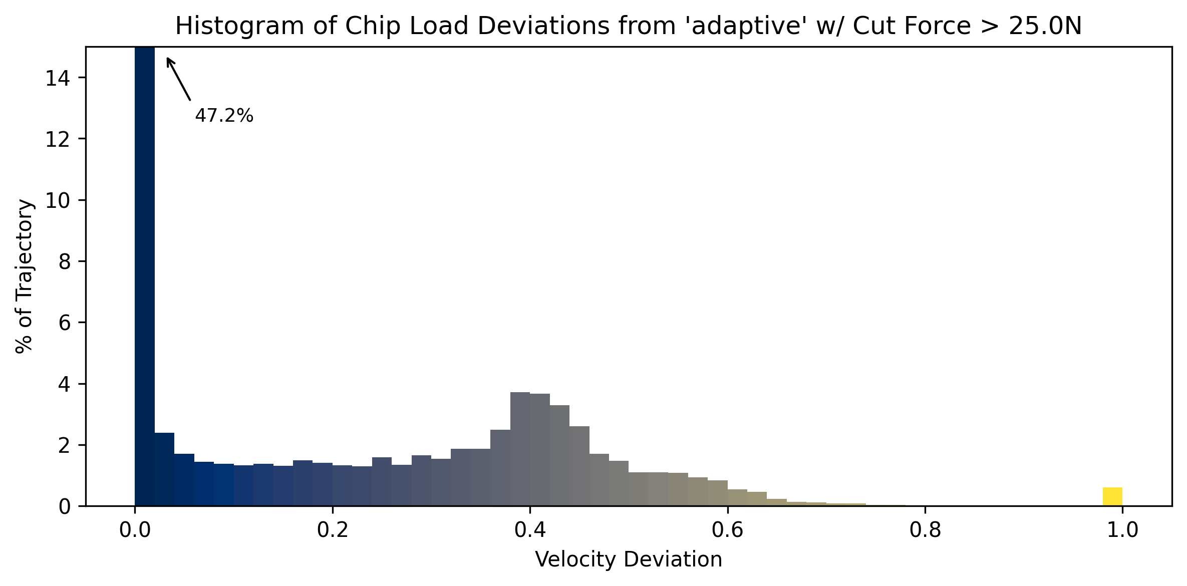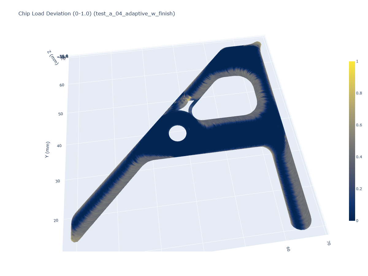 The differences in the distributions above is subtle, but shows us that about half of the adaptive path’s worst deviations (around \(0.4\)) take place in areas of low engagement / low cut force. Finally I will note that the worst deviations in the adaptive path (where there are many corners, but most with some radius) are smaller than the worst in the pocket toolpath (where there are less corners overall, but those corners have sharper angles).