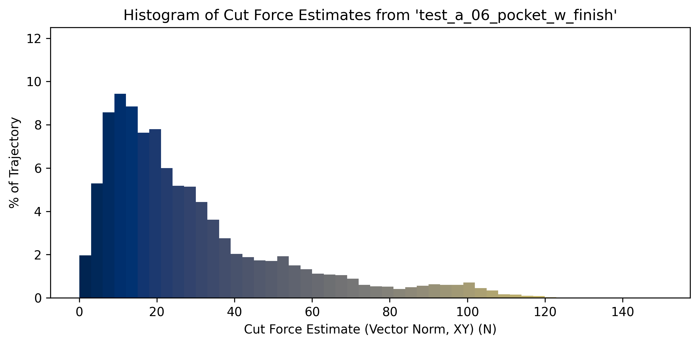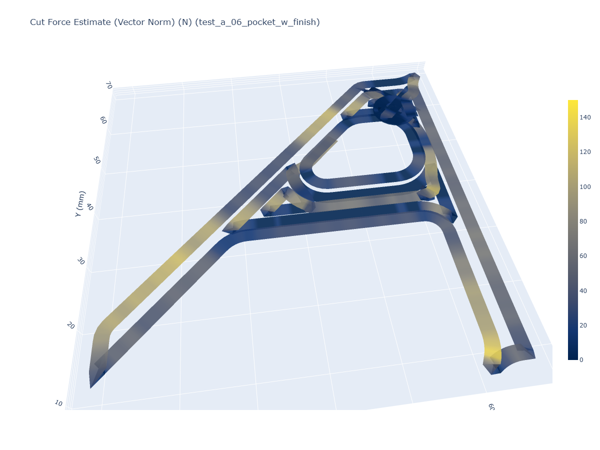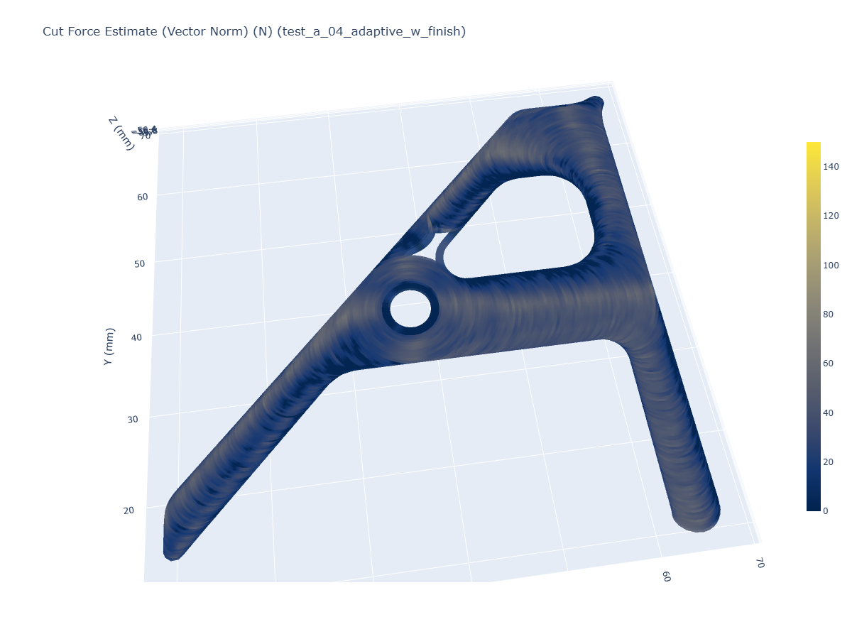 Comparing cut force estimates in both toolpaths provides some more insight as to the strengths and weaknesses of either strategy. In the histograms above, we can see that the adaptive path uses overall lower cut force, and has a much smaller maximum force (around \(60N\)) than the pocket (~ \(115N\)). The 3D plot shows us where these hot-spots are: in the regions where the pocket toolpath must slot, i.e. cut with the full width of the tool. This is the primary weakness of traditional toolpaths: slotting is inevitable in parts with narrow channels to cut, which leads to high variability in cutting loads during machining. Slots also present chip evacuation issues, as the cutter has limited space around it to throw chips.