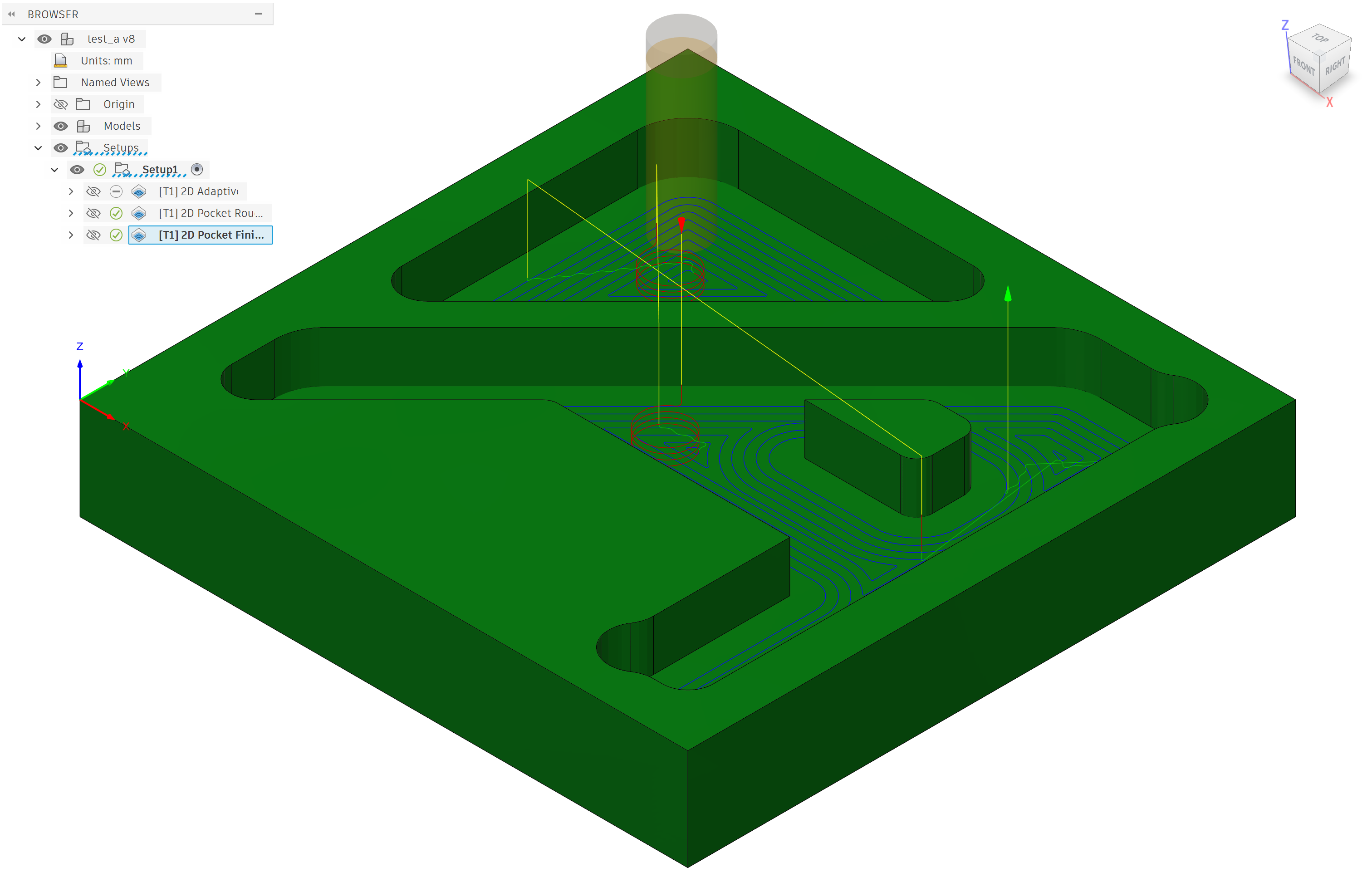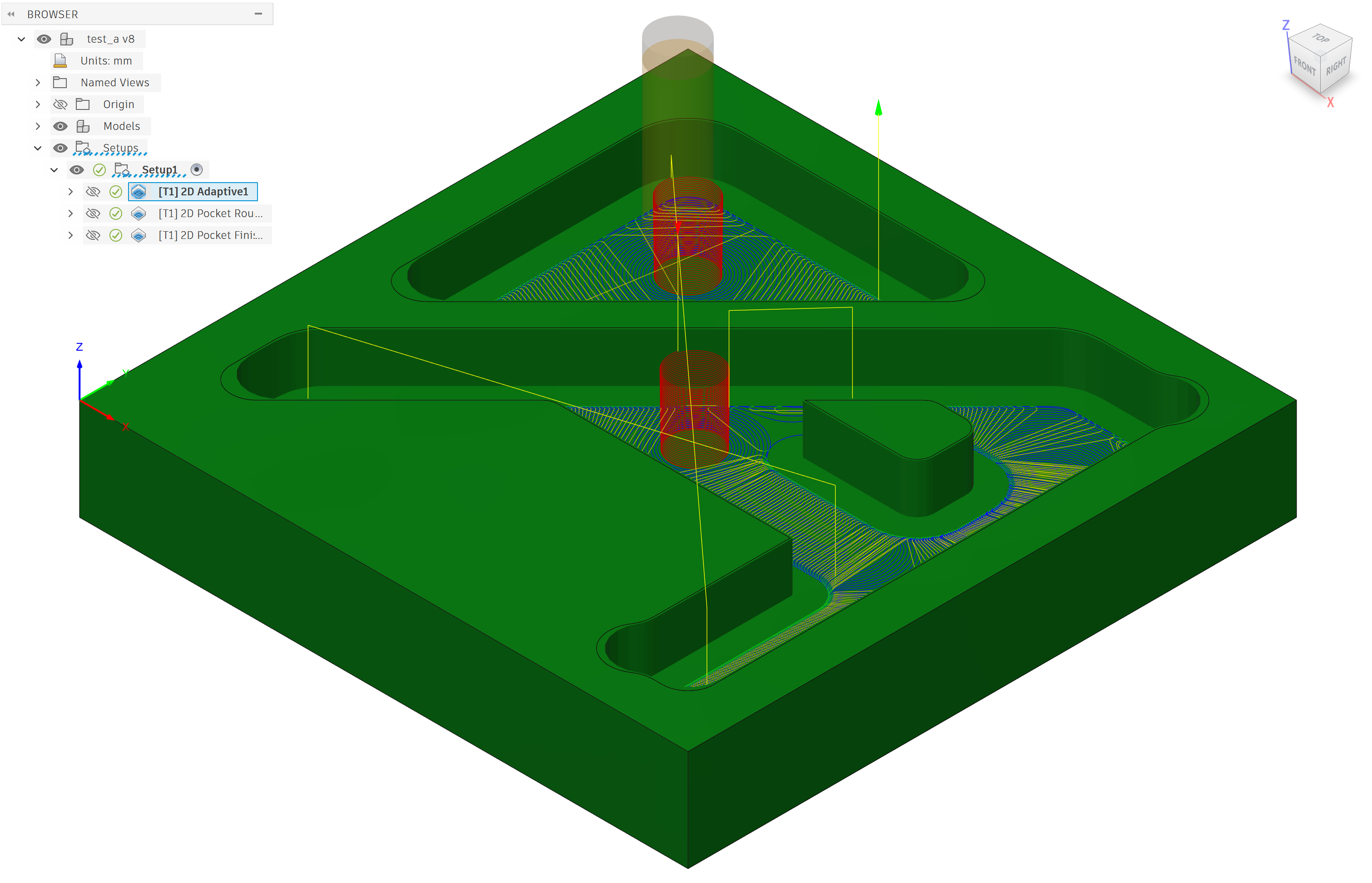 I modeled a small test piece, test_a, with two bosses at 1/4” depth each, to mill out of aluminum. The part is small, but I tried to include some common geometric features: small islands, both rounded and sharp corners, and dogbones, which are relieved sharp corners of roughly the same diameter as the cutting tool (bottom left and far right of each figure below).