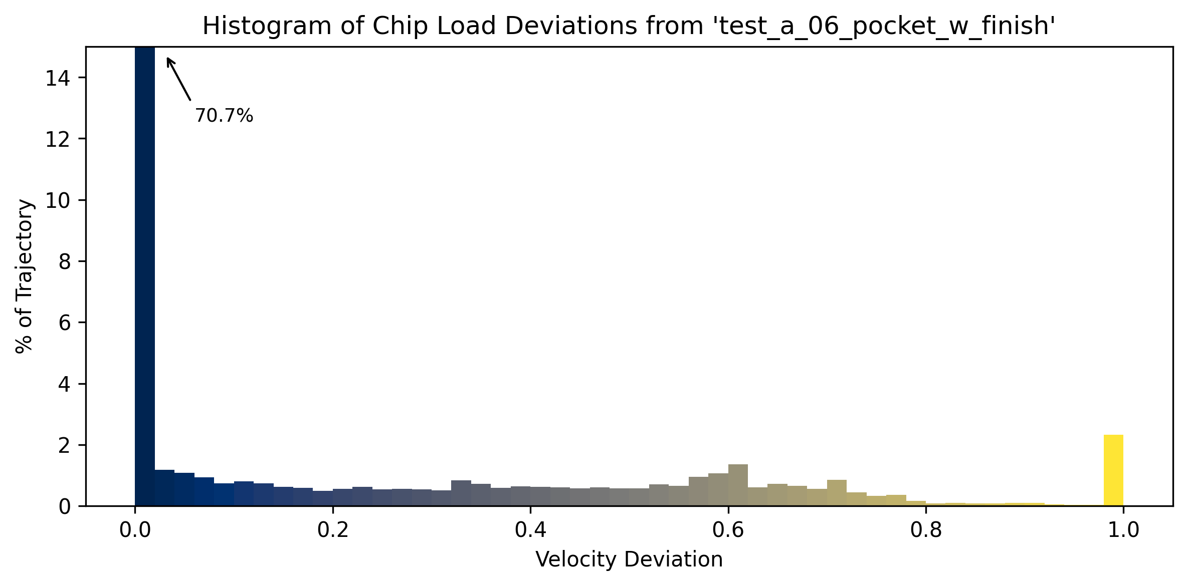 3D Plots allow careful inspection of toolpath components. For a broader look at the toolpath’s overall deviation from target rates, we can also produce histograms of this data.
